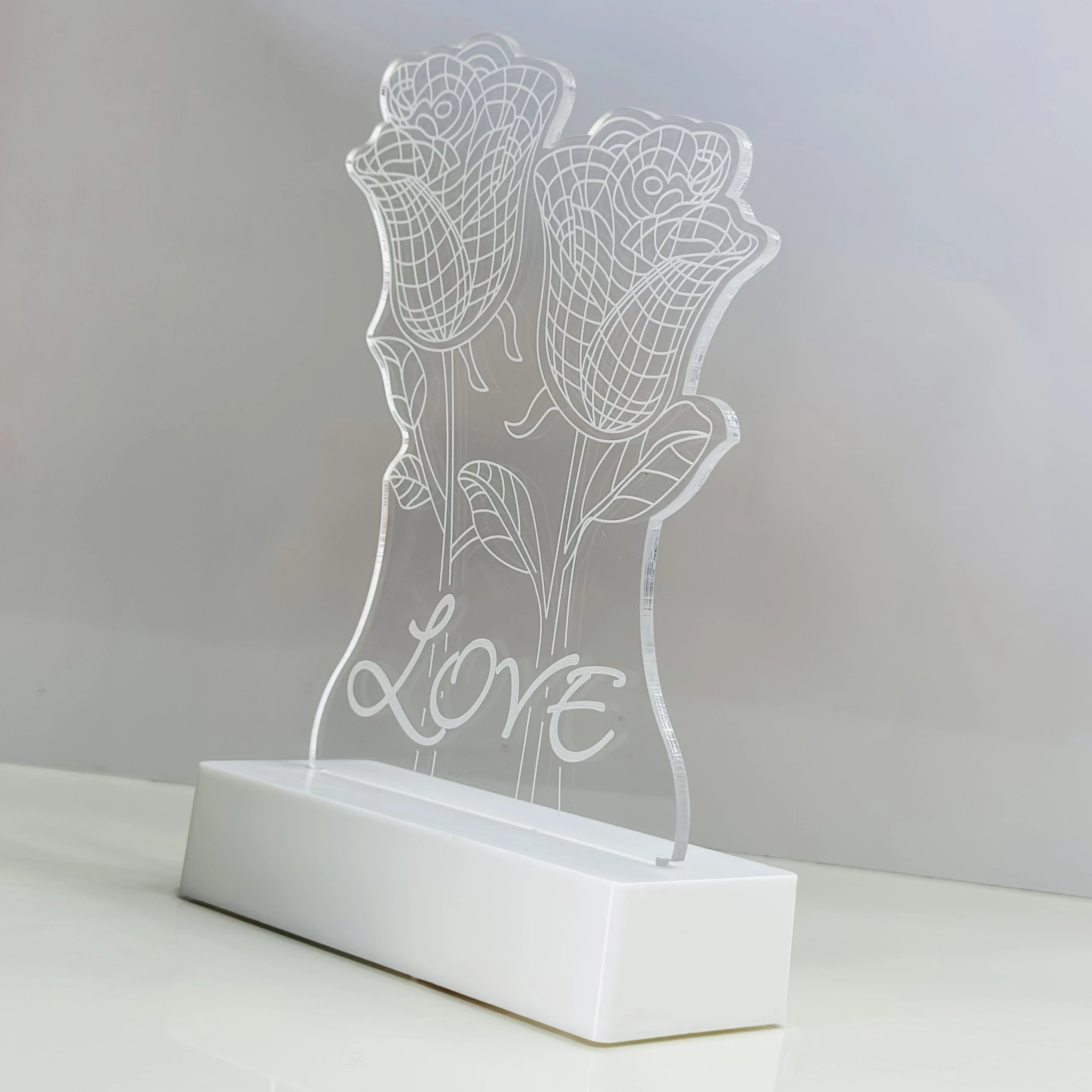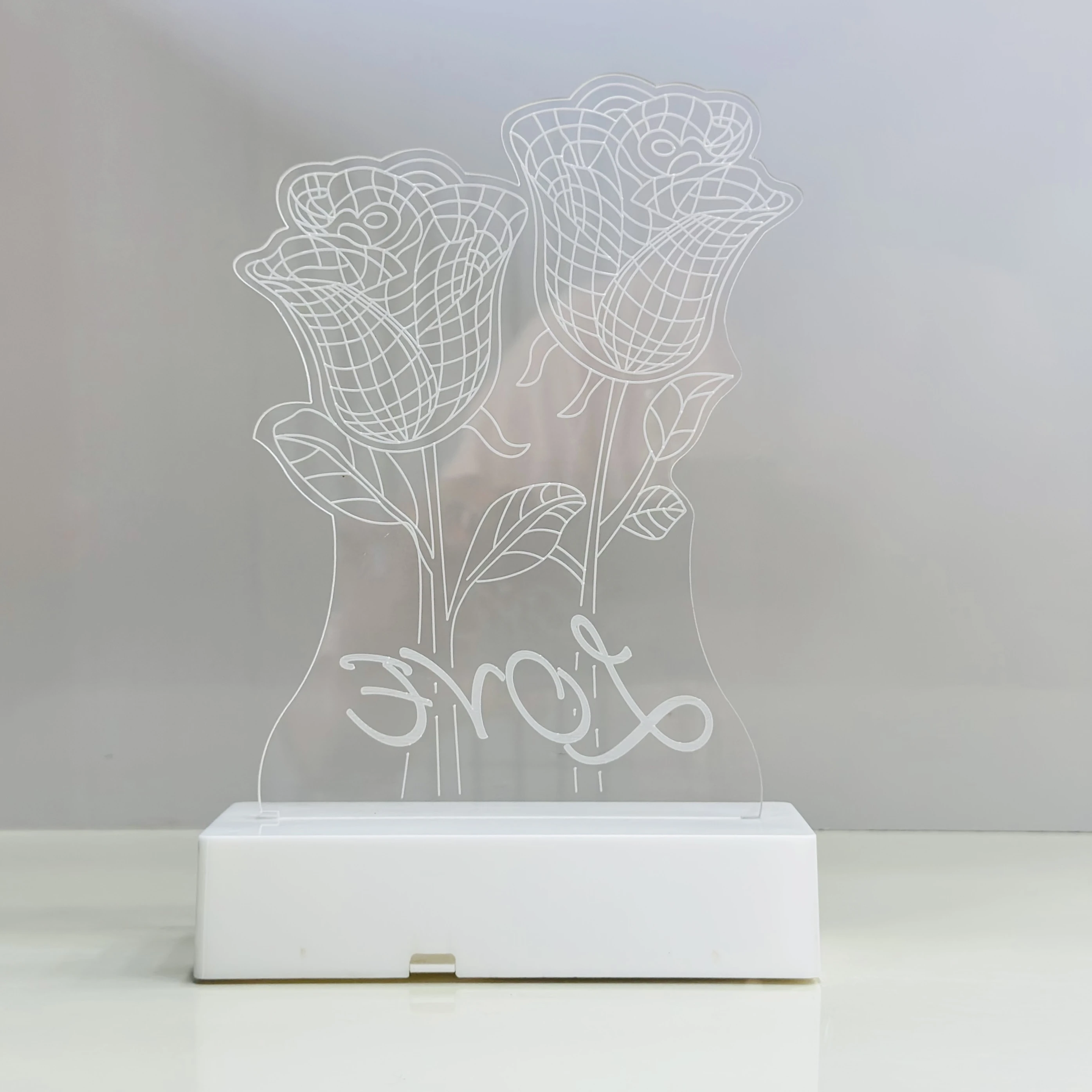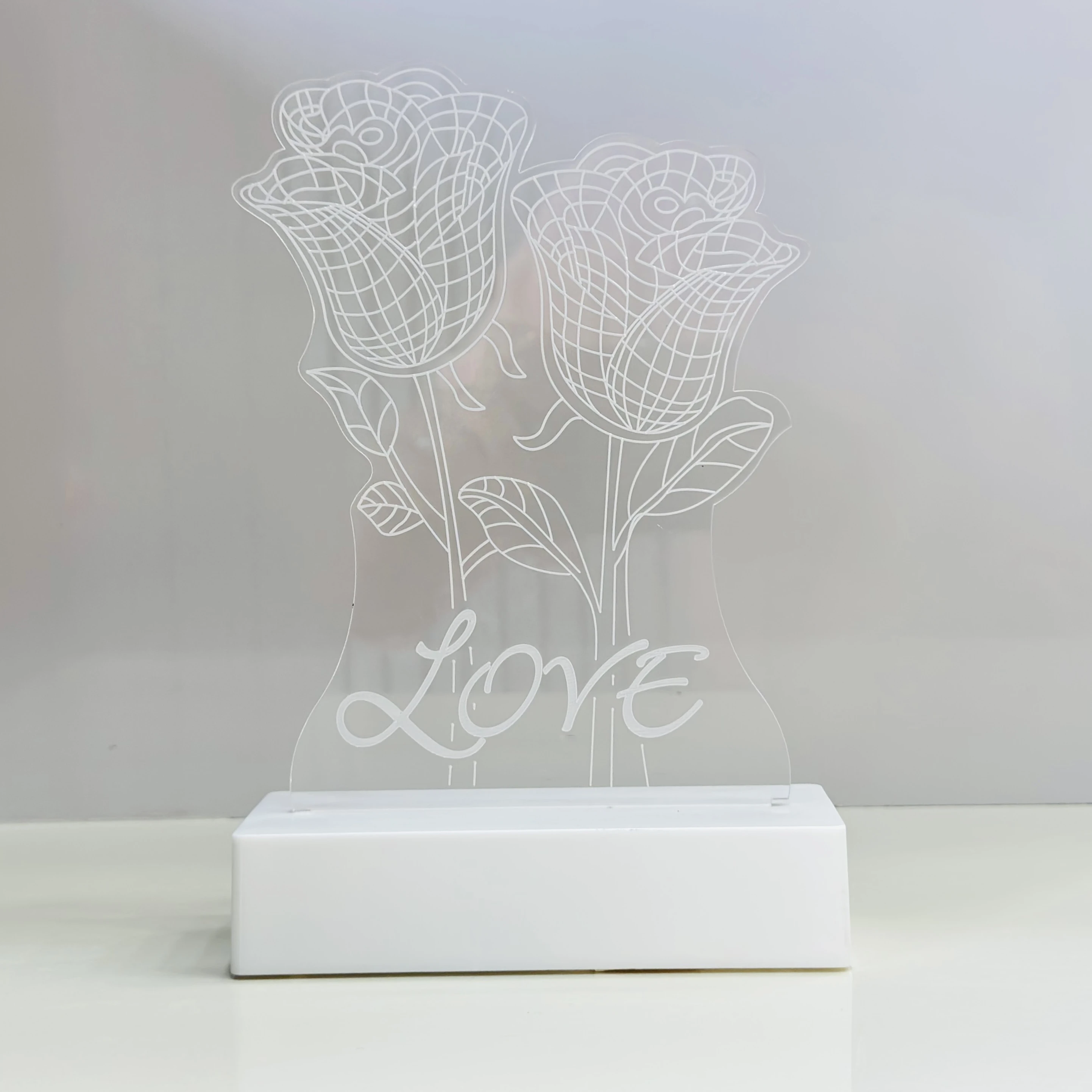 👉 Theme :- 3D illusion LED night lamp with a two-rose design and the word "LOVE" inscribed on it.
