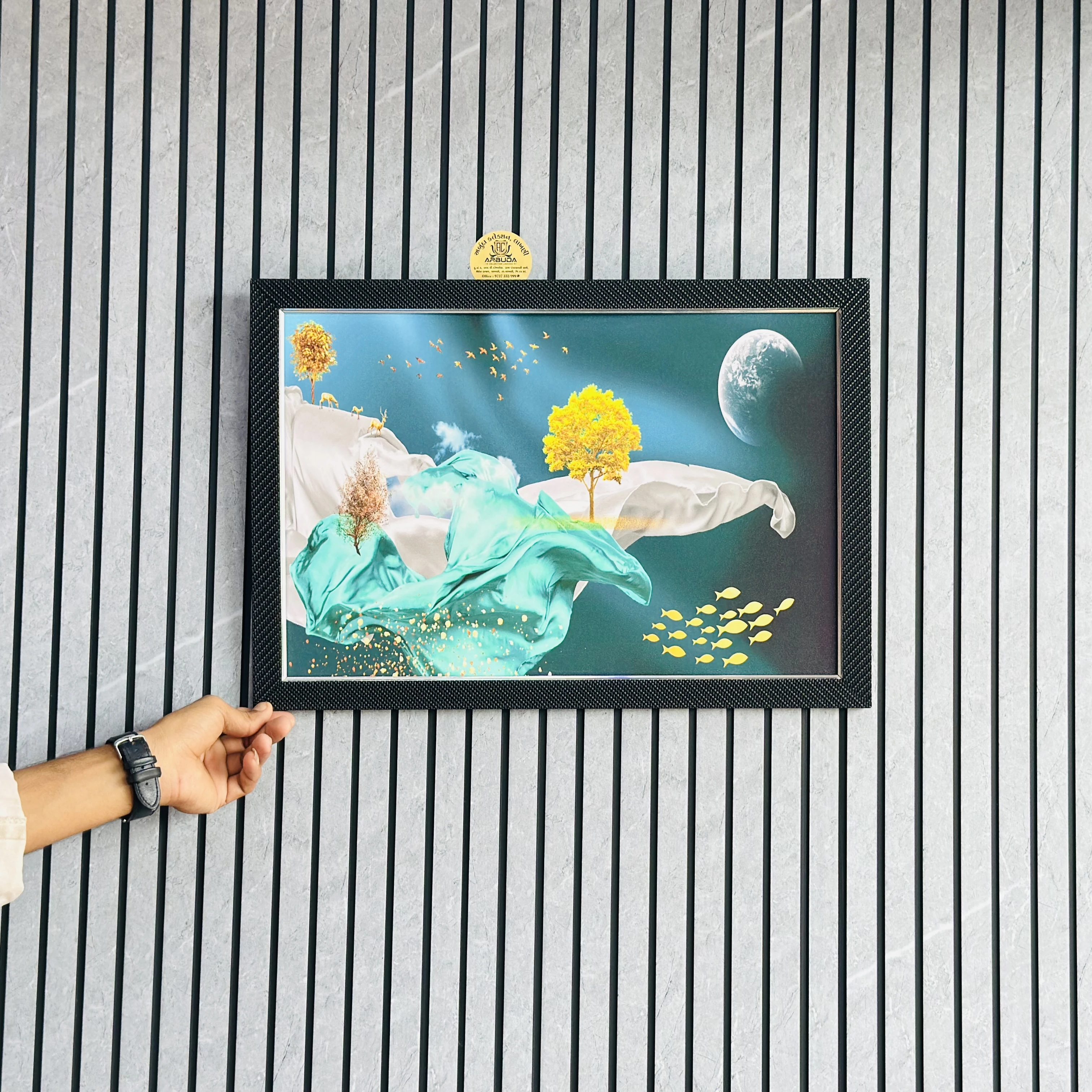 👉 Theme :- 3D ocean art wall frame featuring an underwater scene with yellow trees, swimming fish, and a moonlit backdrop.