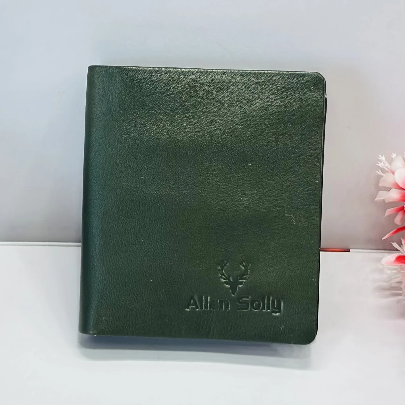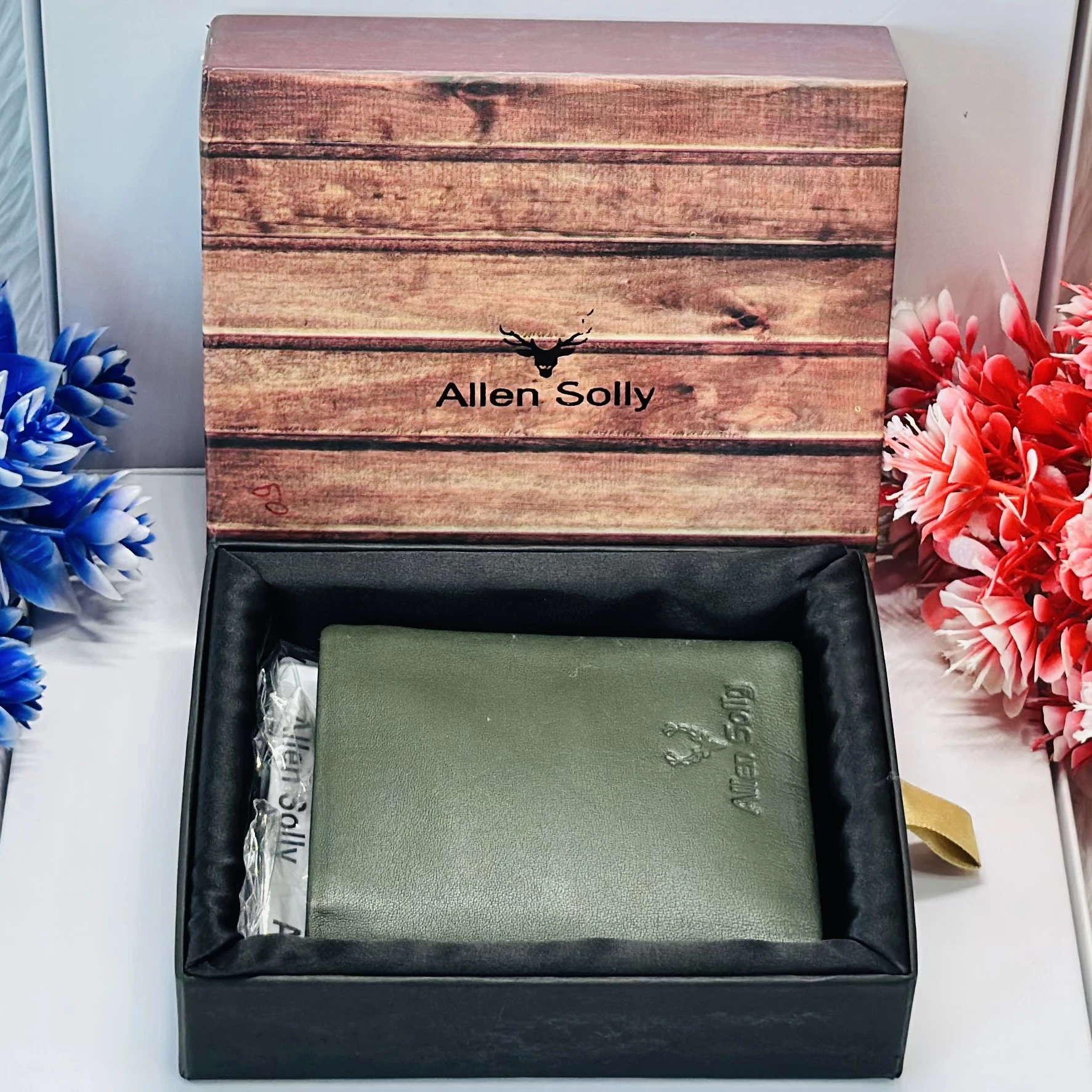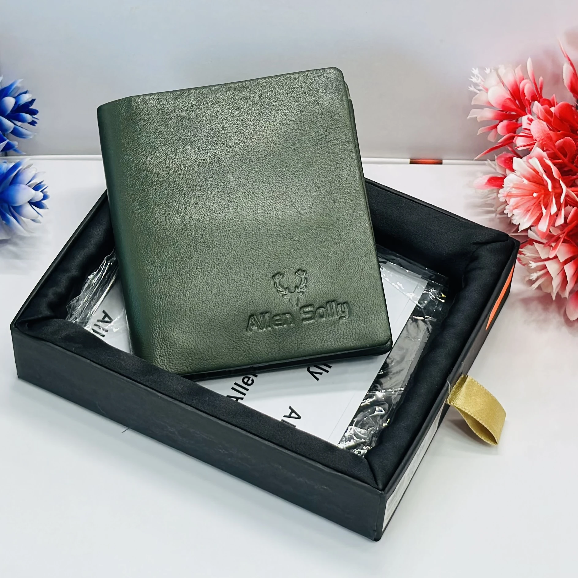 👉 Theme :- Allen Solly men's green leather bifold wallet presented in a gift box.