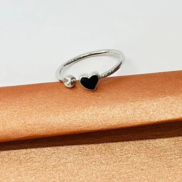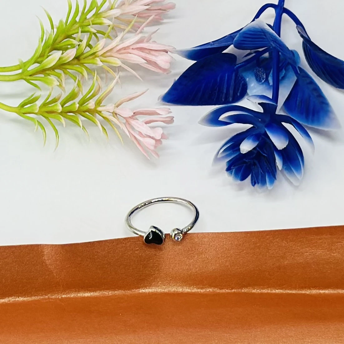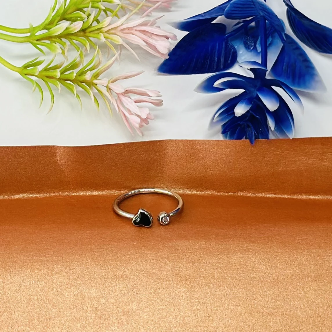 👉 Theme :- an adjustable silver-toned ring with a black heart and a clear stone accent.