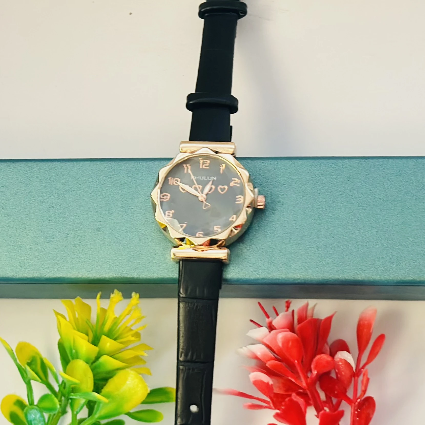 👉 Theme :- quartz analog watch with a black dial and black leather-look strap