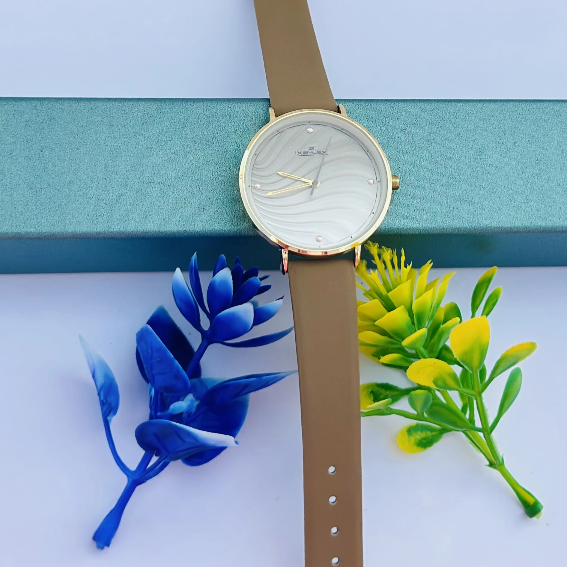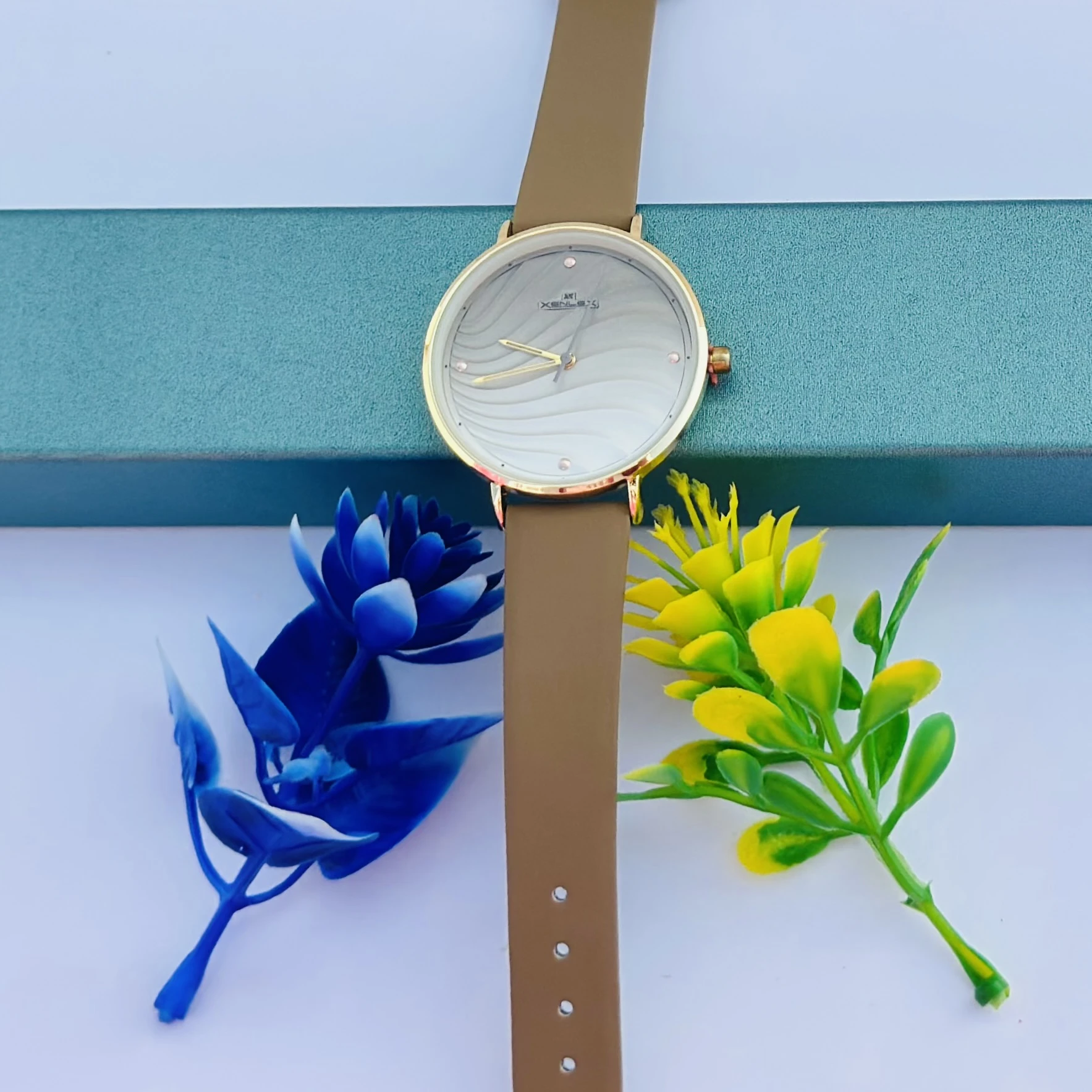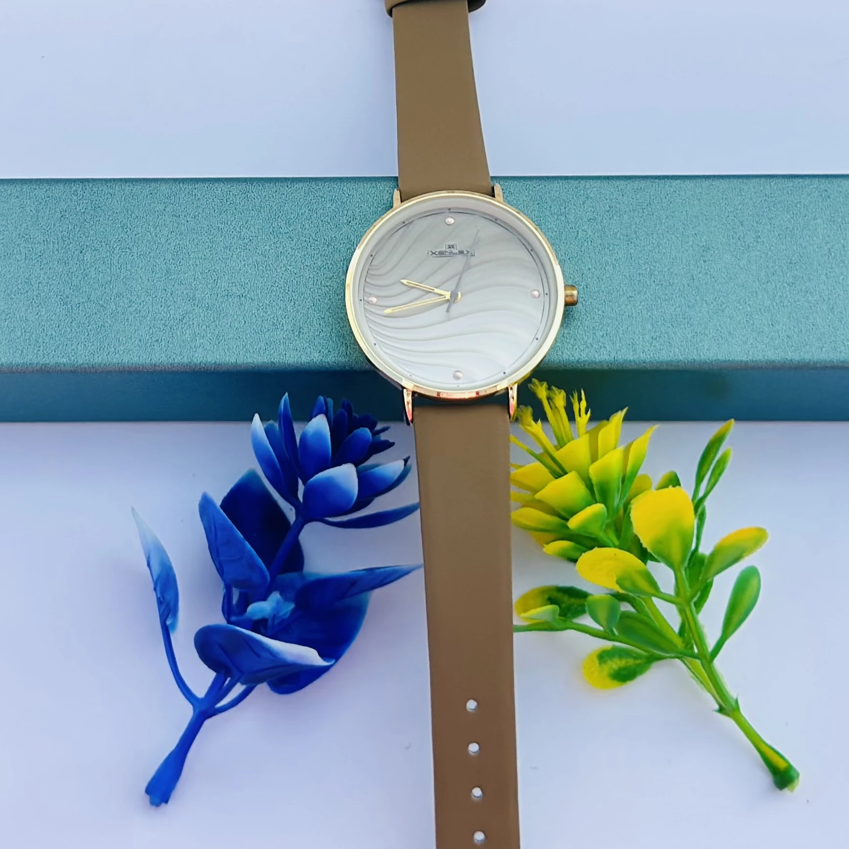 👉 Theme :- Analog watch for women with a purple gradient dial and pink leather strap.