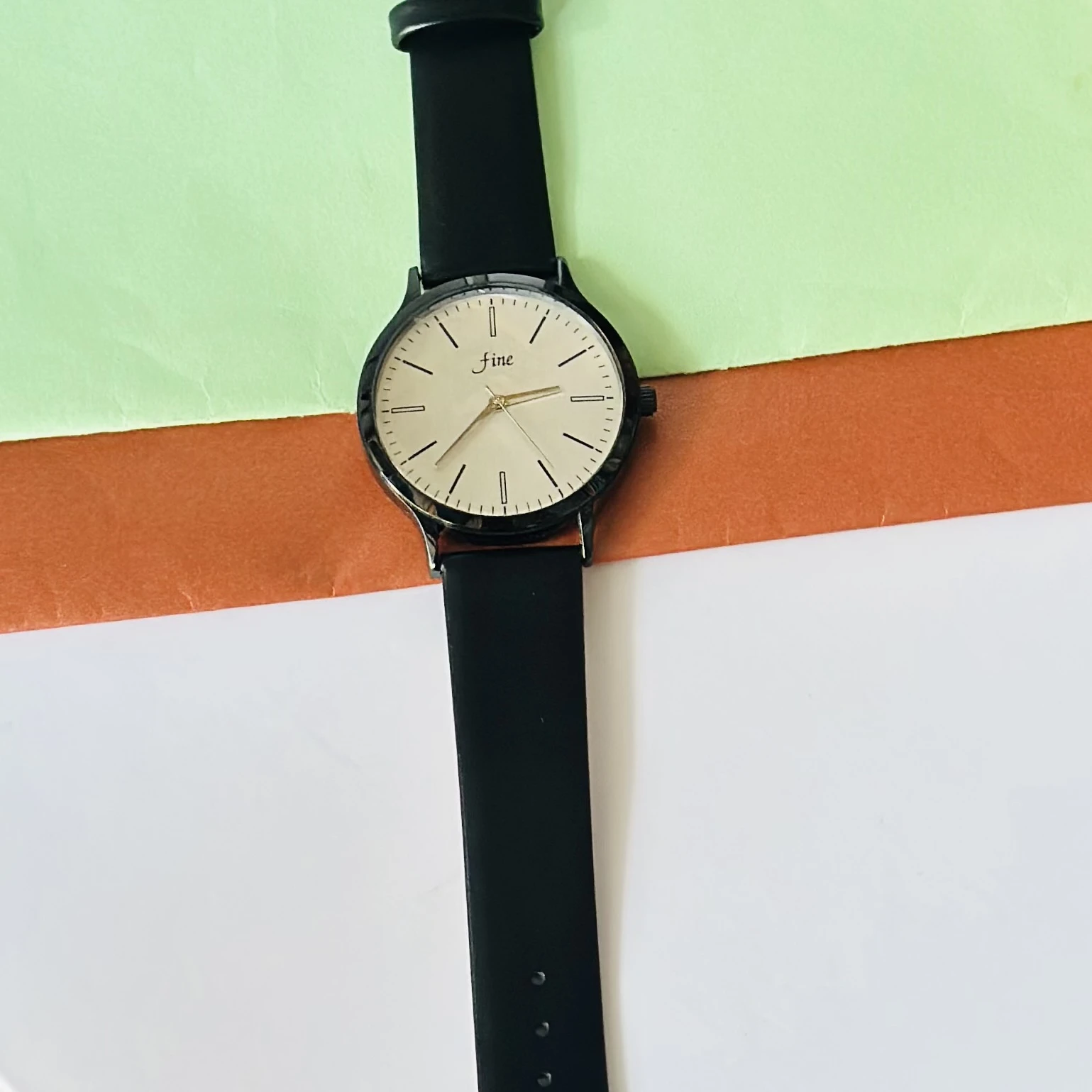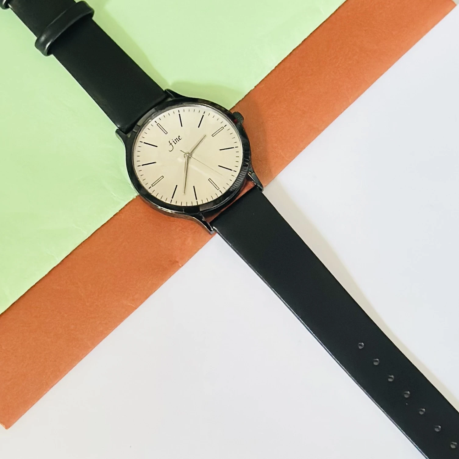 👉 Theme :- Analog watch with a black case and a tan leather strap.