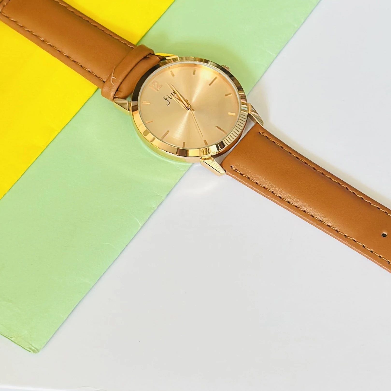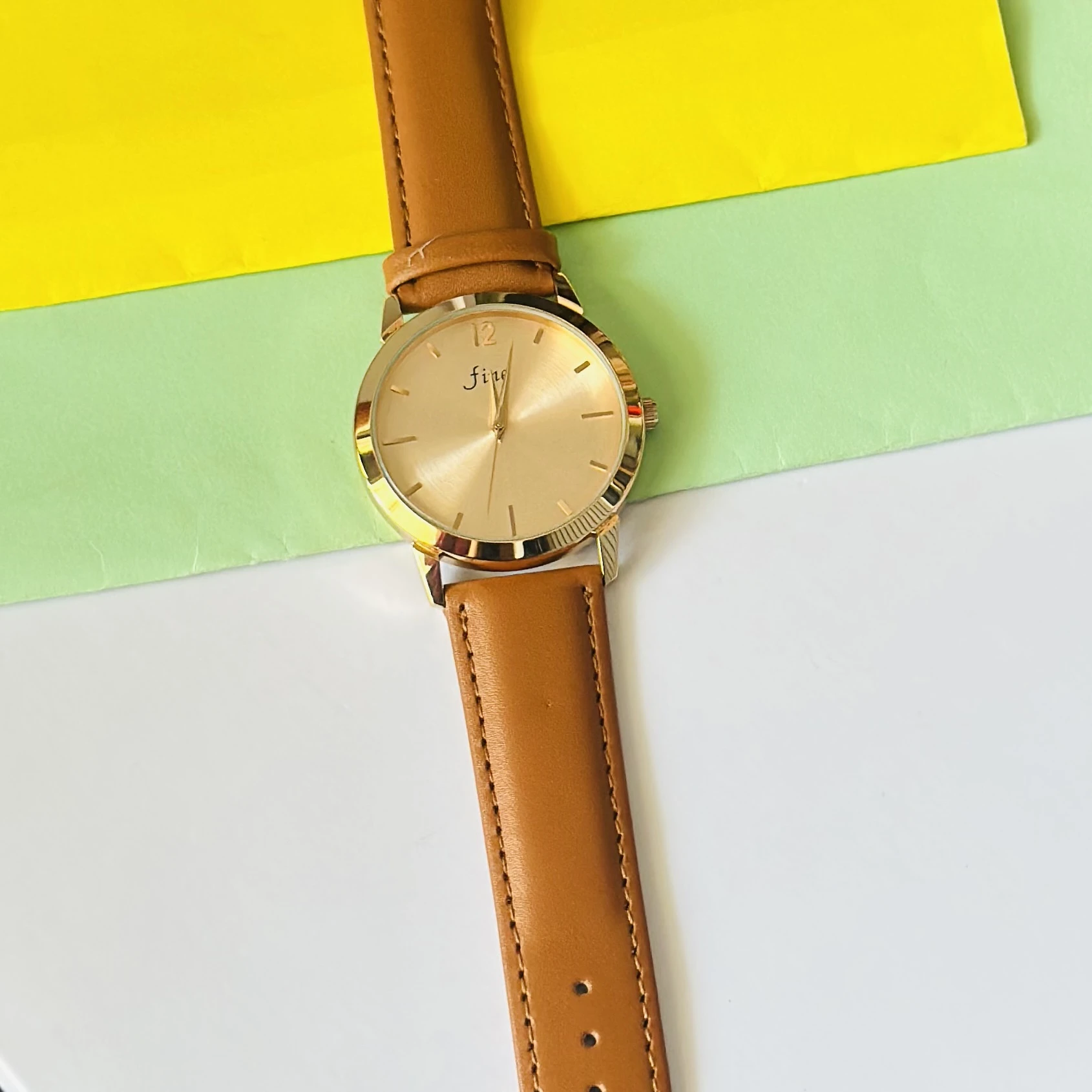 👉 Theme :- Analog wristwatch with a gold-tone case and a brown leather strap.