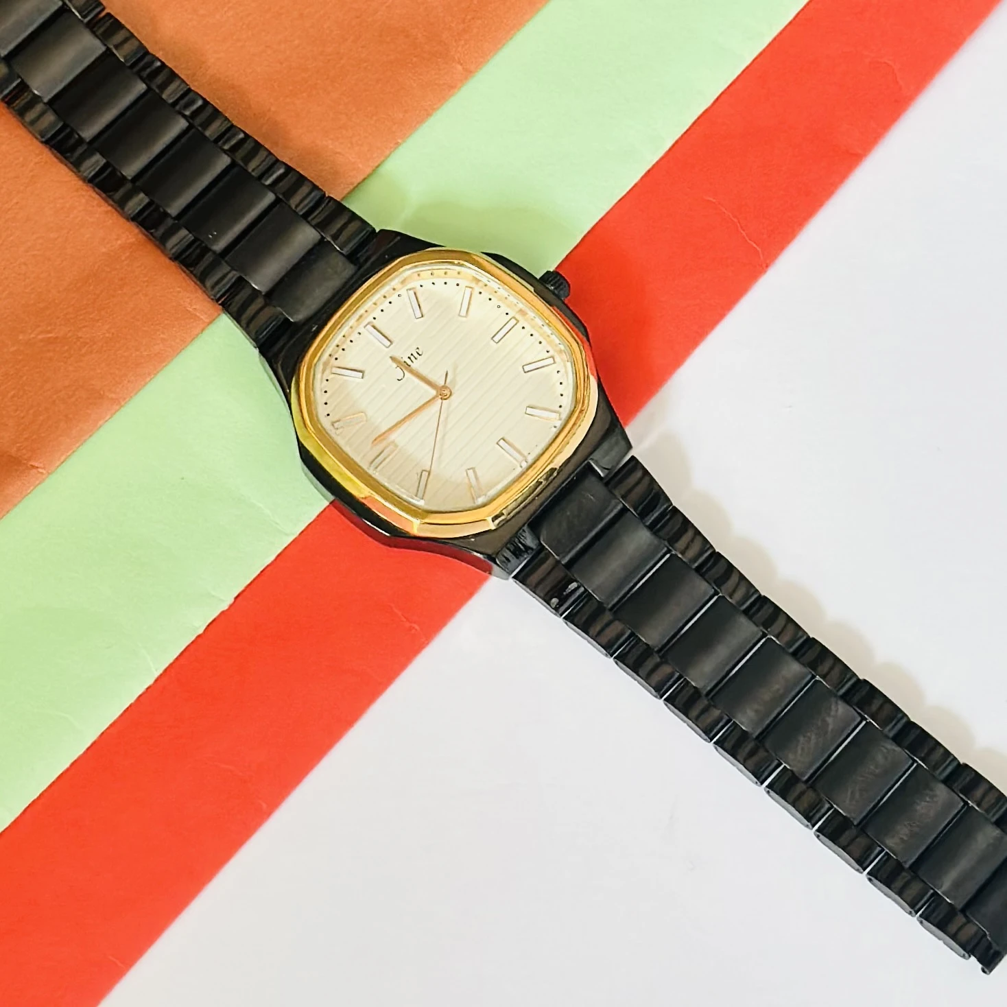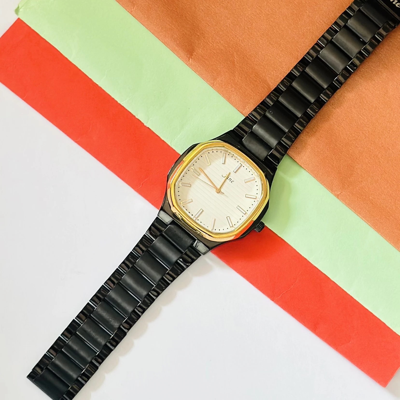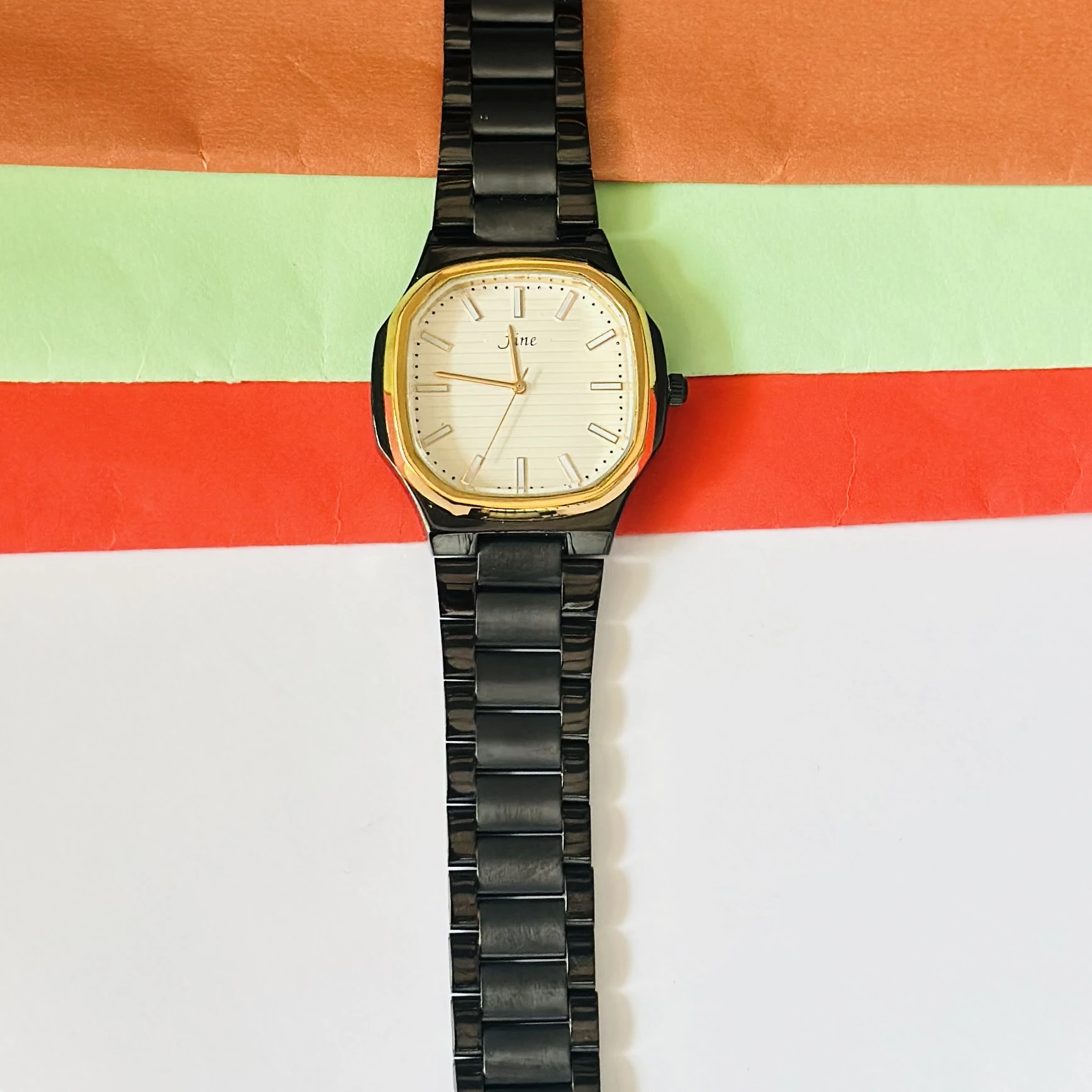 👉 Theme :- analog black metal strap watch with a white dial and gold-tone accents.