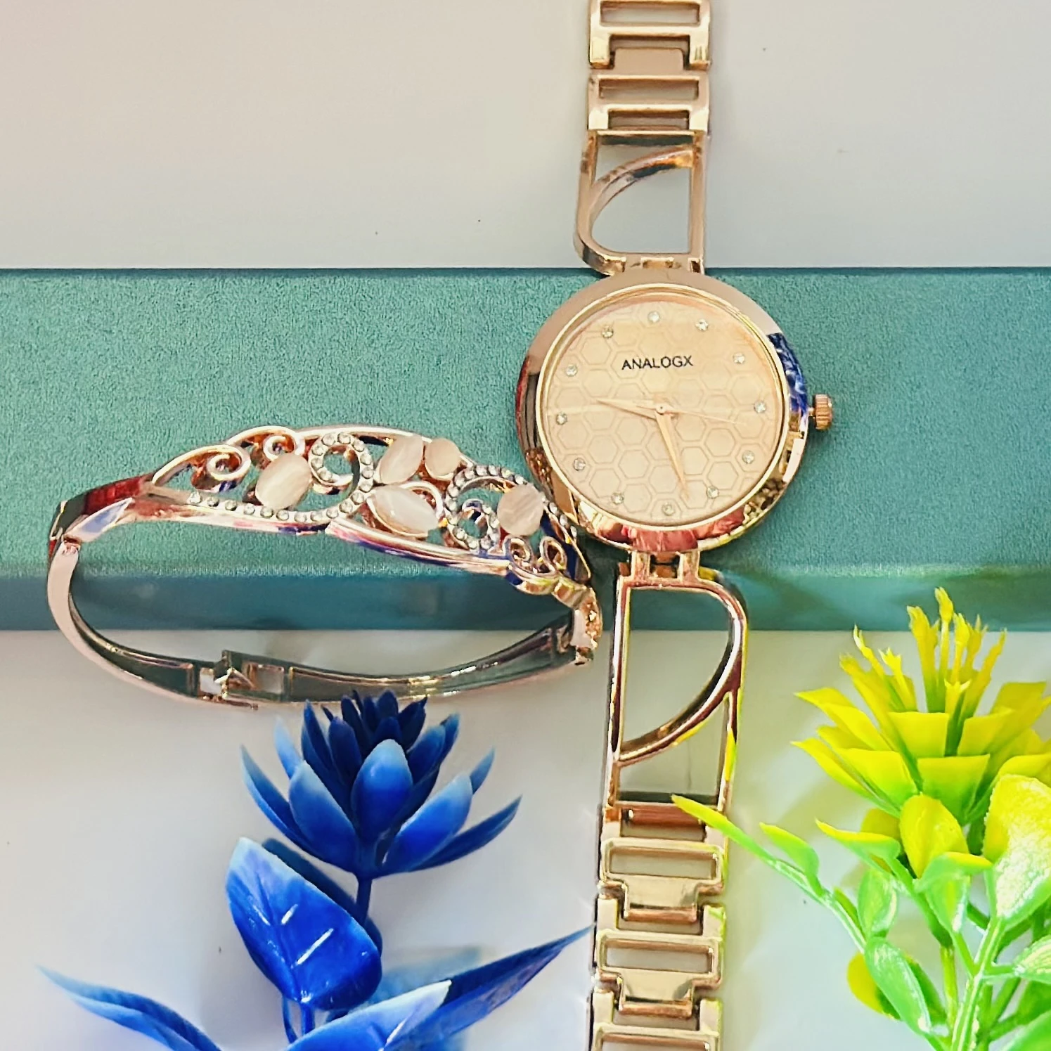 👉 Theme :- Analogx rose gold analog watch and a matching bracelet.