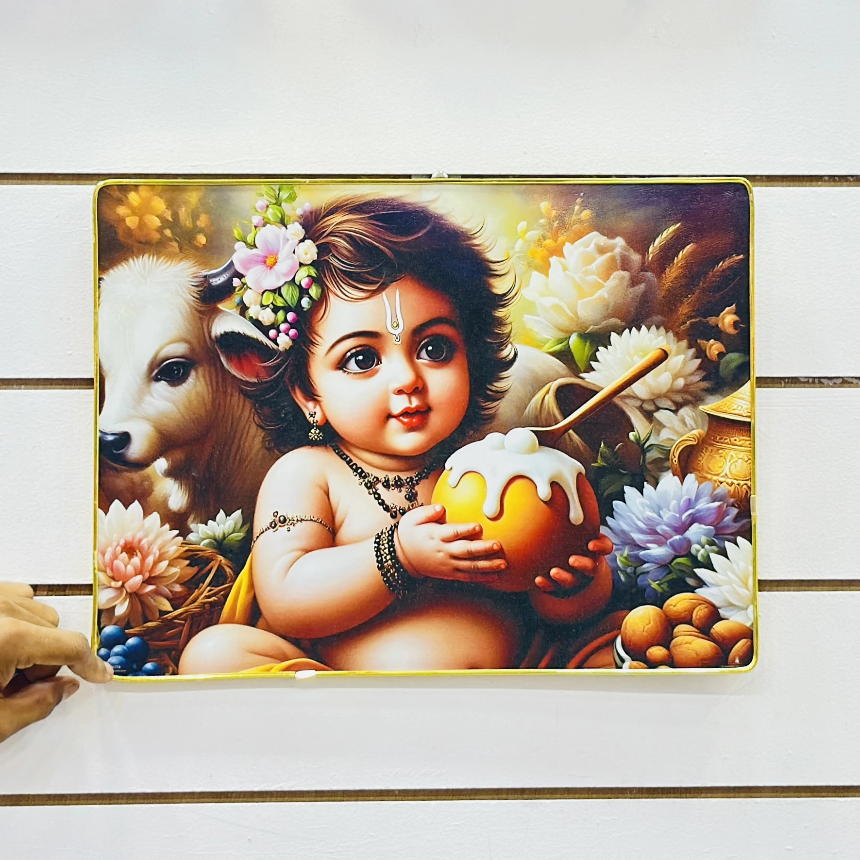 👉 Theme :- Baby Lord Krishna decorative wall art print featuring a glossy finish.