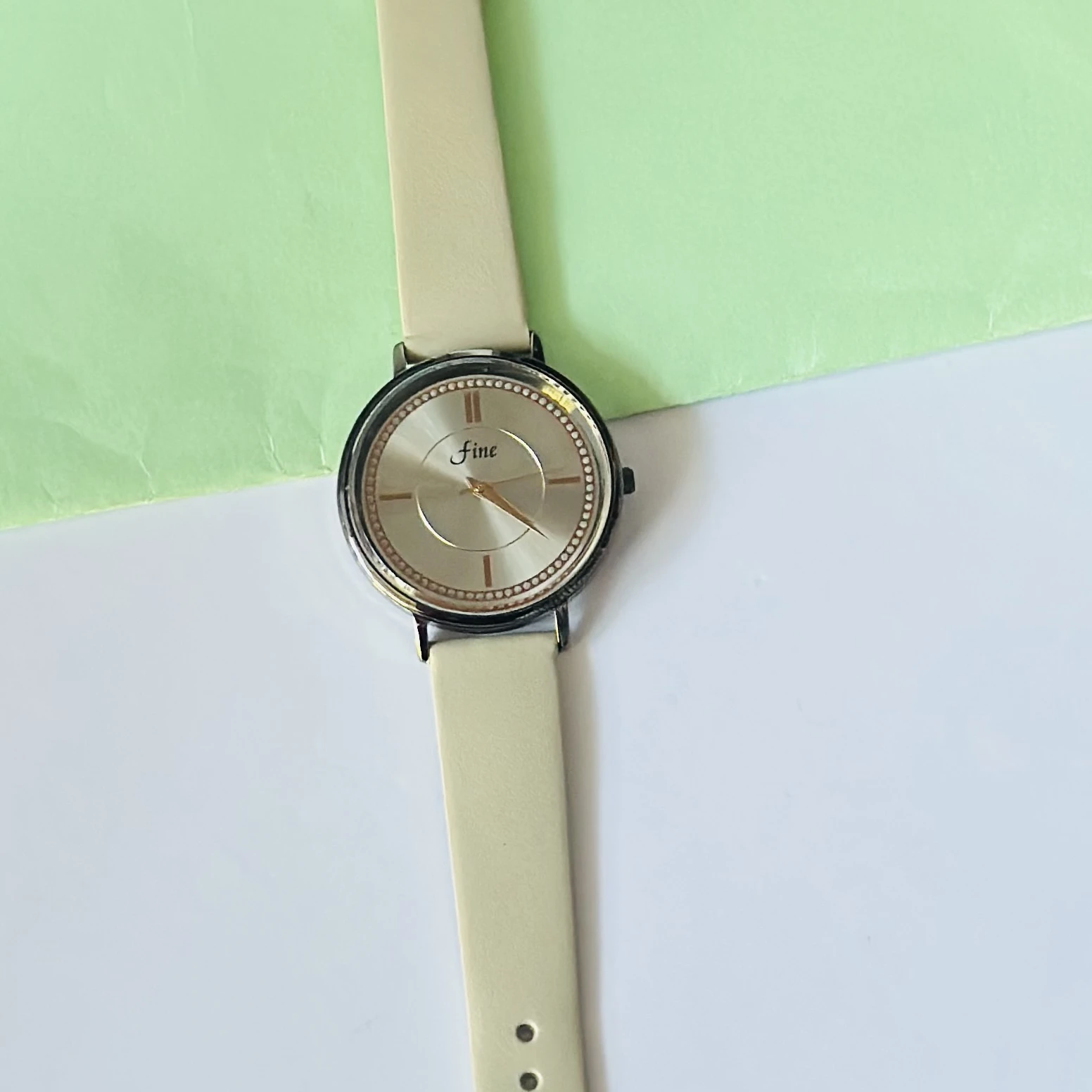 👉 Theme :- minimalist beige analog quartz watch with a round silver-toned case and dial, and a cream-colored silicone or leather strap.