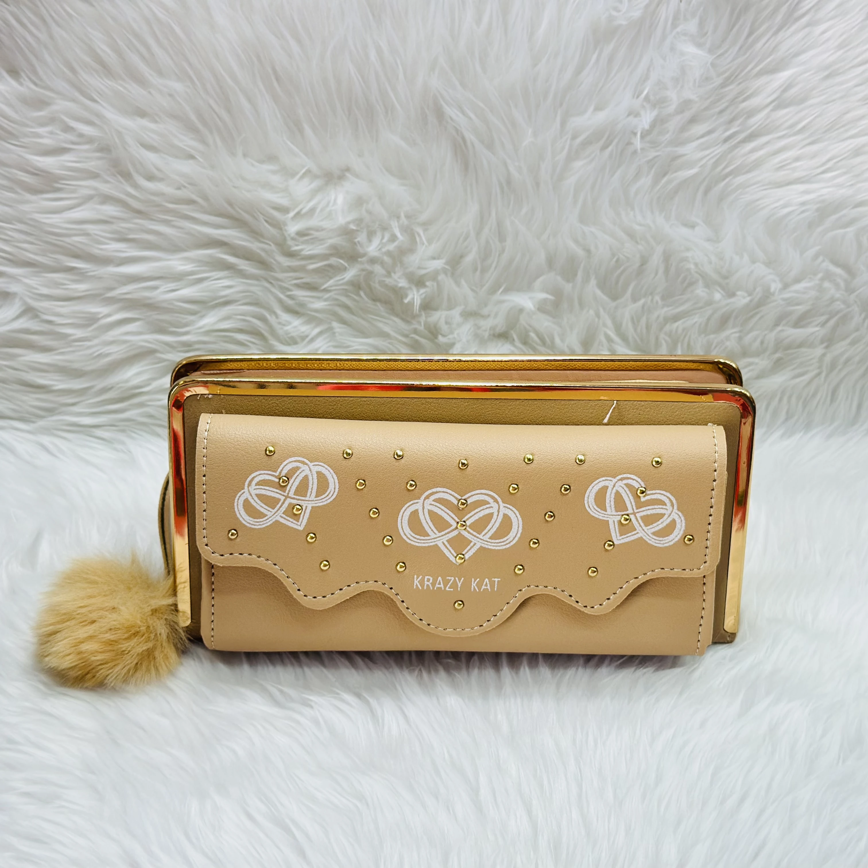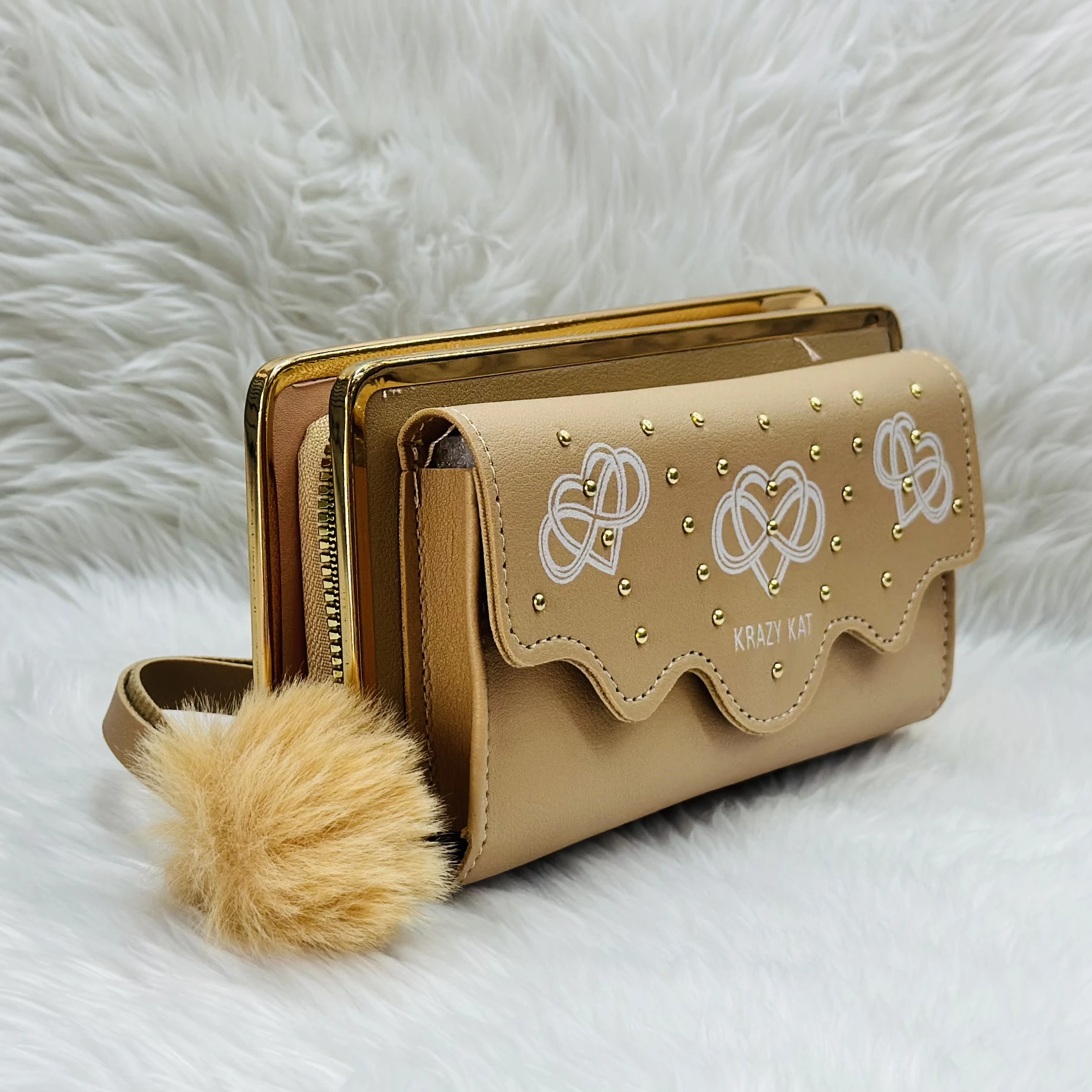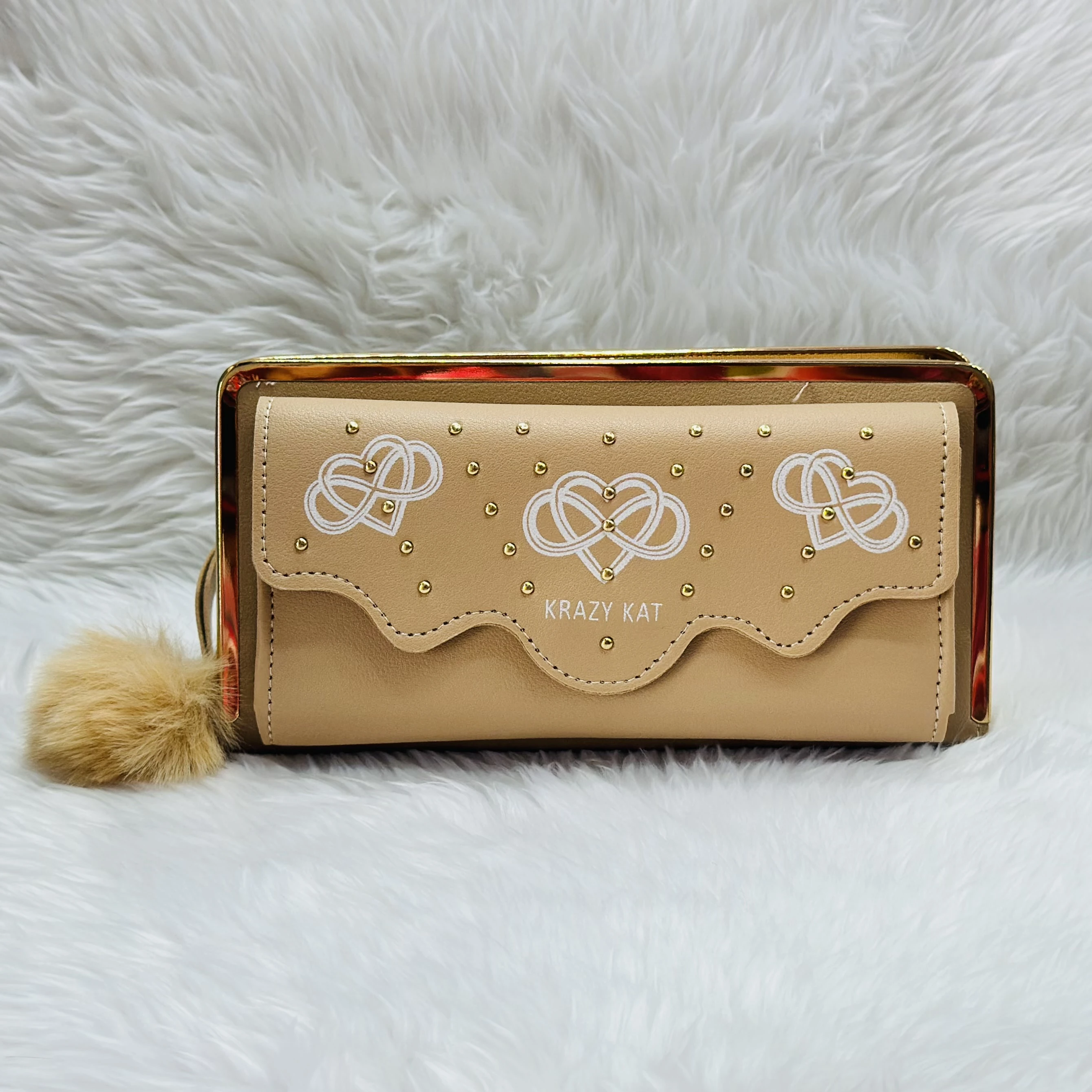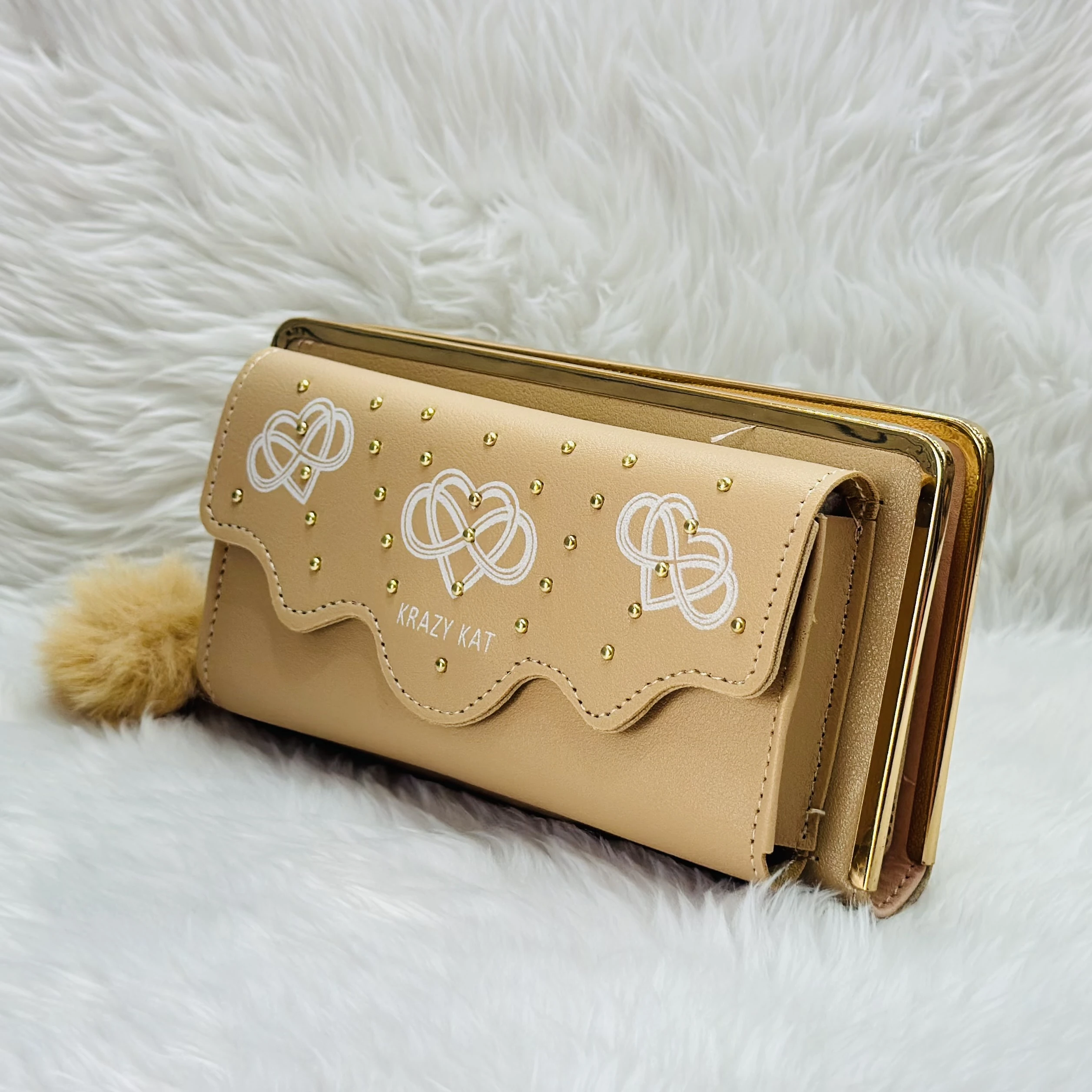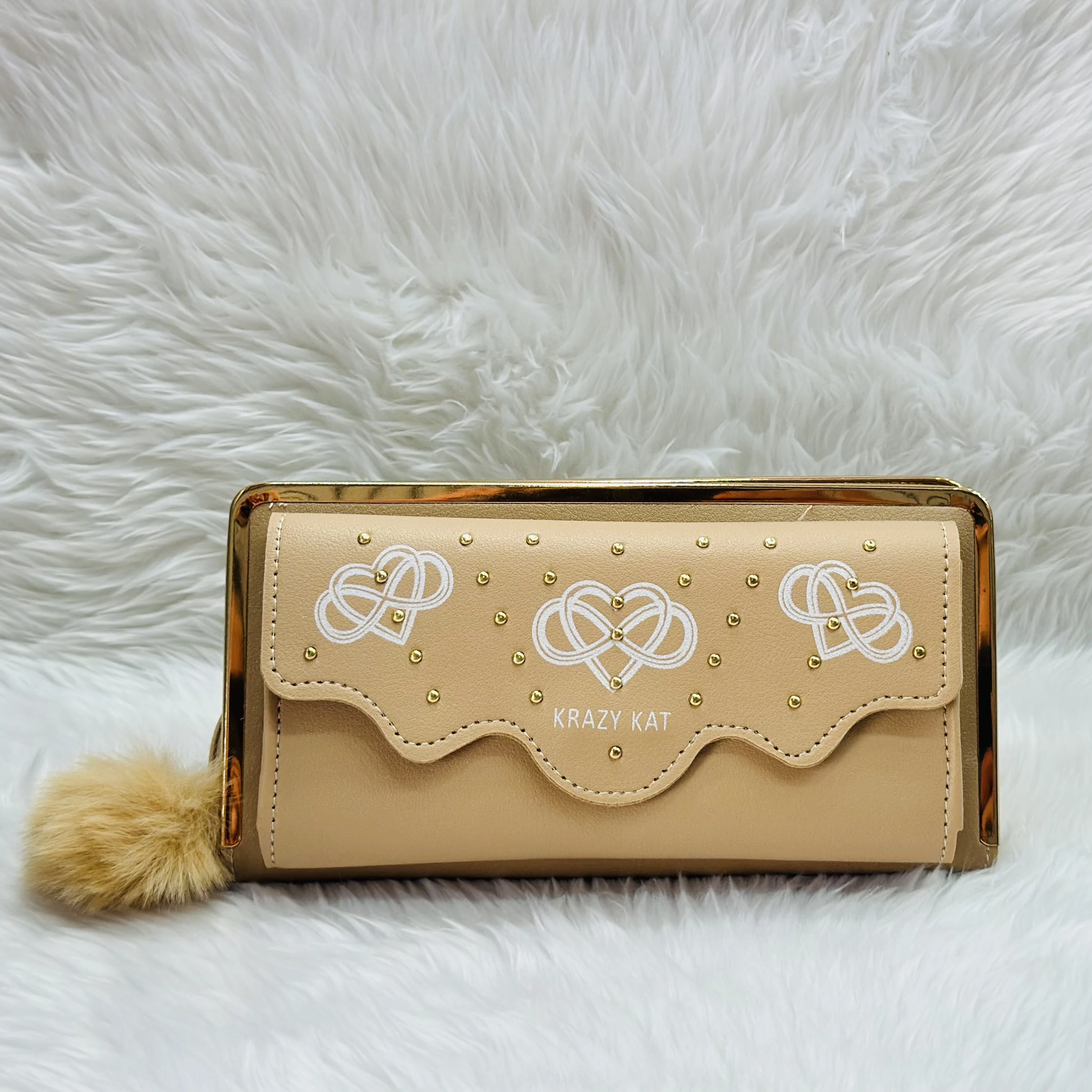 👉 Theme :- beige faux leather wallet or clutch purse with a gold-tone frame, heart-shaped embroidery, and a fuzzy pom-pom charm, possibly from the brand "Krazy Kat".