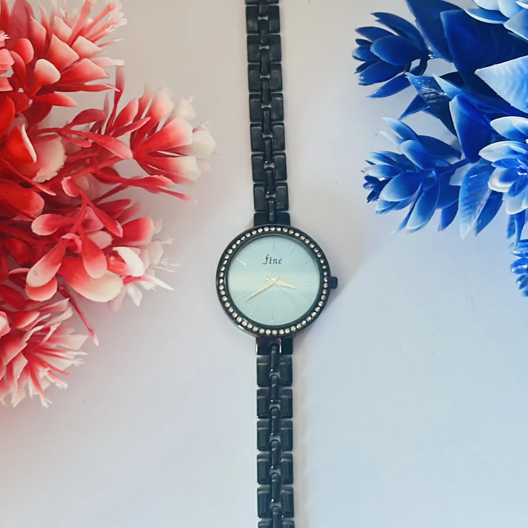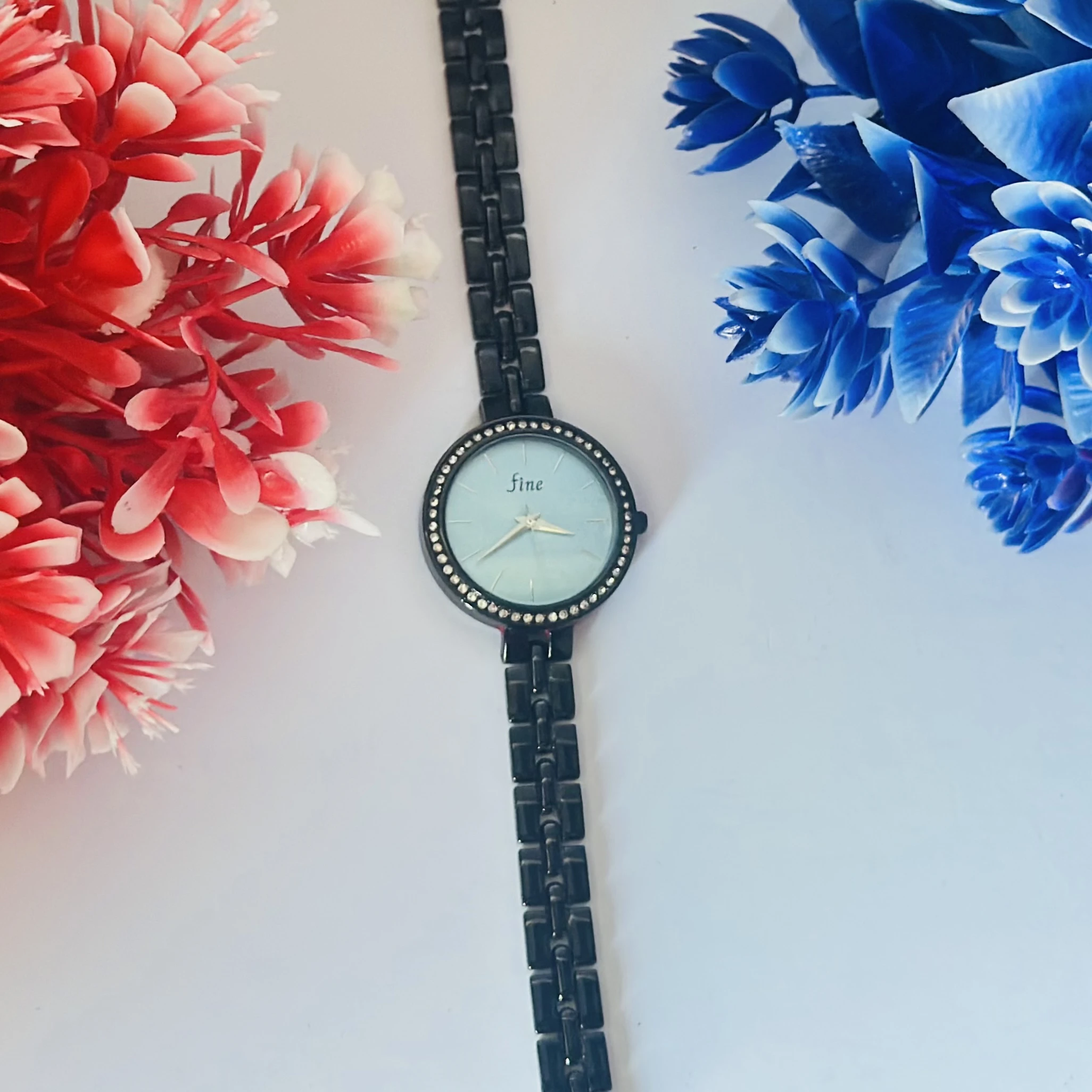 👉 Theme :- Black analog women's watch with a stainless steel strap
