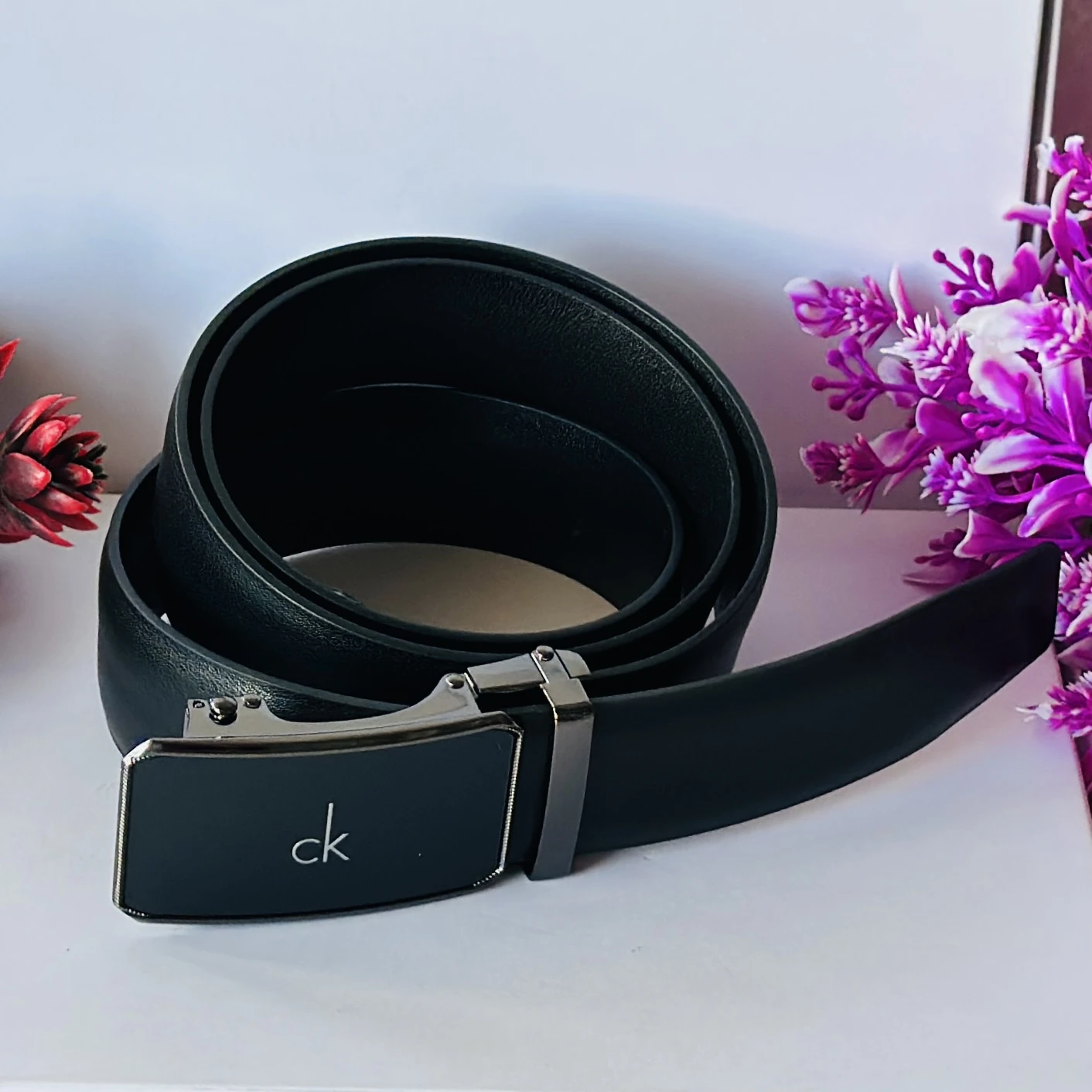 black Calvin Klein leather belt with a metal plaque buckle.