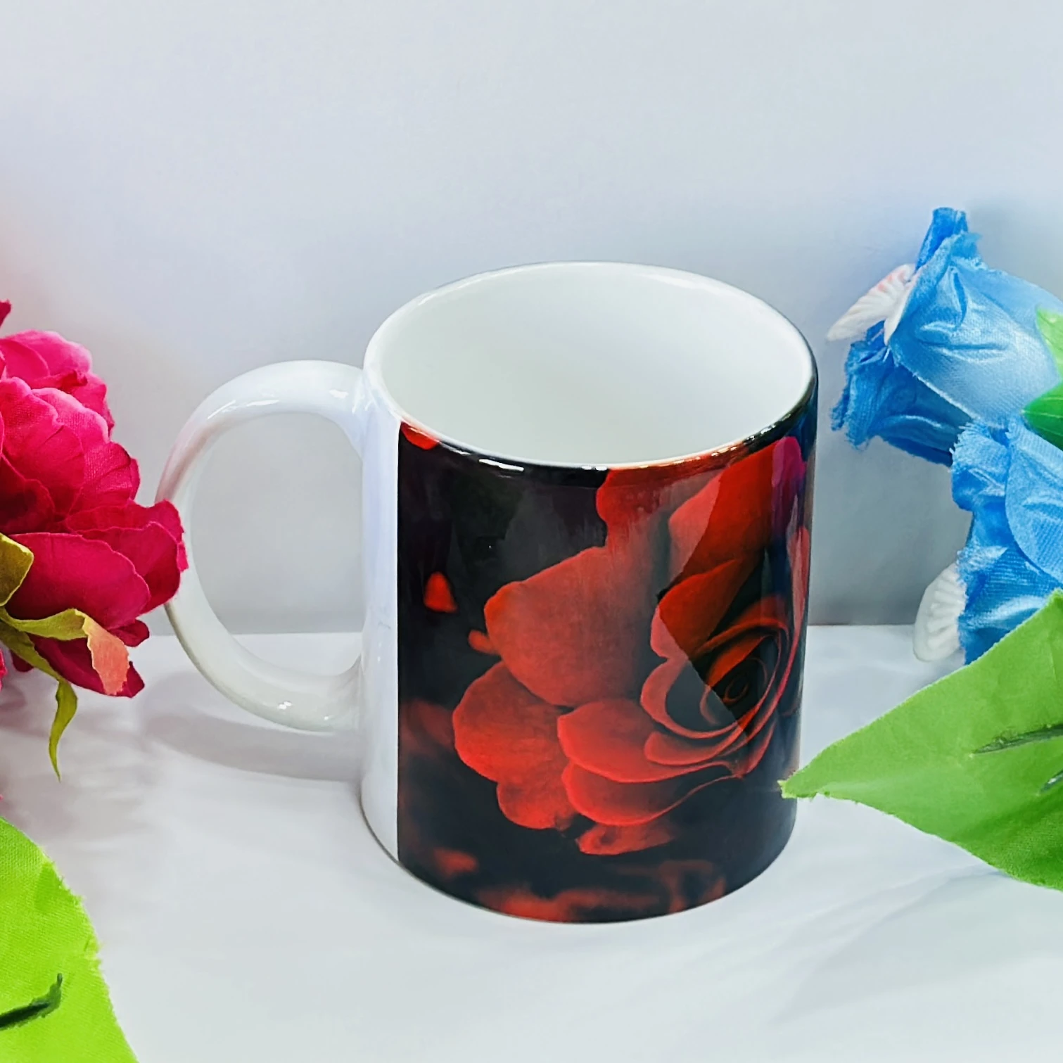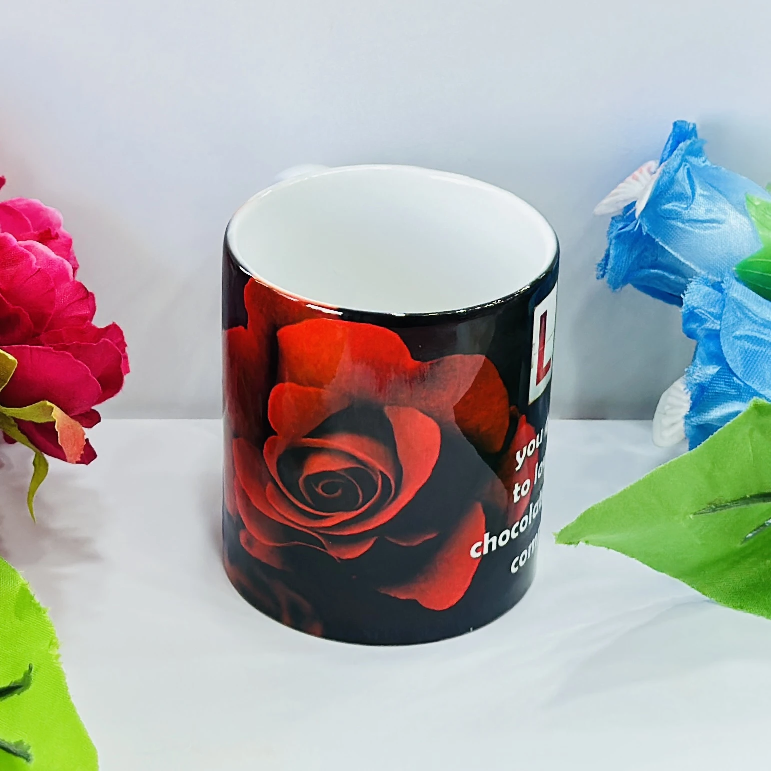 👉 Theme :- Black ceramic coffee mug with a red rose design.