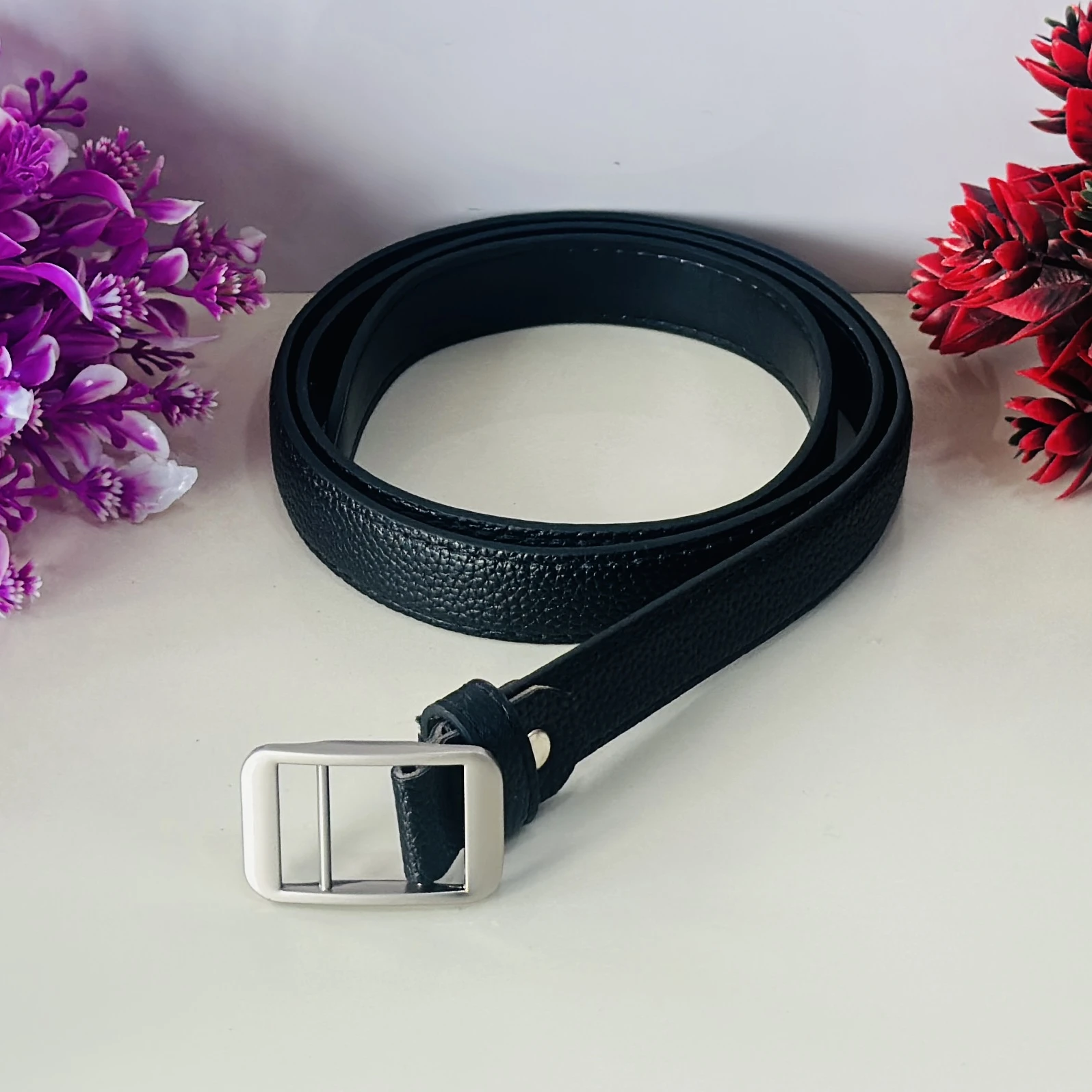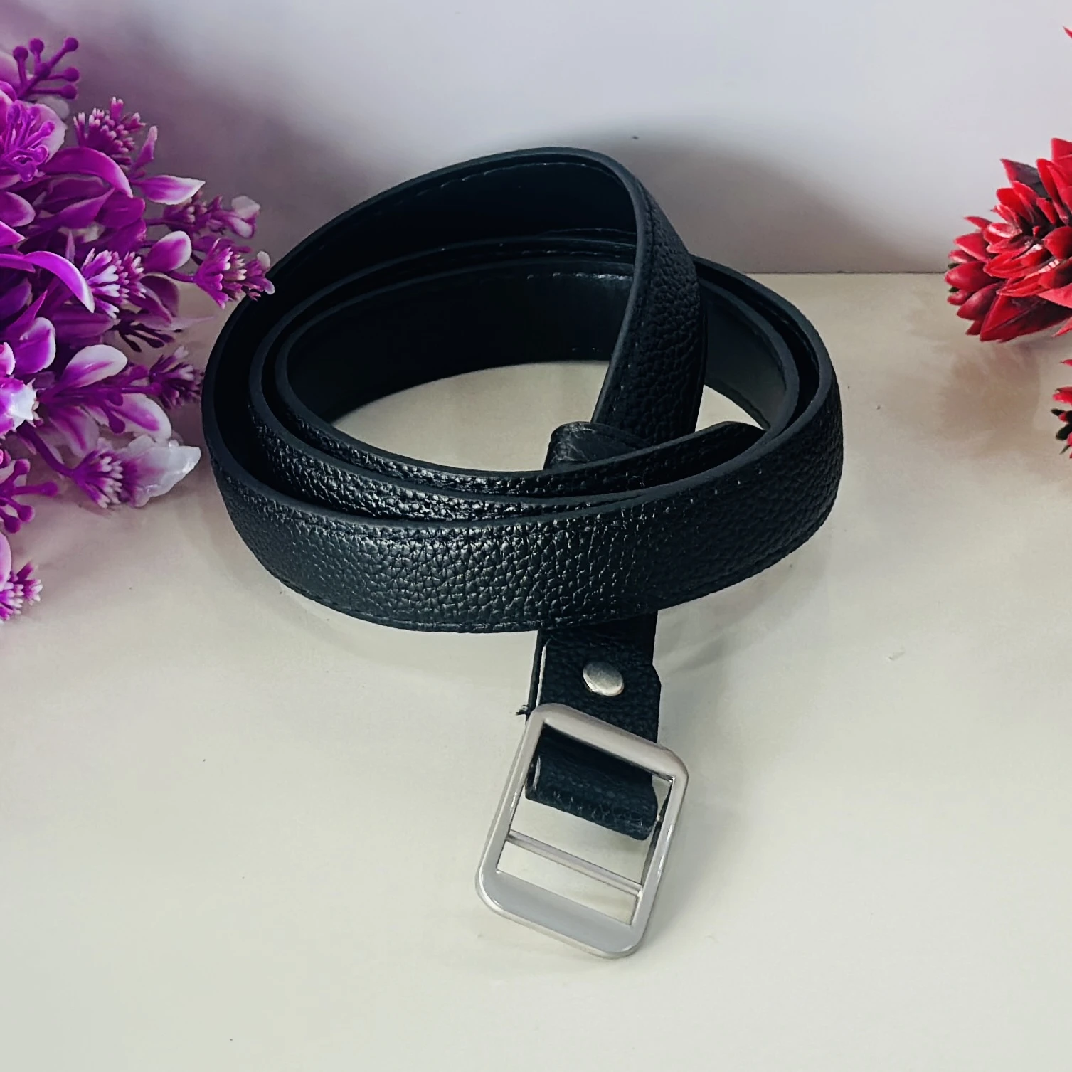 👉 Theme :- Black leather belt with a metal pin buckle.