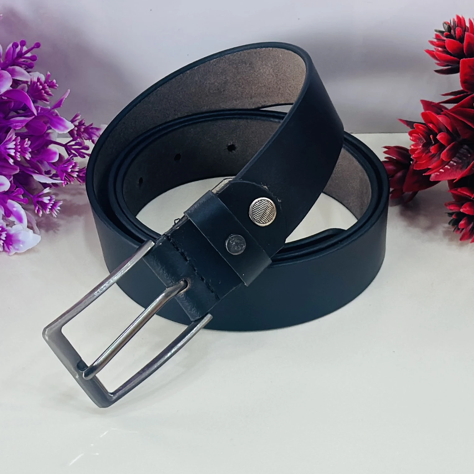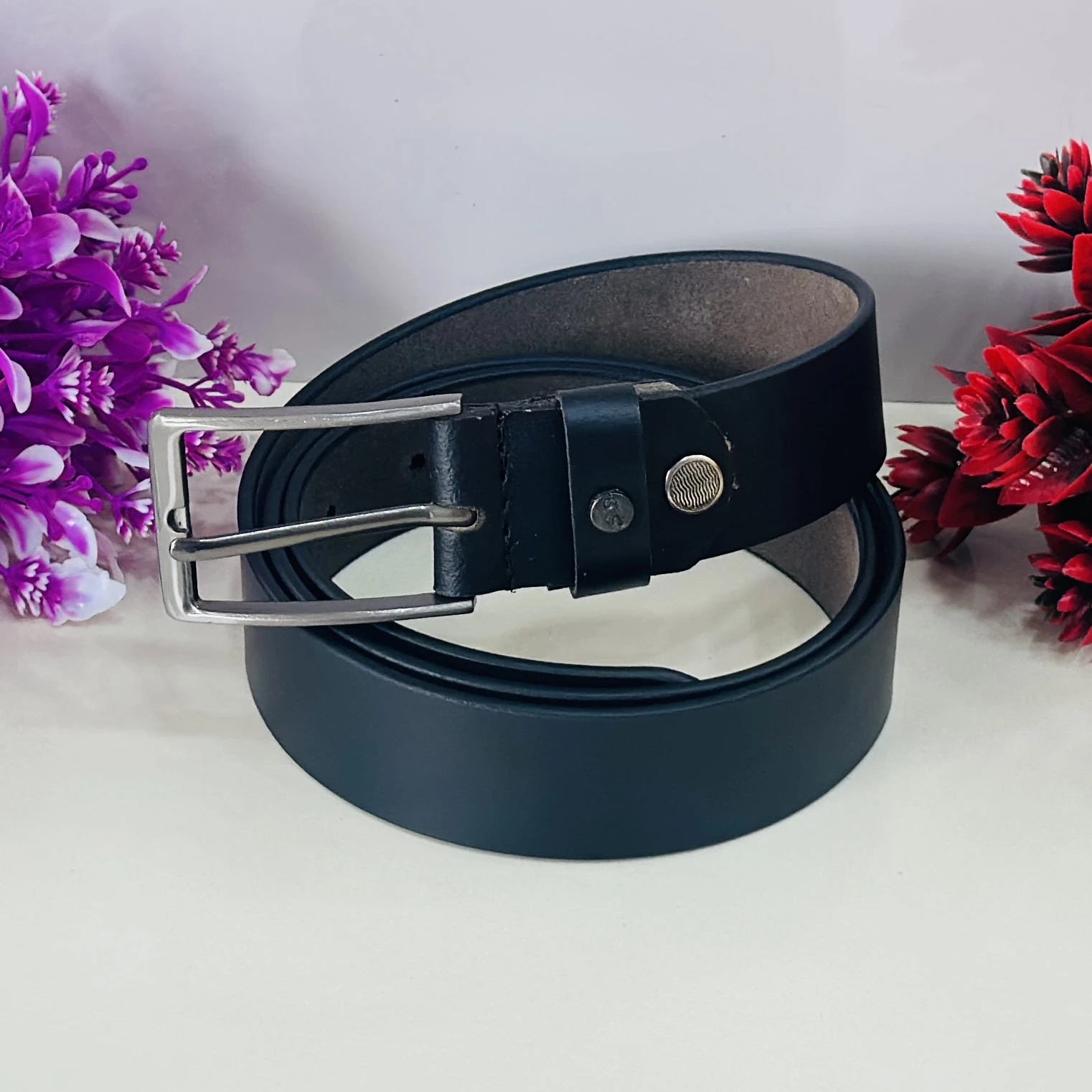 👉 Theme :- Black leather belt with a metal buckle