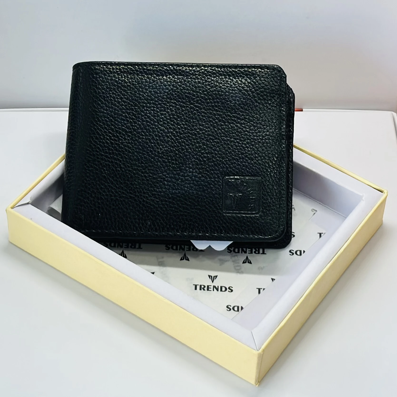 👉 Theme :- black leather bifold wallet with a "Trends" logo.