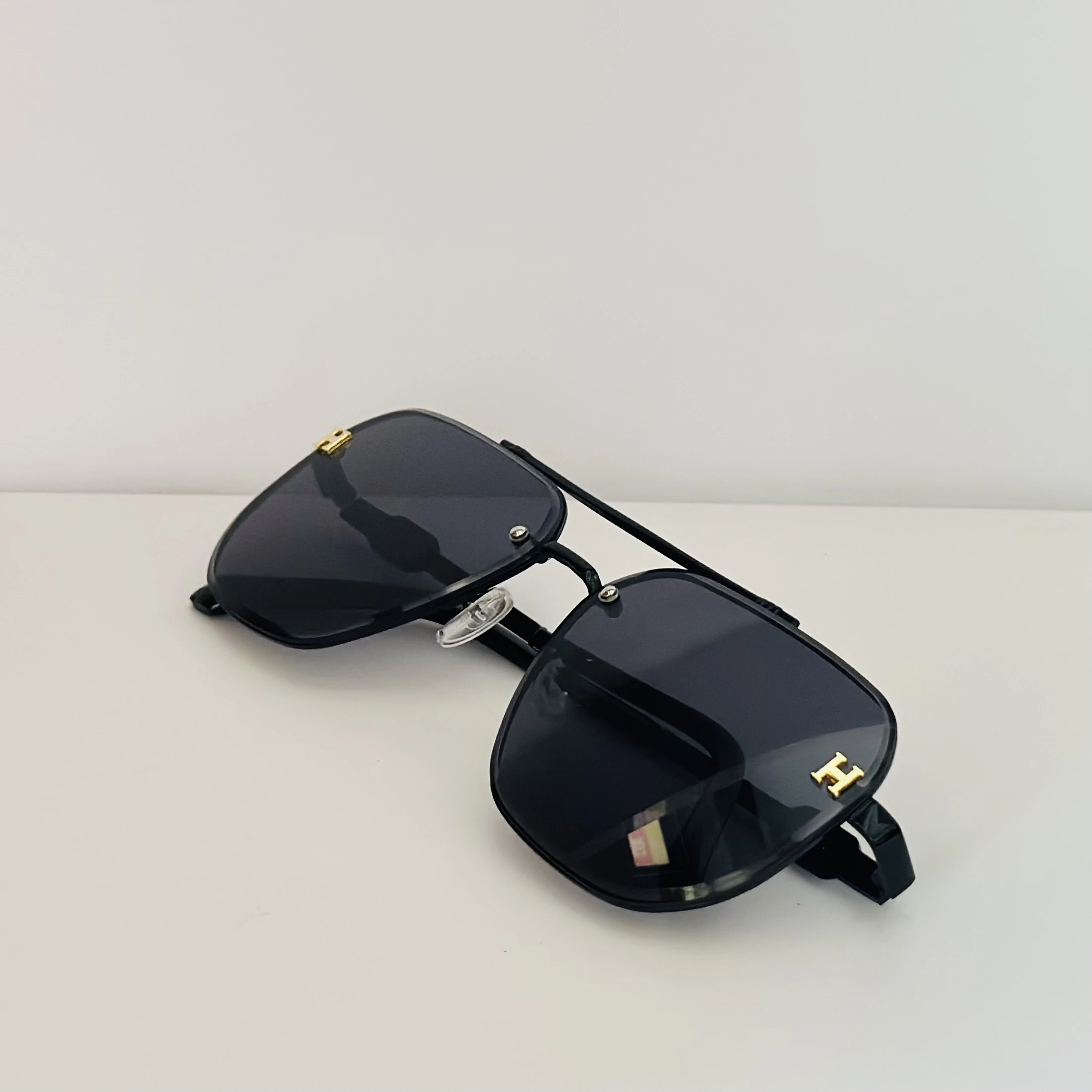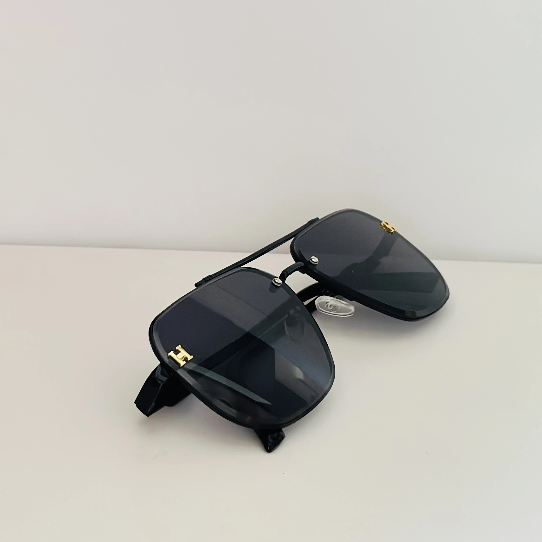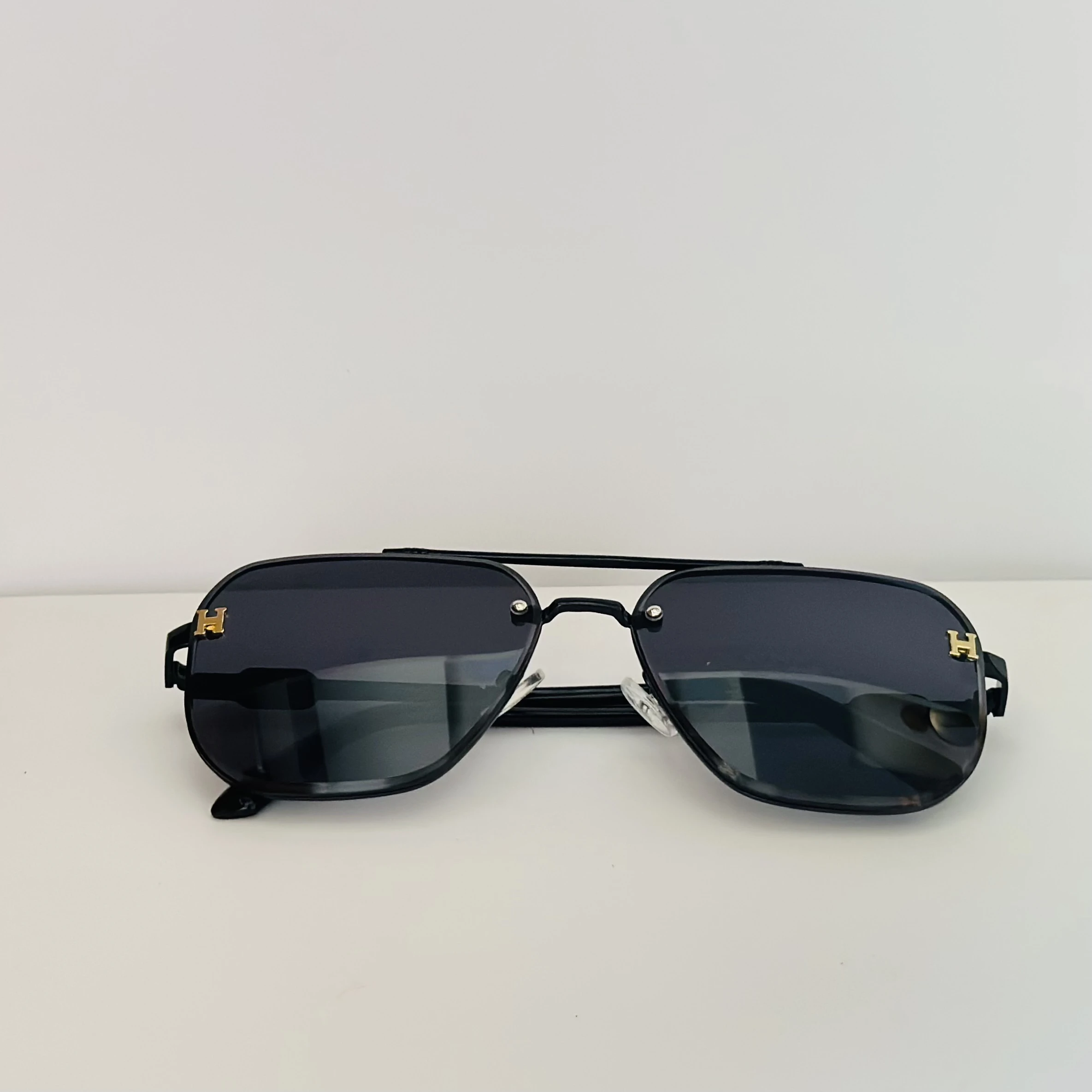 π Theme :- Black rimless aviator sunglasses with gold-tone "H" emblems on the temples.Β