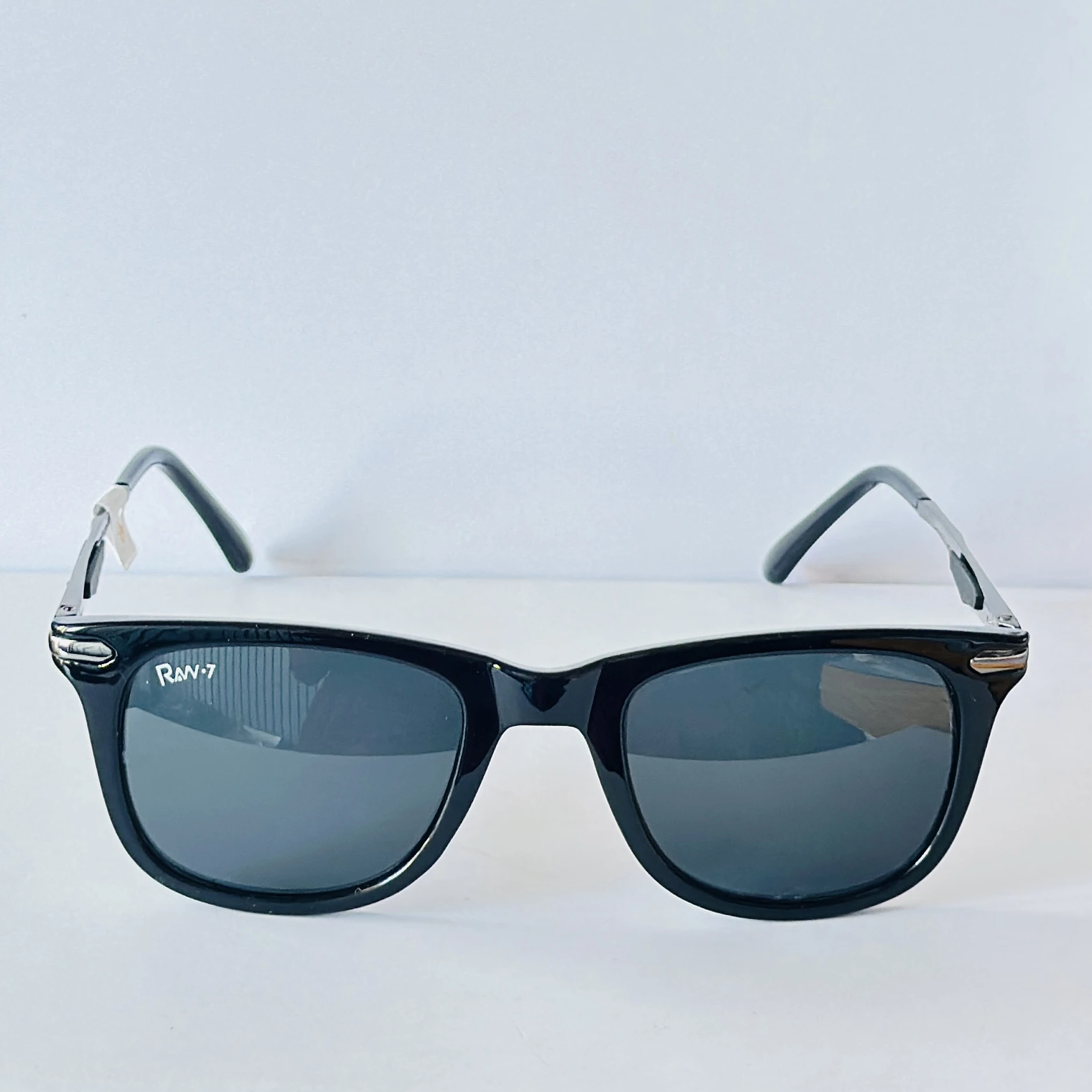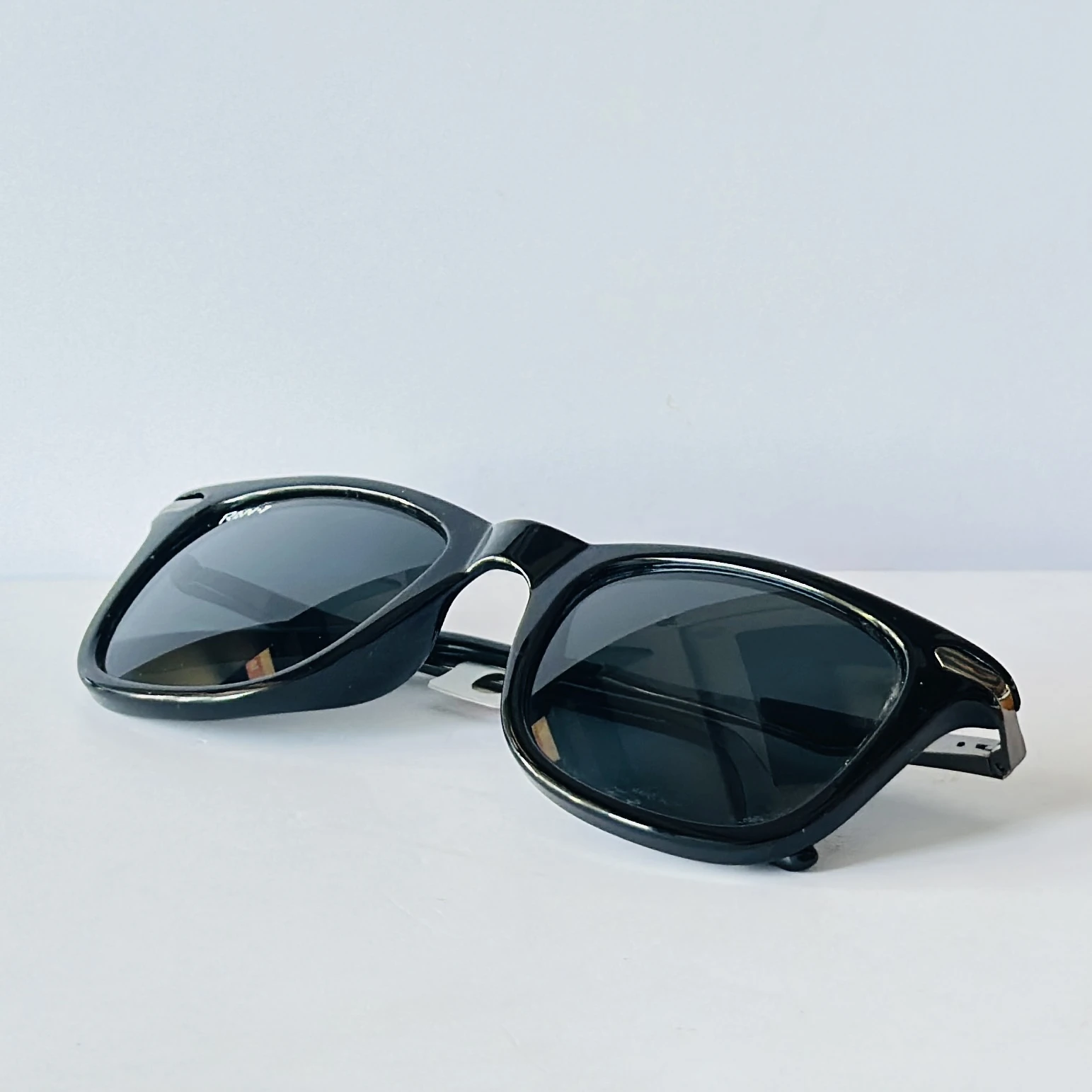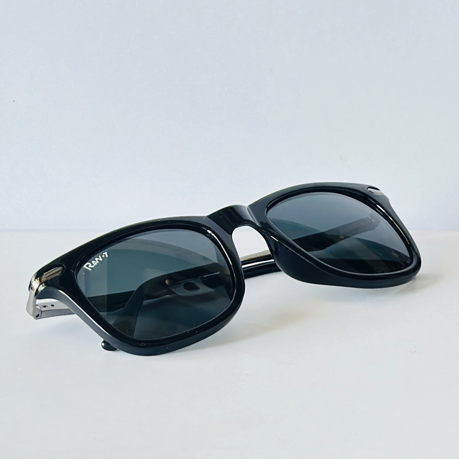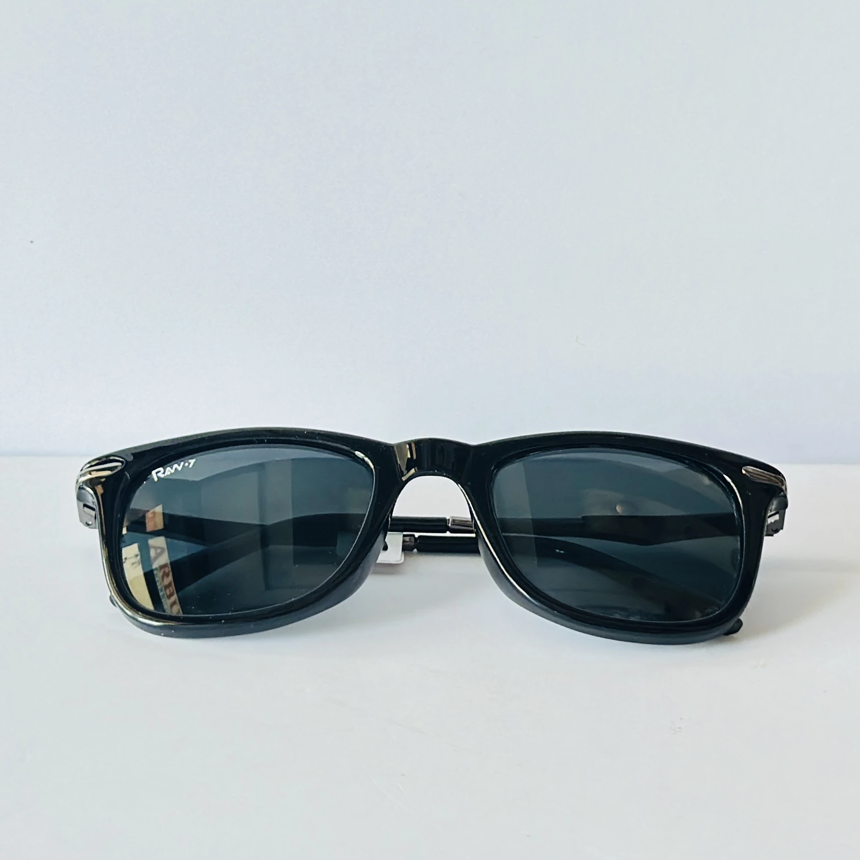 Black sunglasses appear to be similar to the iconic Ray-Ban Original Wayfarer.