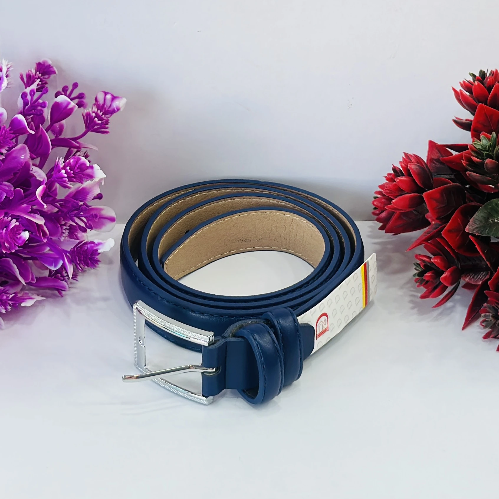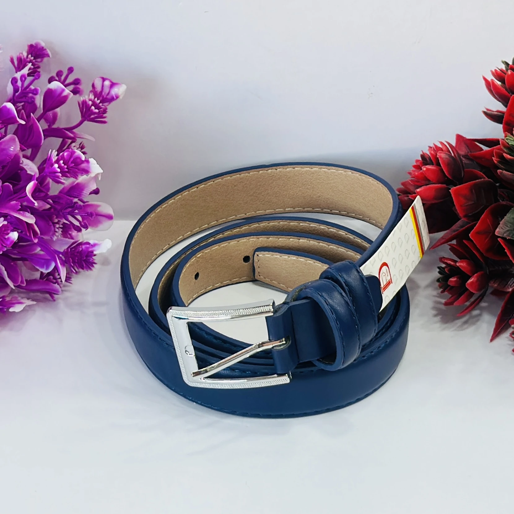 👉 Theme :- Blue leather belt with a silver-tone buckle.