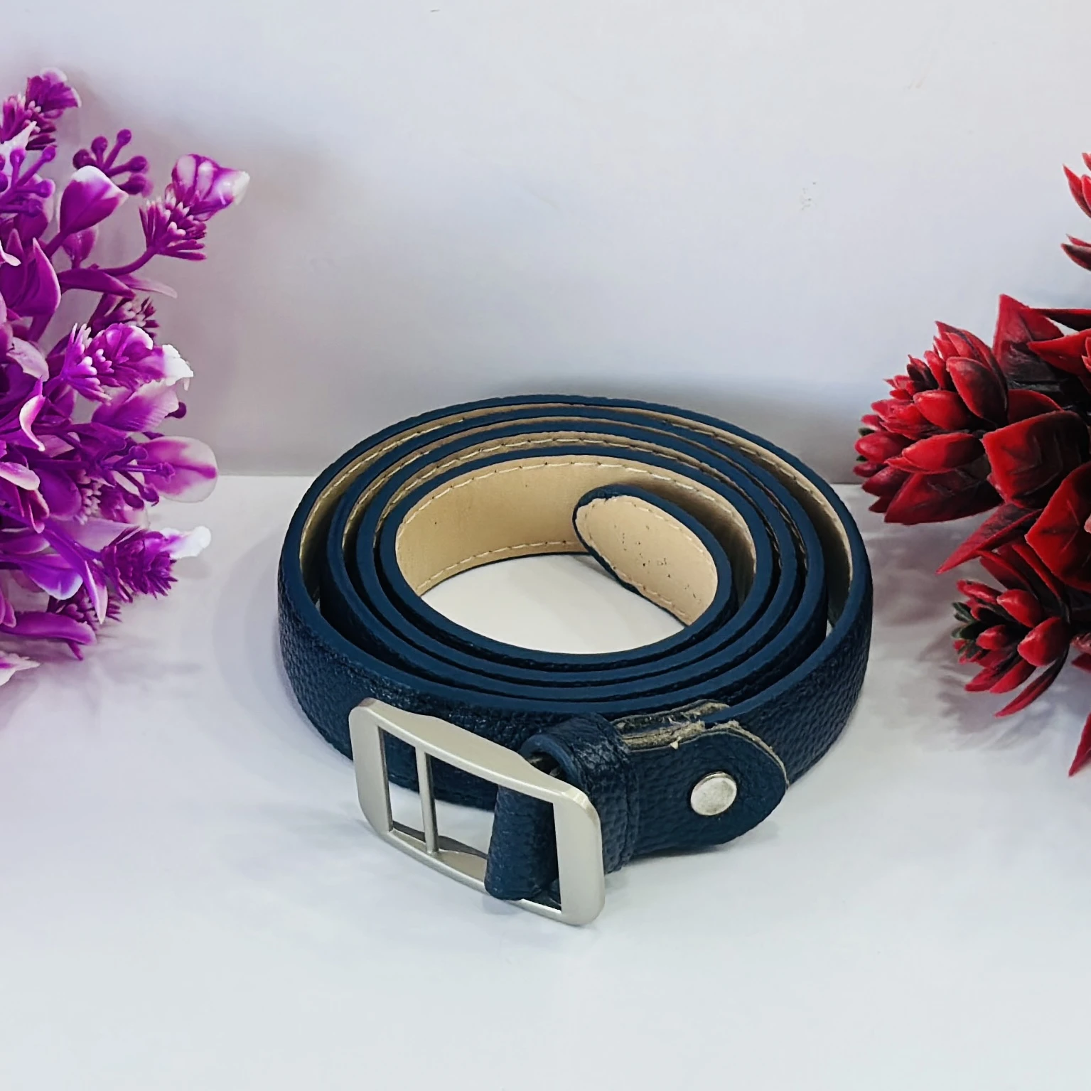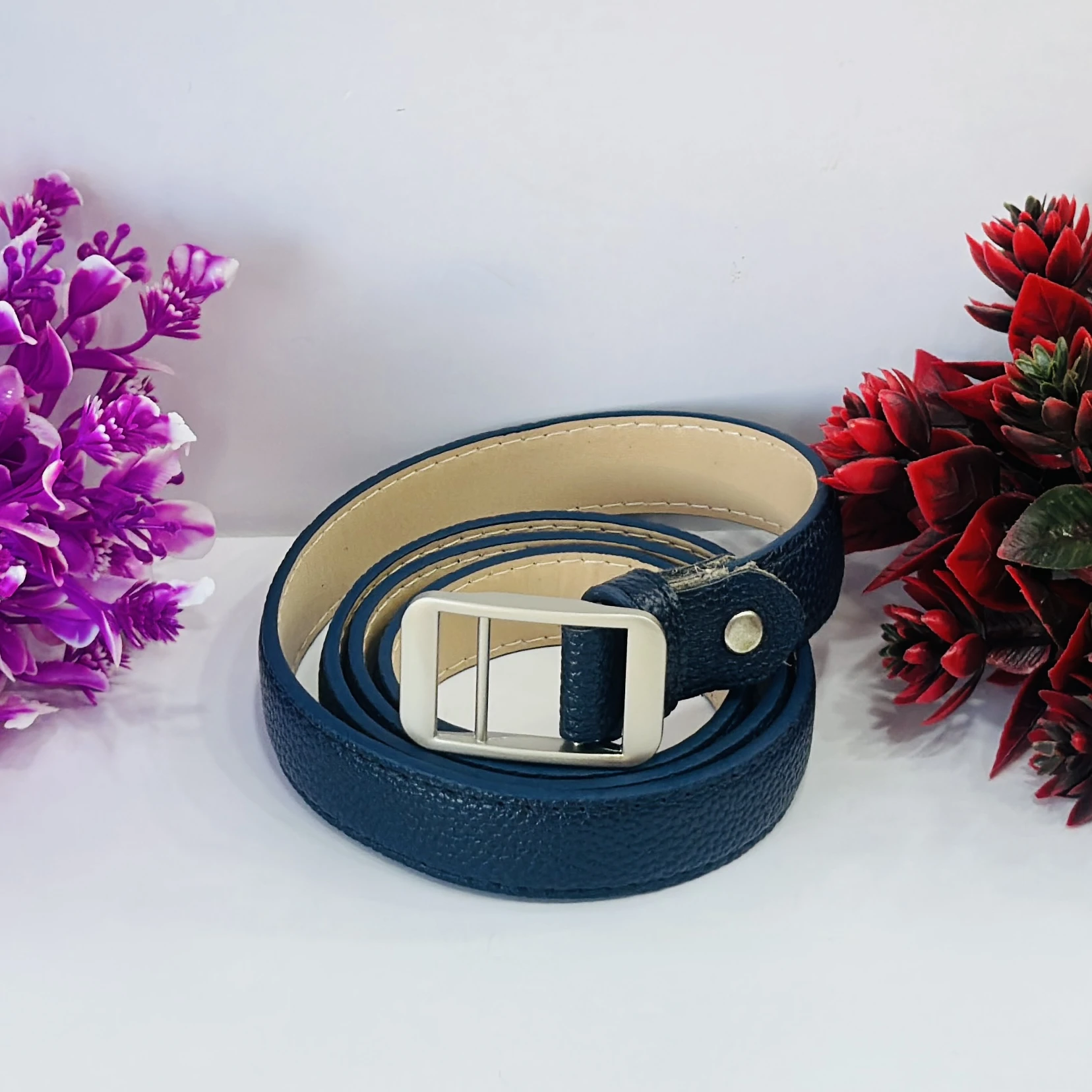 👉 Theme :- Blue leather belt with a silver-tone buckle.
