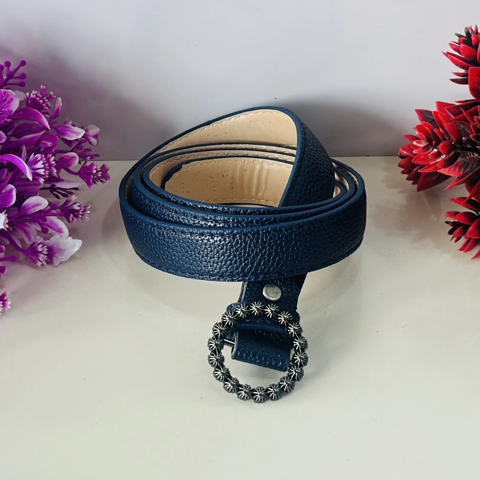 👉 Theme :- Blue Togo leather belt strap with a decorative buckle.