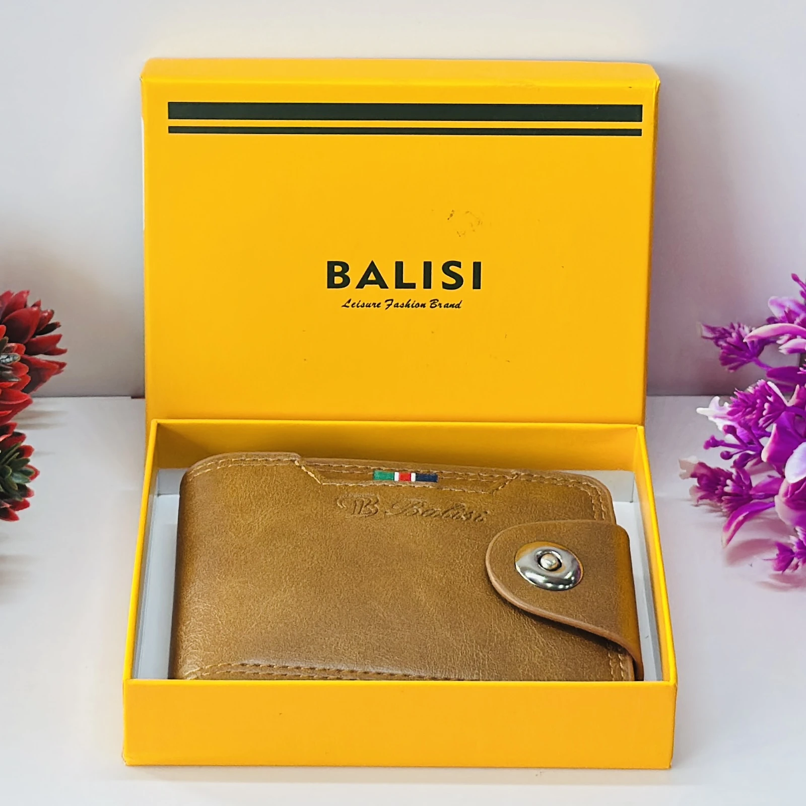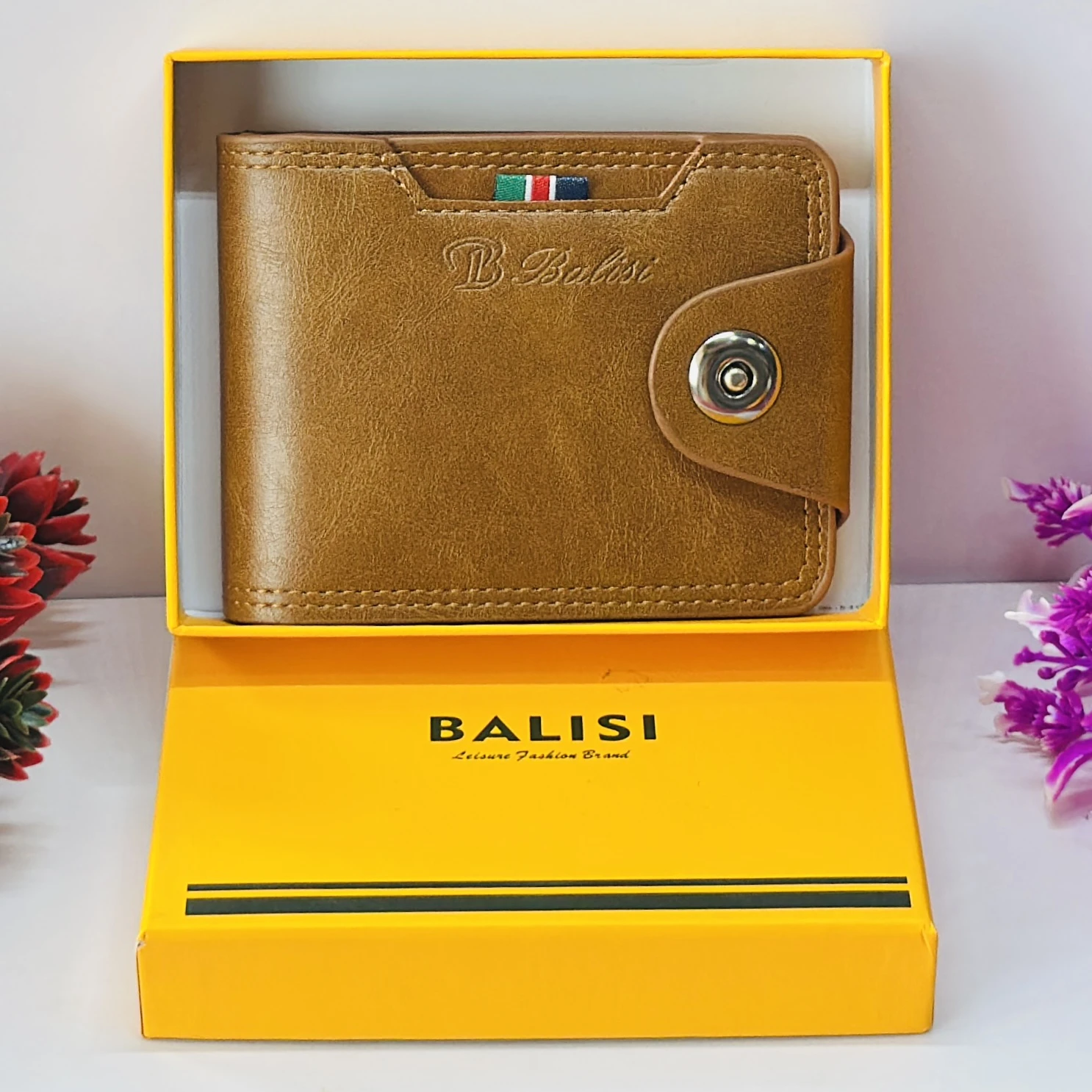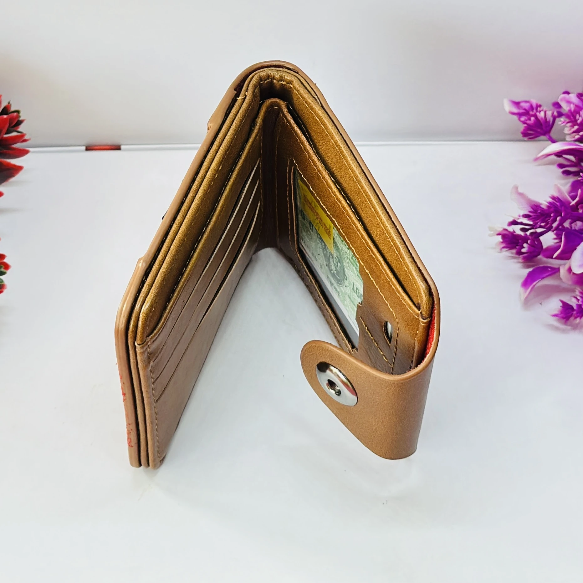 👉 Theme :- Brown leather bi-fold wallet with a button closure.