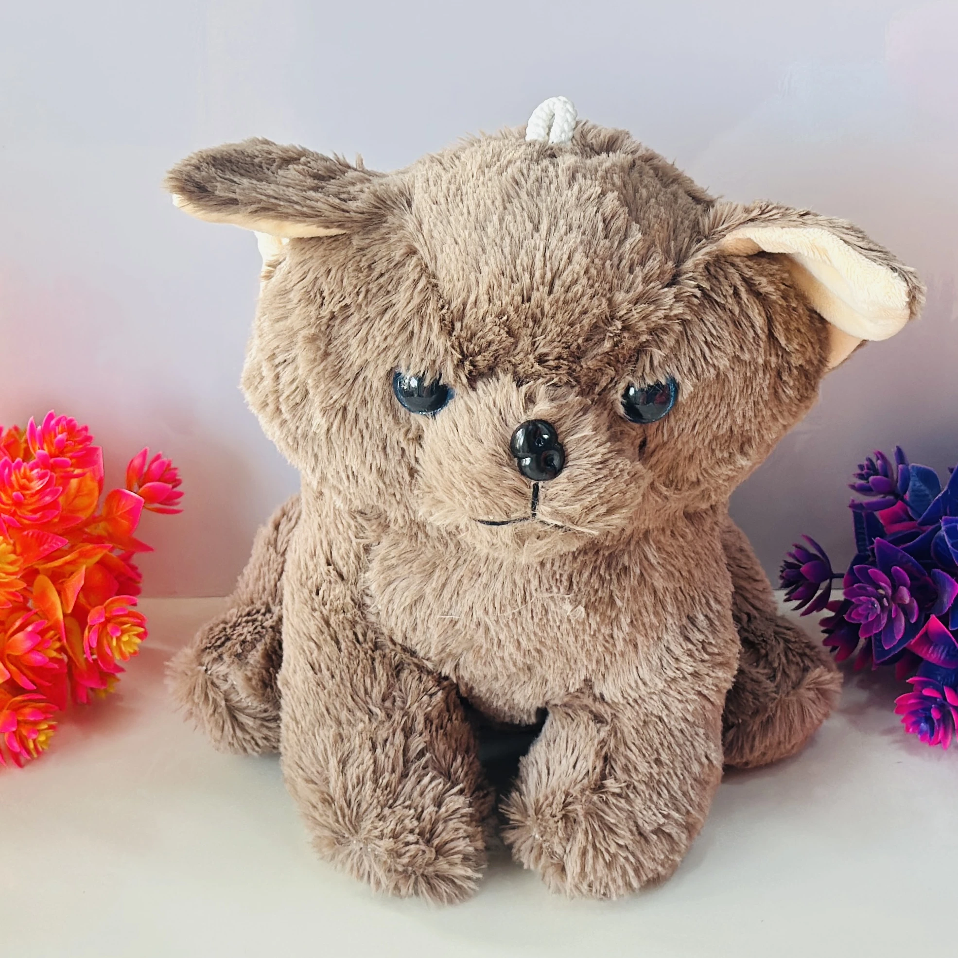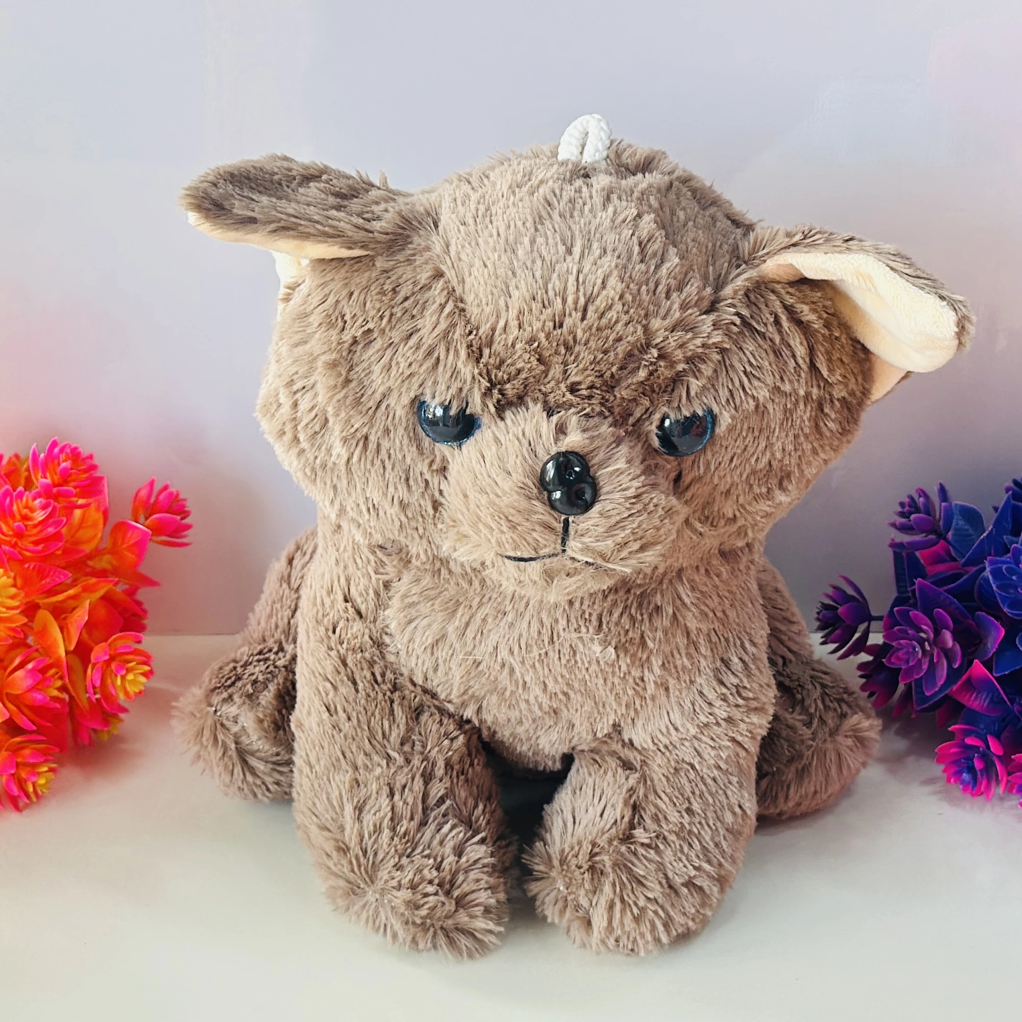 👉Theme :- Brown fuzzy dog soft toy or stuffed animal with blue eyes.