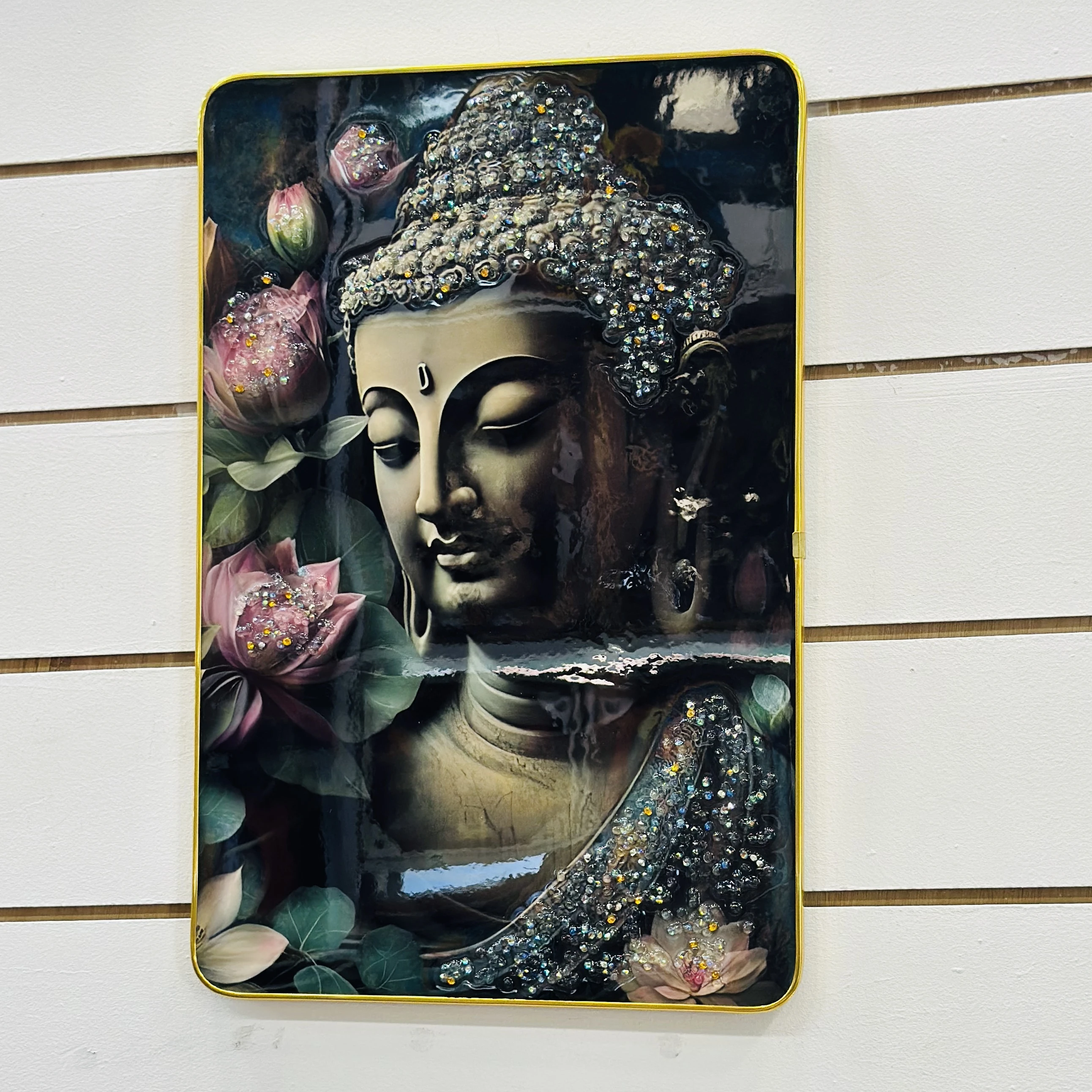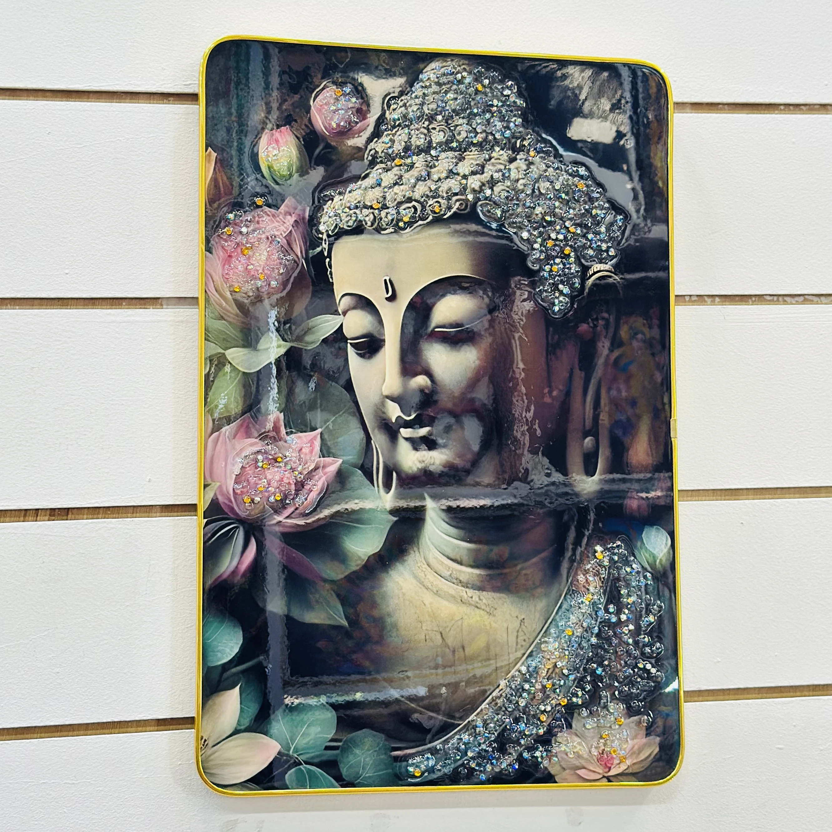 👉Theme :- sparkle laminated or crystal-embedded Buddha wall painting in a gold-slim frame