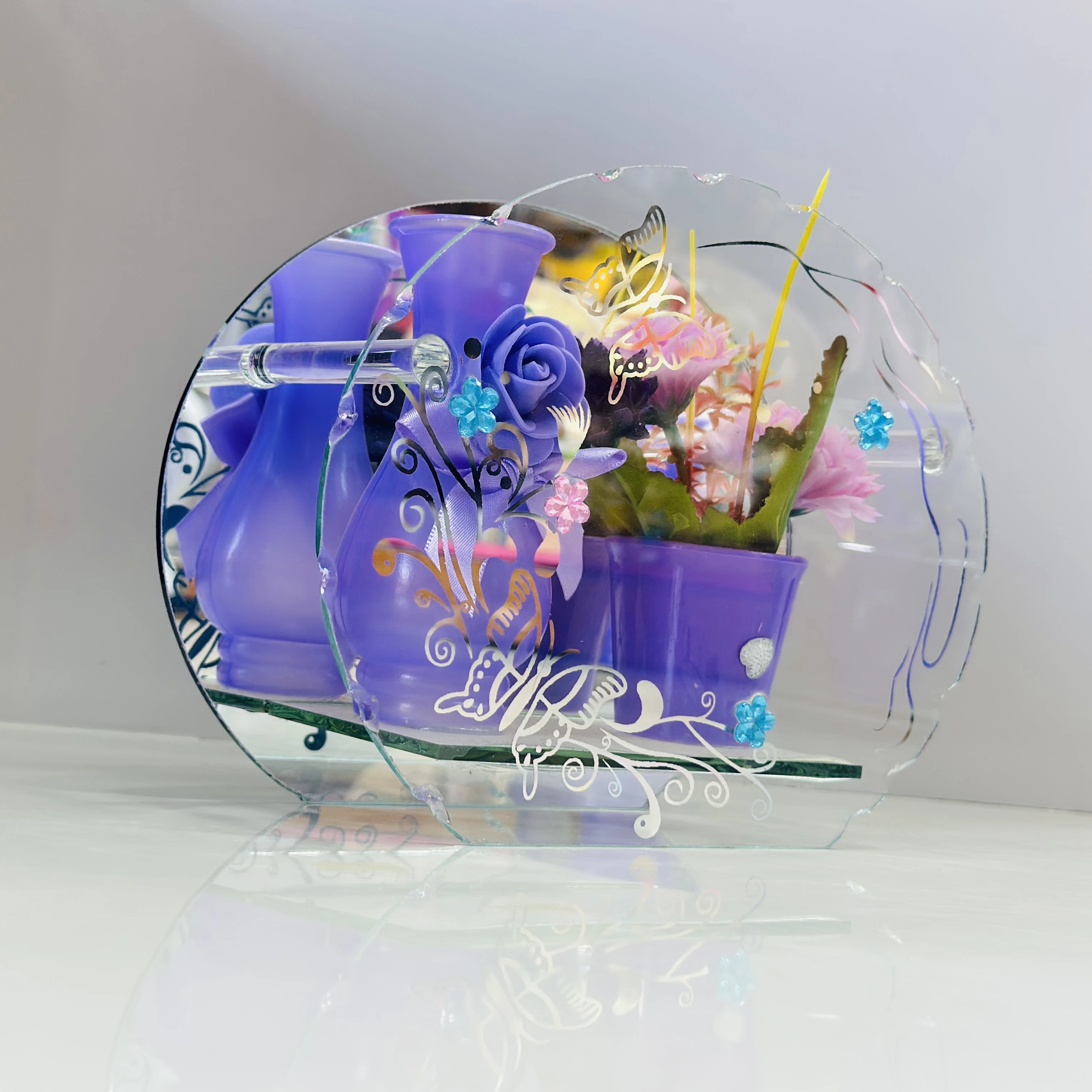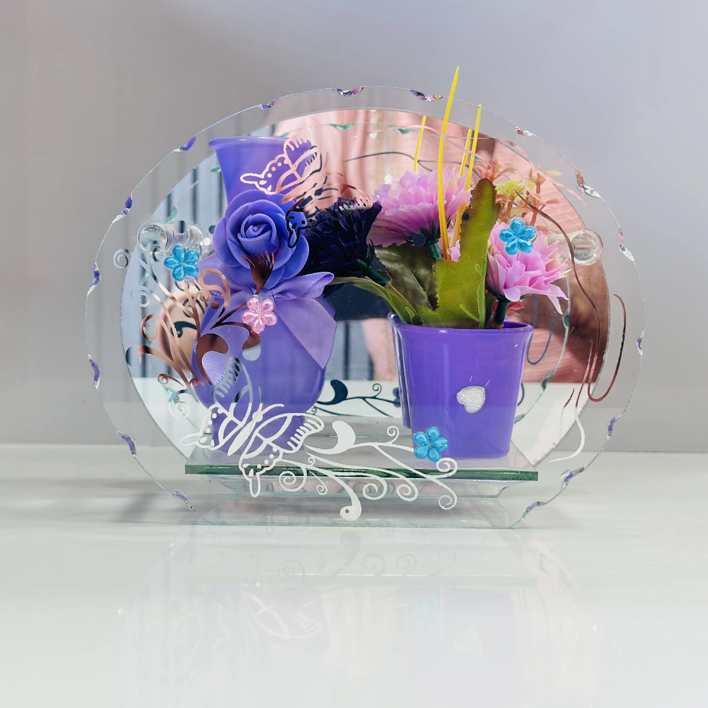 👉 Theme :- decorative glass showpiece with a reflective mirror.
