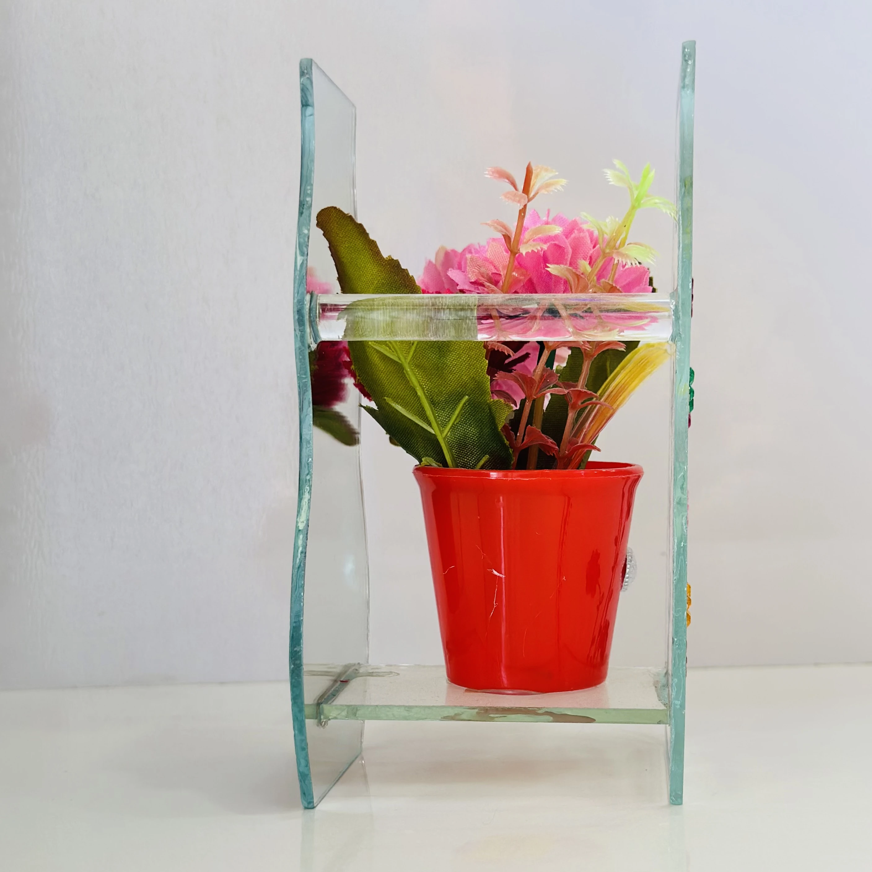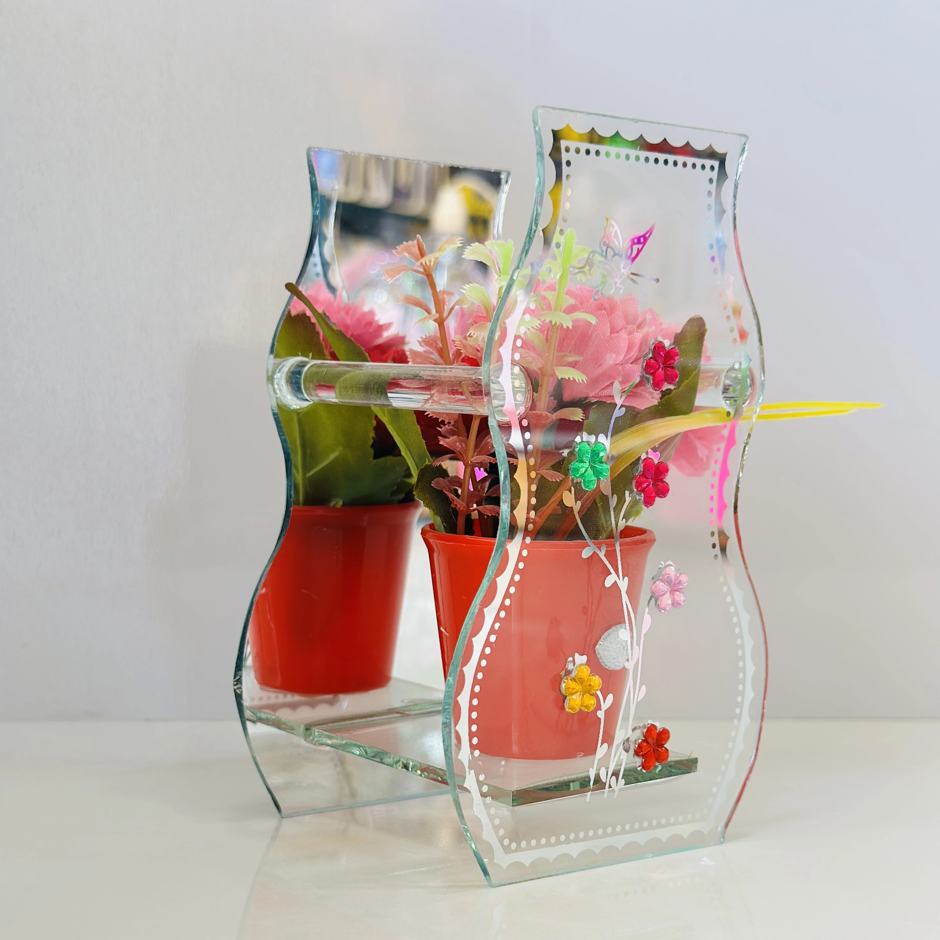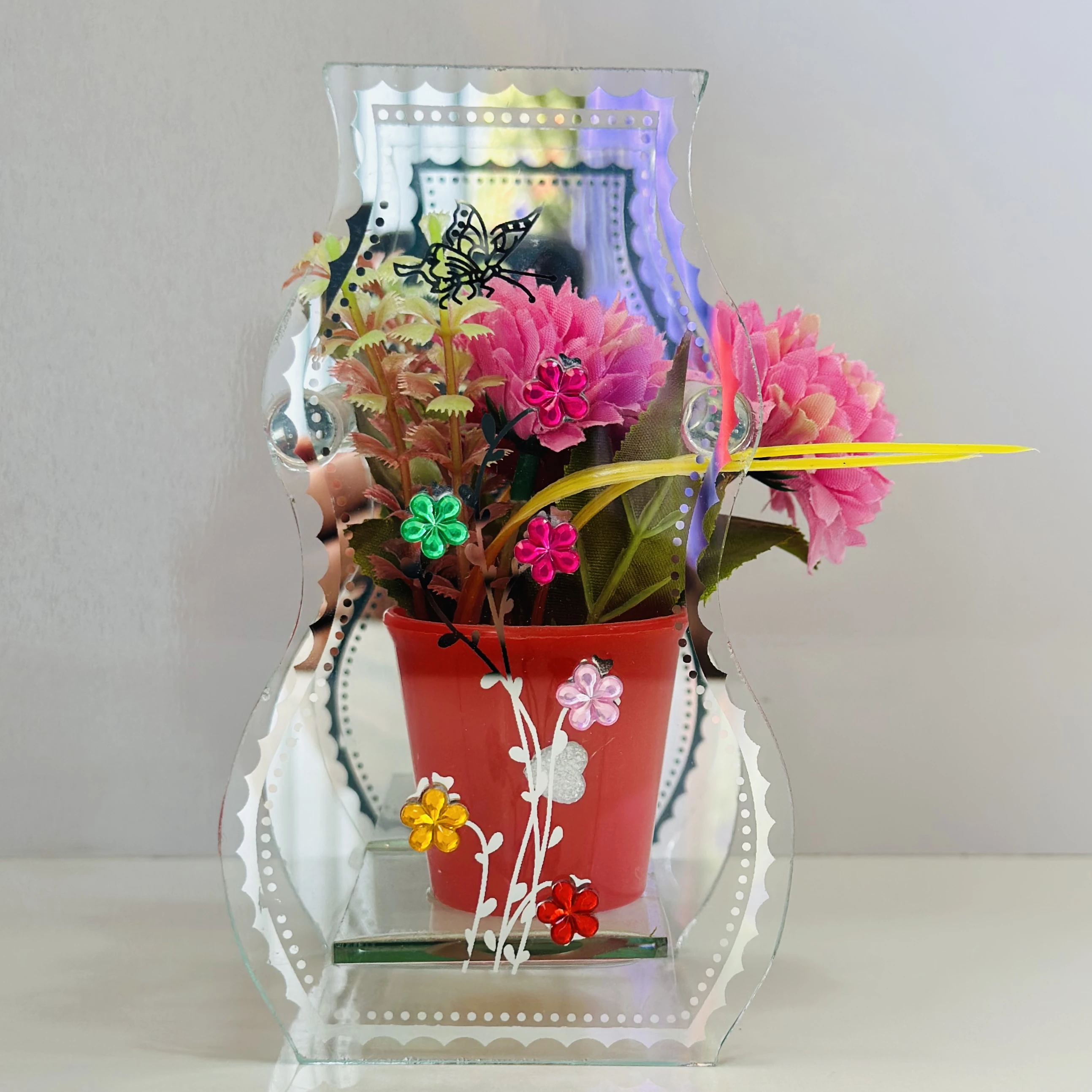 👉 Theme :- decorative glass vase with a purple pot and artificial flowers inside. It is designed to be a centerpiece or a decorative item for a home or office.