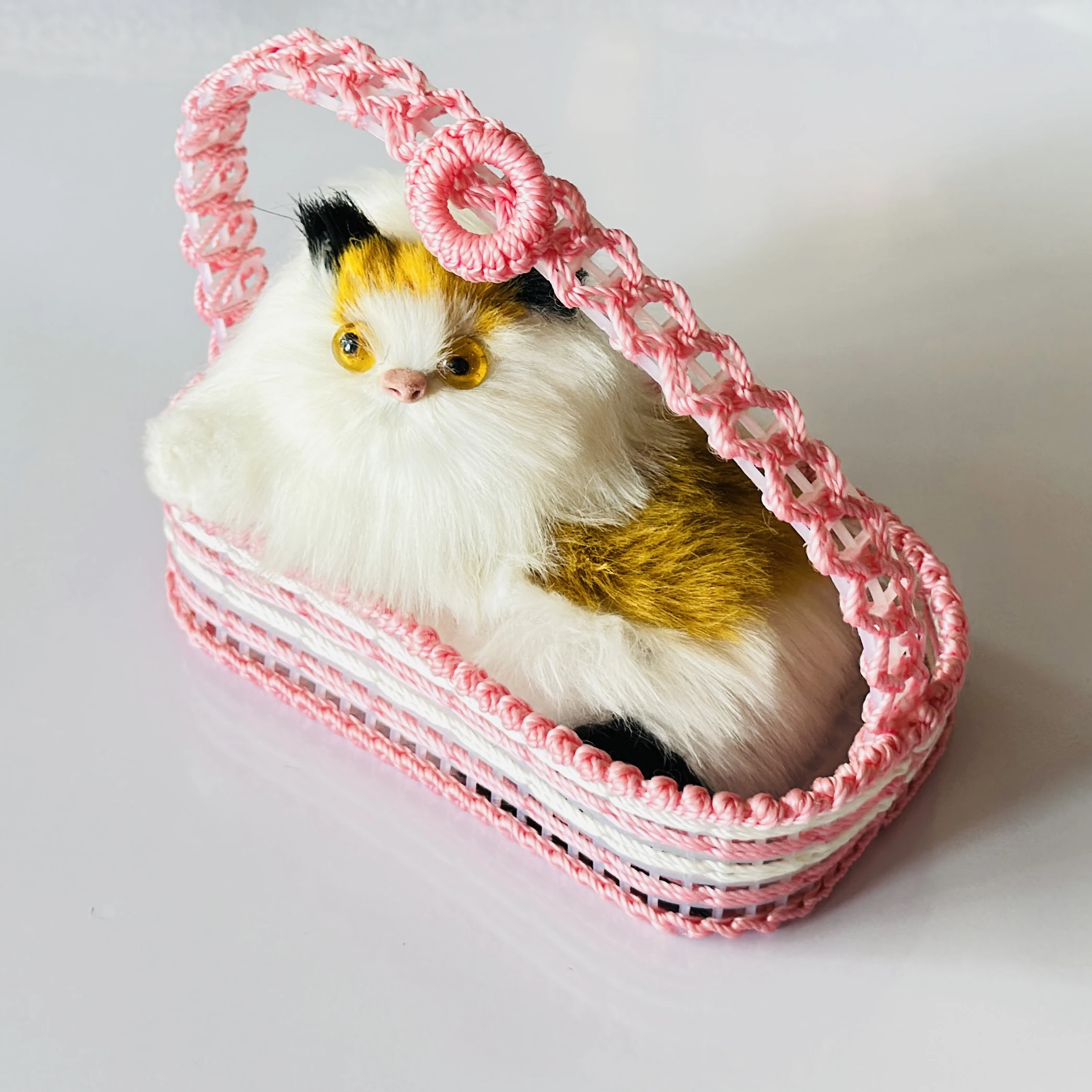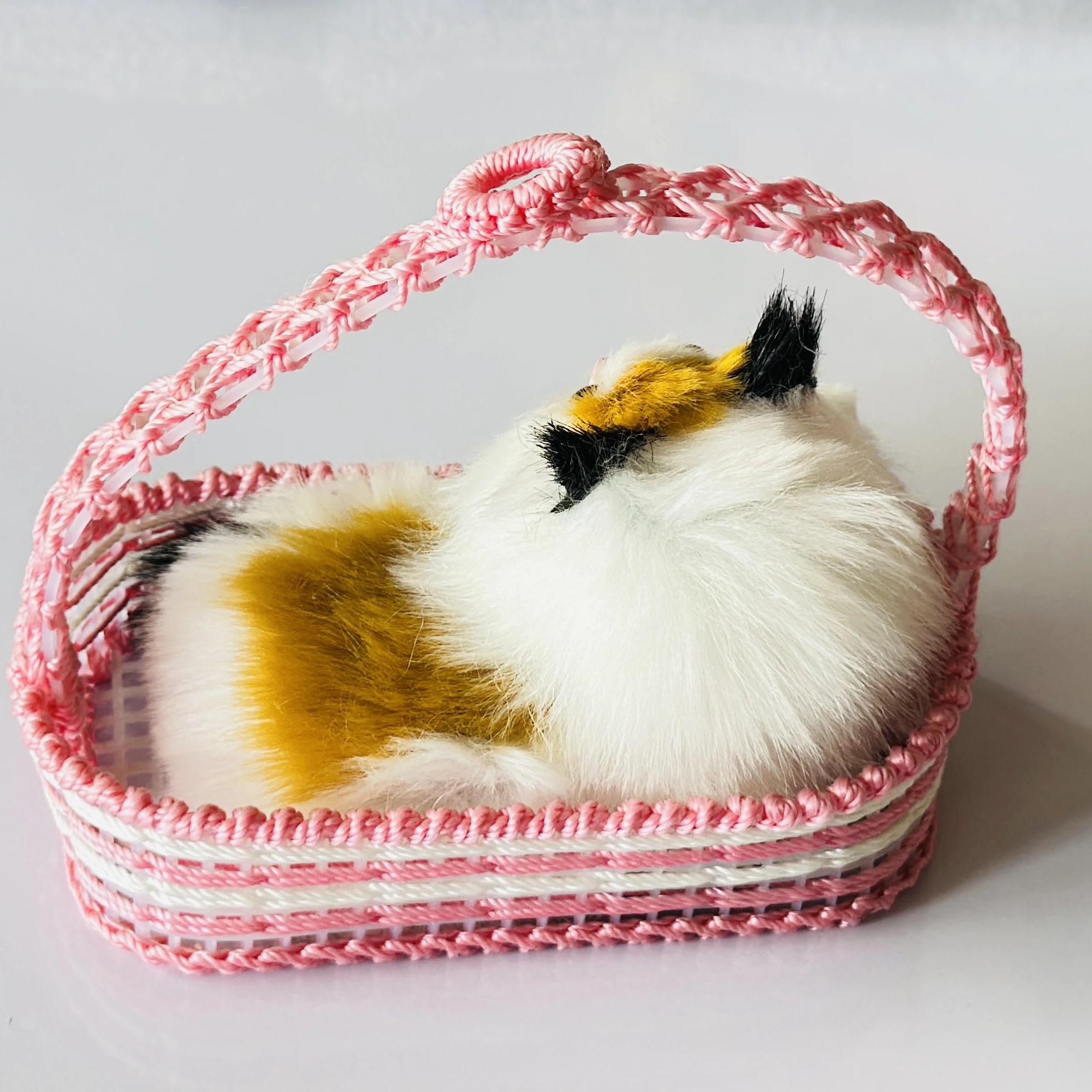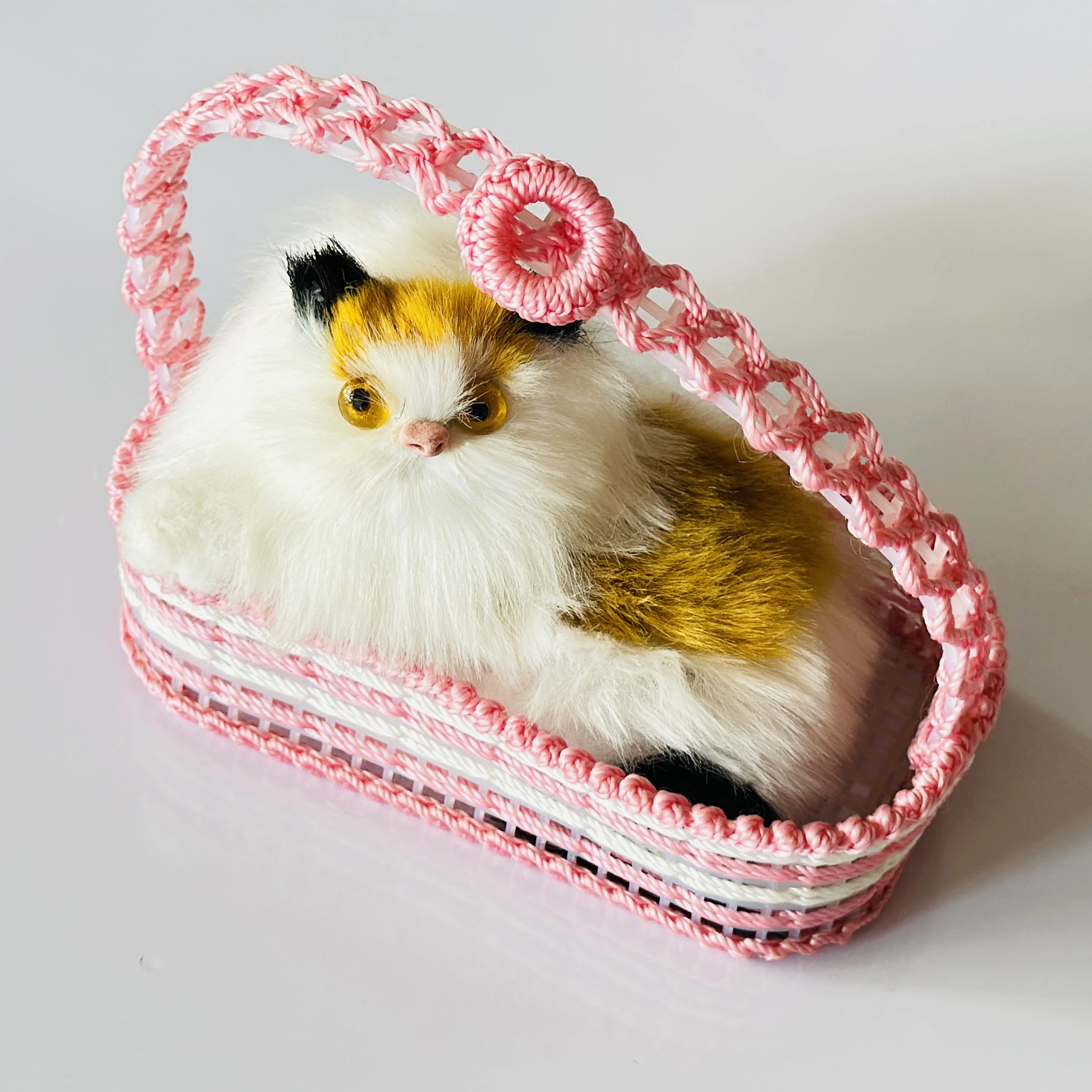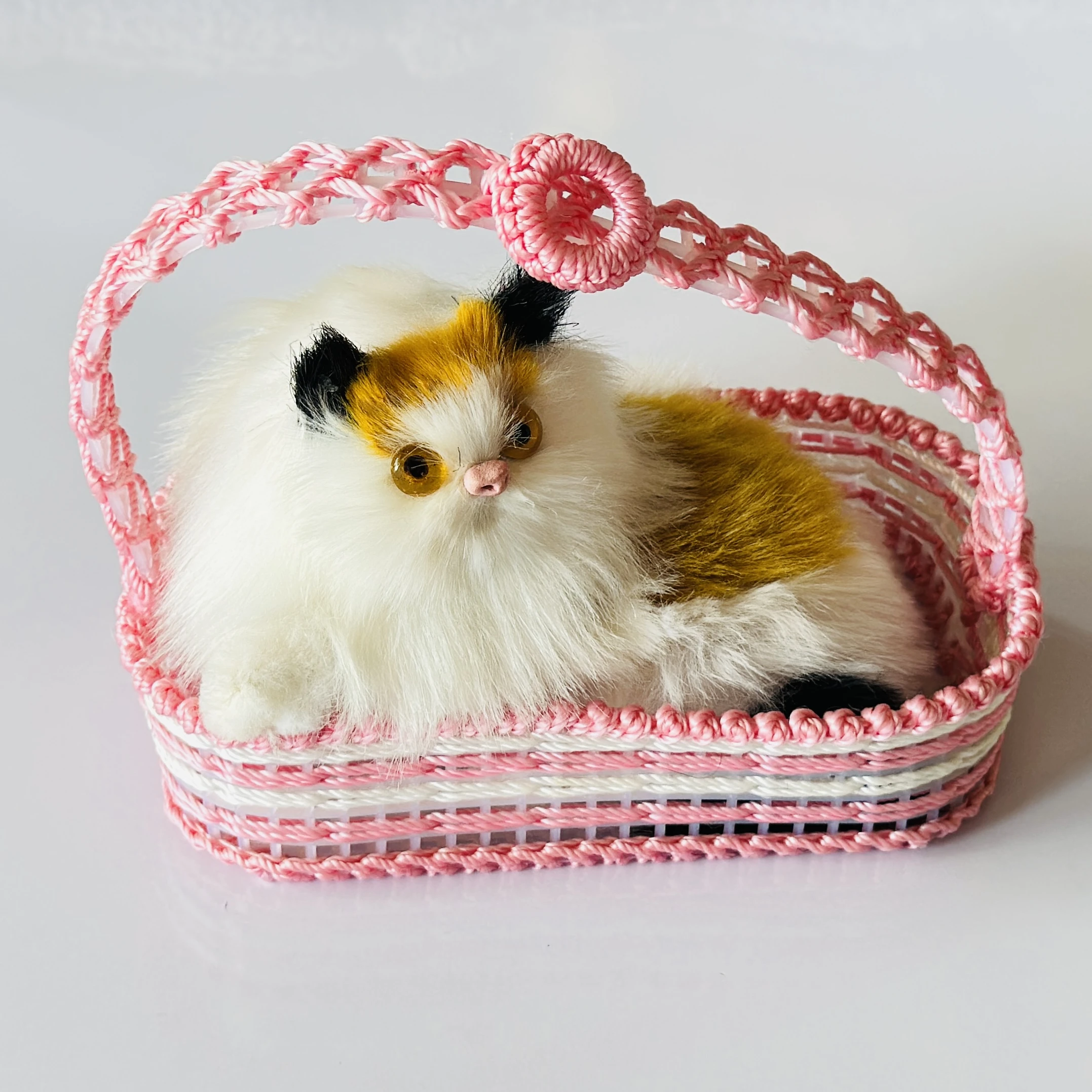 Decorative showpiece featuring a plush cat sitting inside a pink woven basket