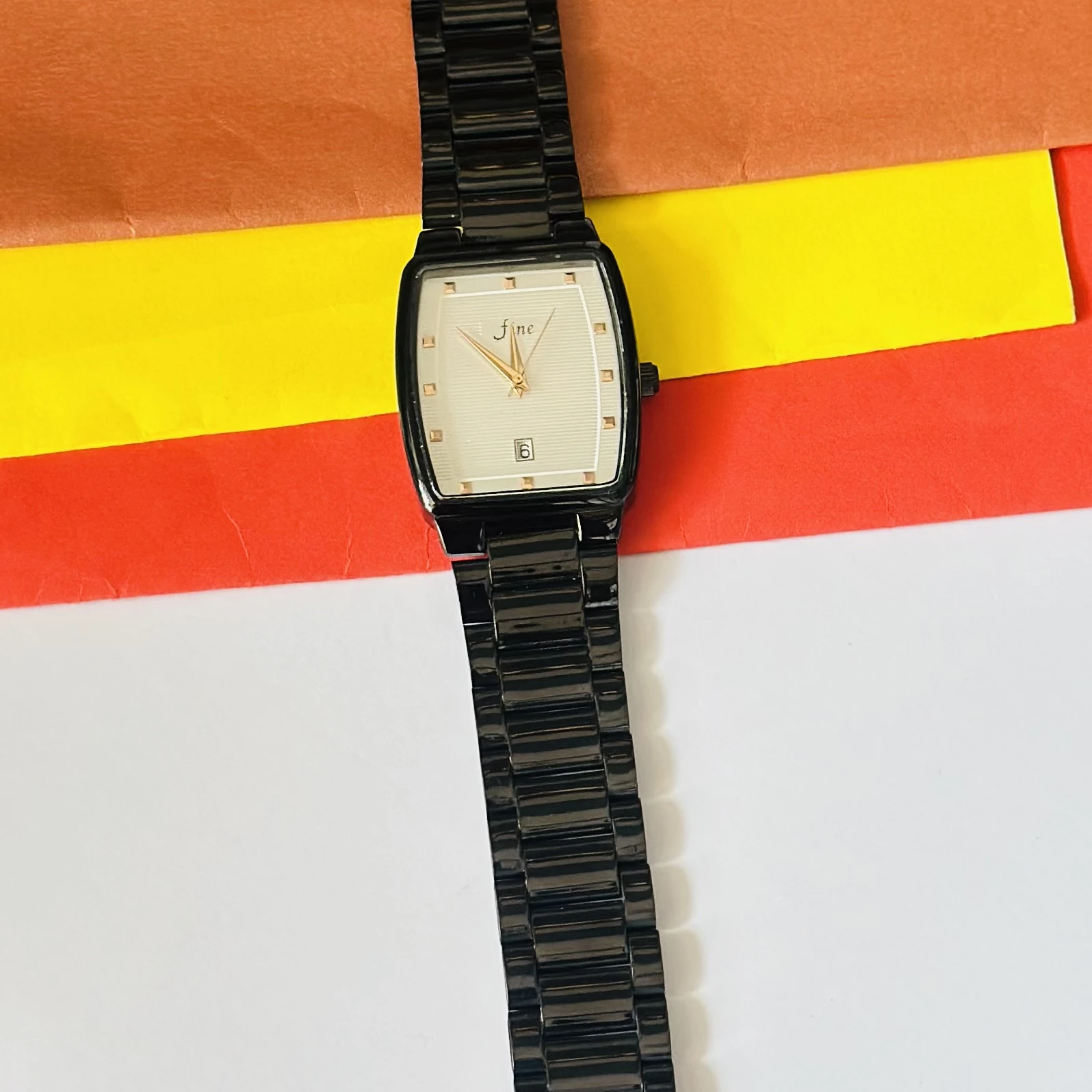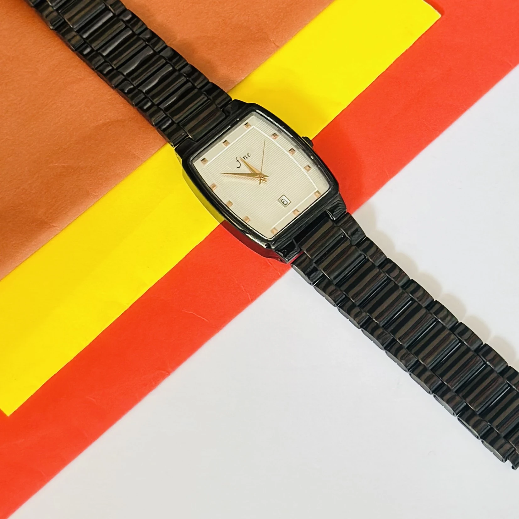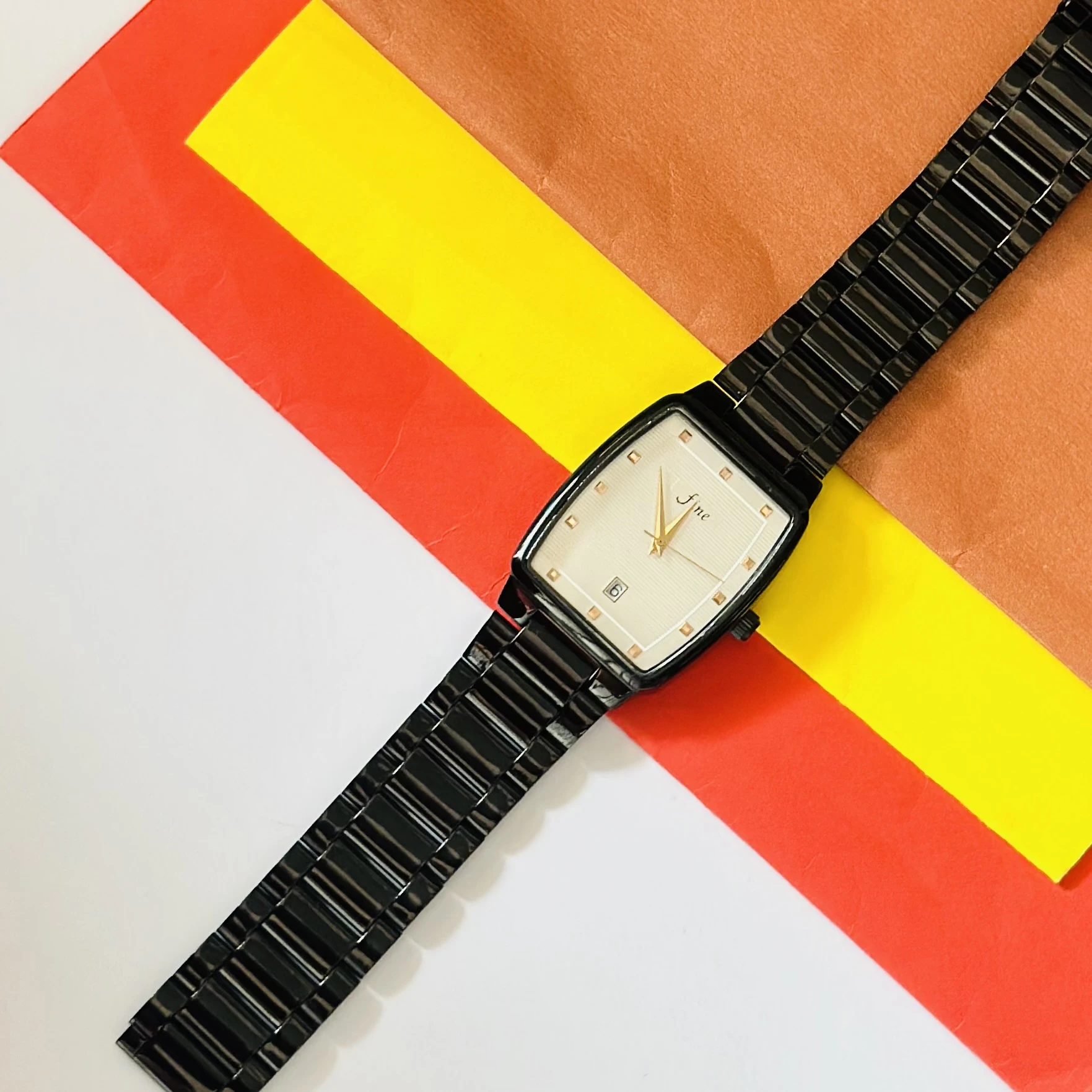 👉 Theme :- Edge analog watch for men with a rectangular black dial and a black stainless steel strap.