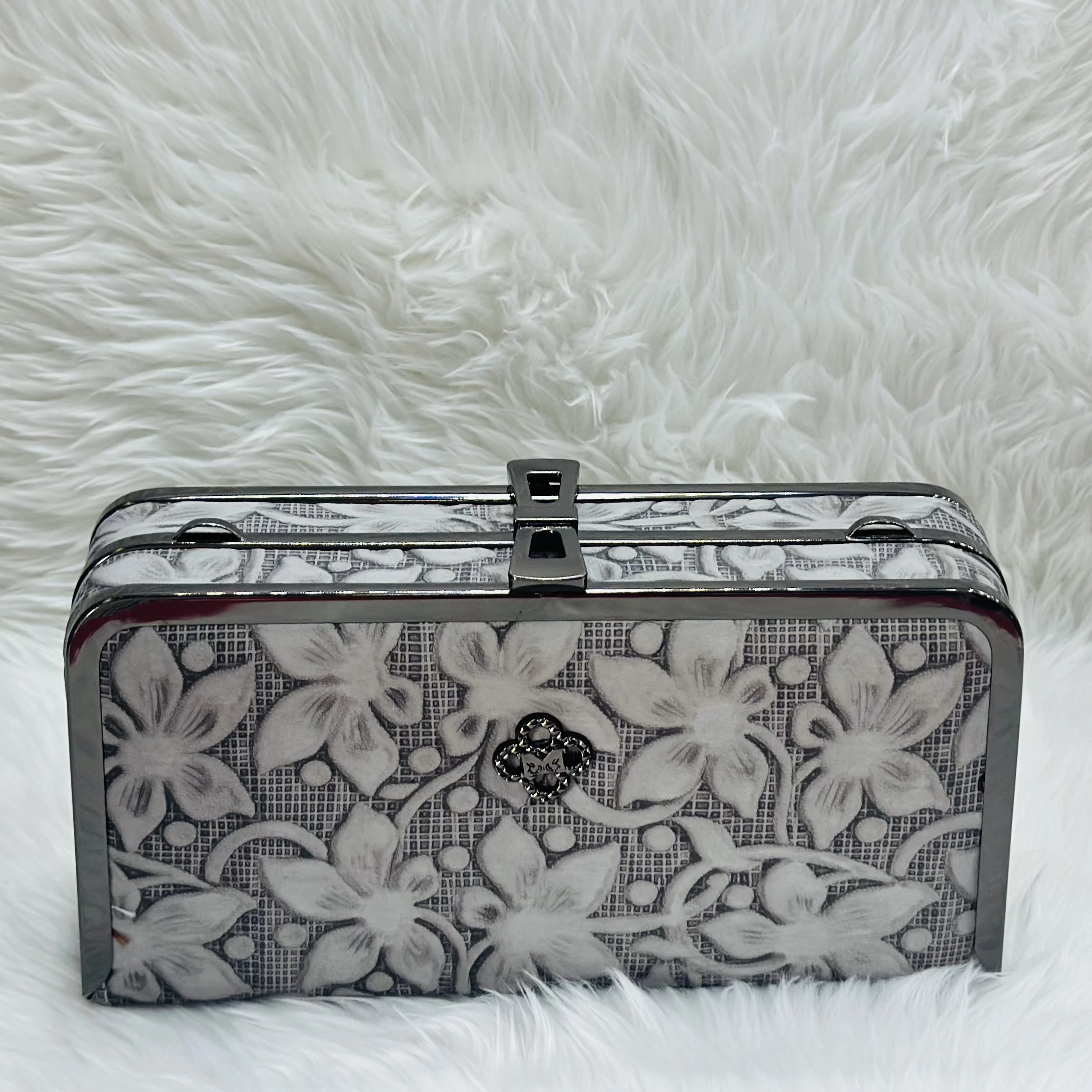 π Theme :- Embellished box clutch bag with a black metal frame and a floral pattern.