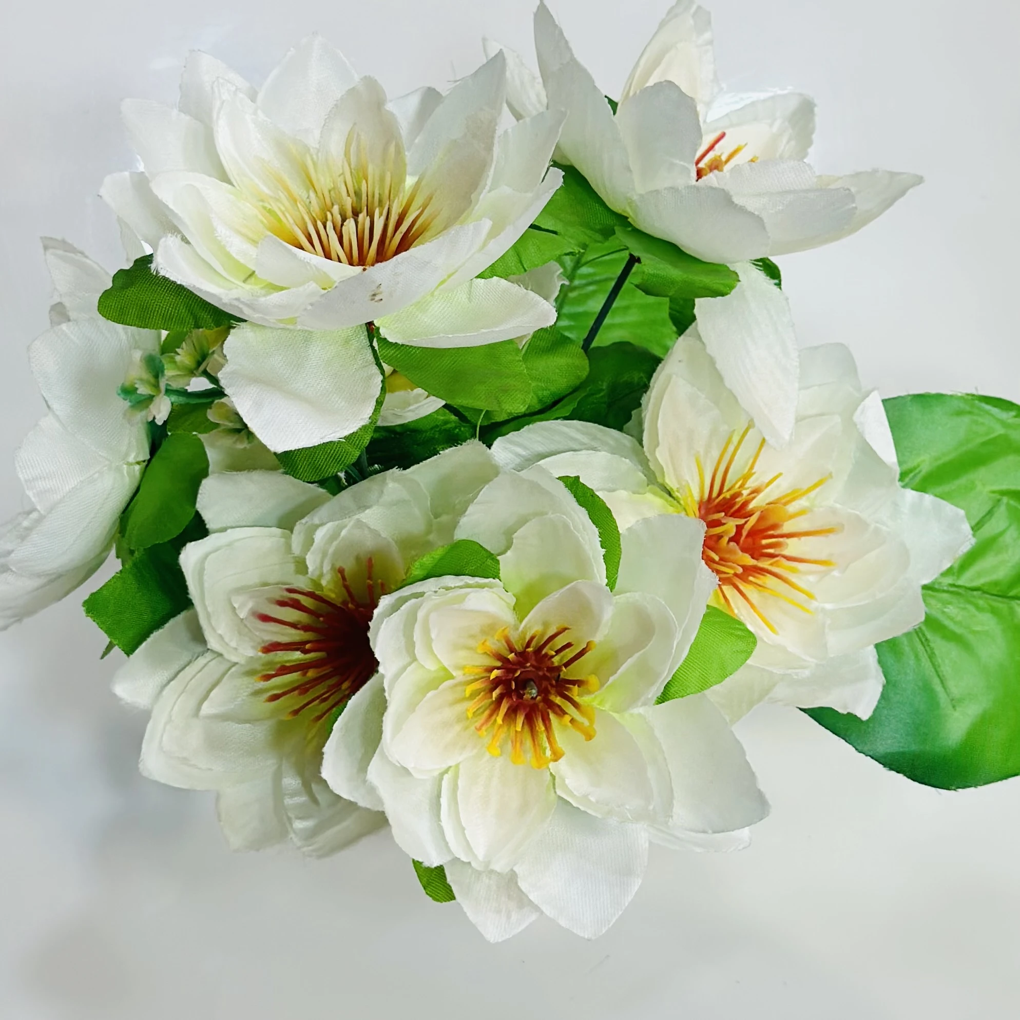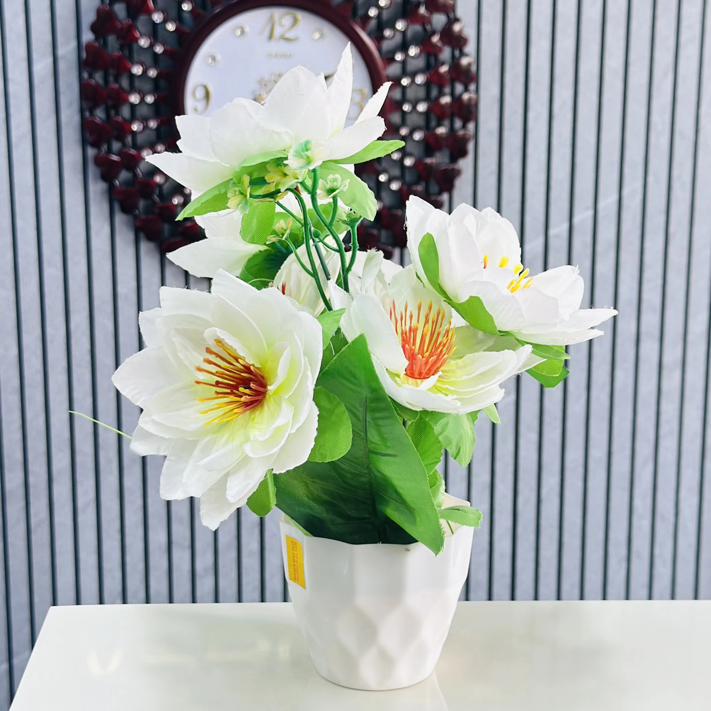 👉 Theme :- An artificial carnation flower arrangement in a white pot.