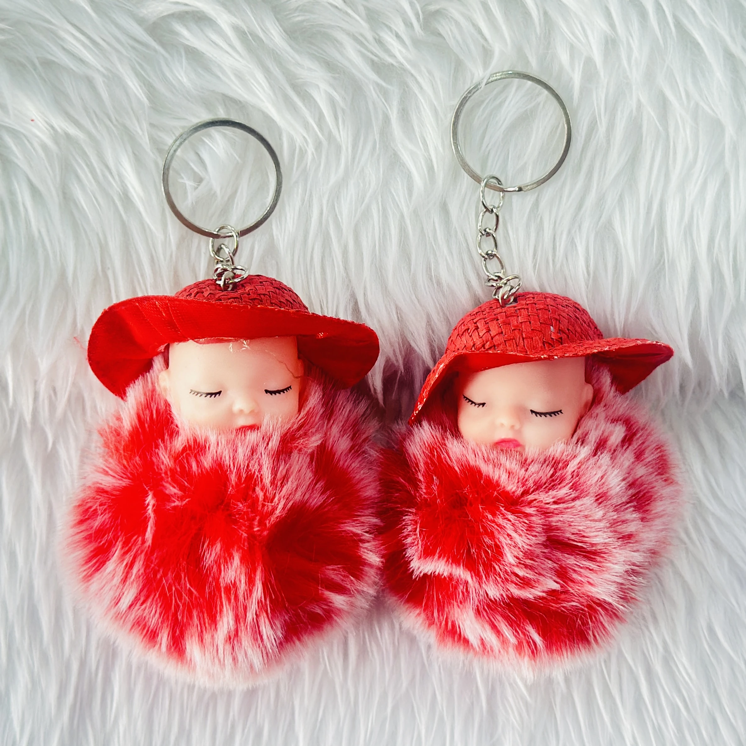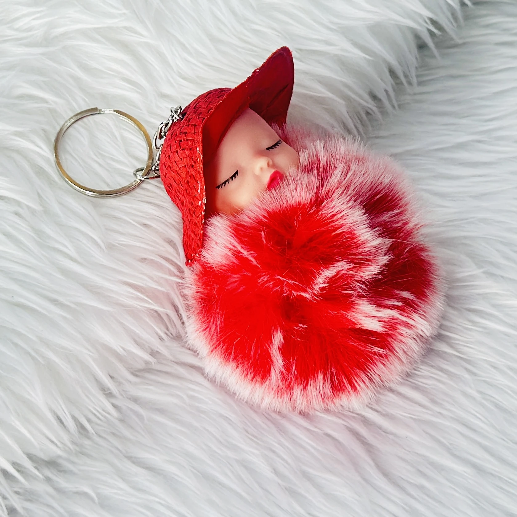 fluffy charm is a red and white SRG sleeping baby doll keychain