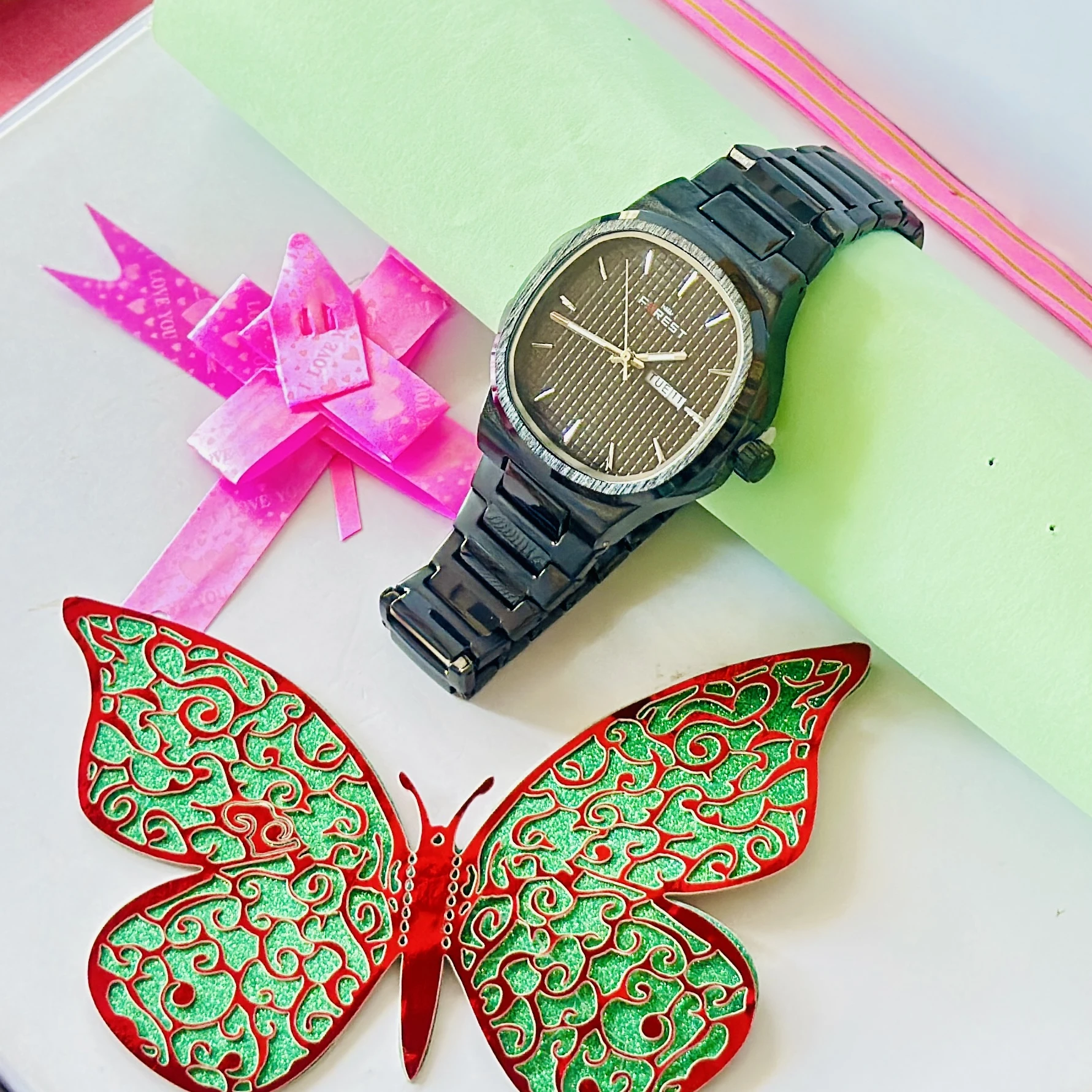 👉 Theme :- Forest brand analog watch features a black dial and a matching black metal strap.