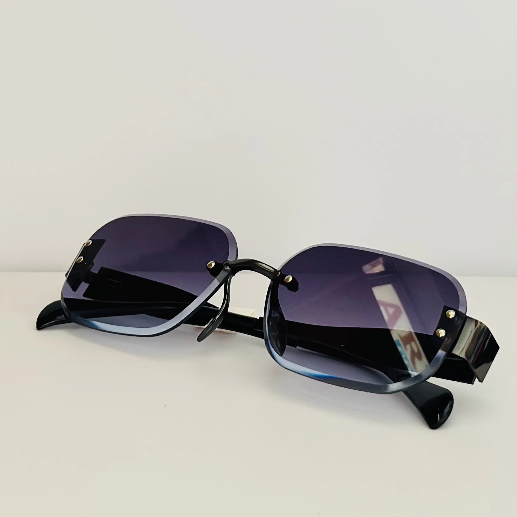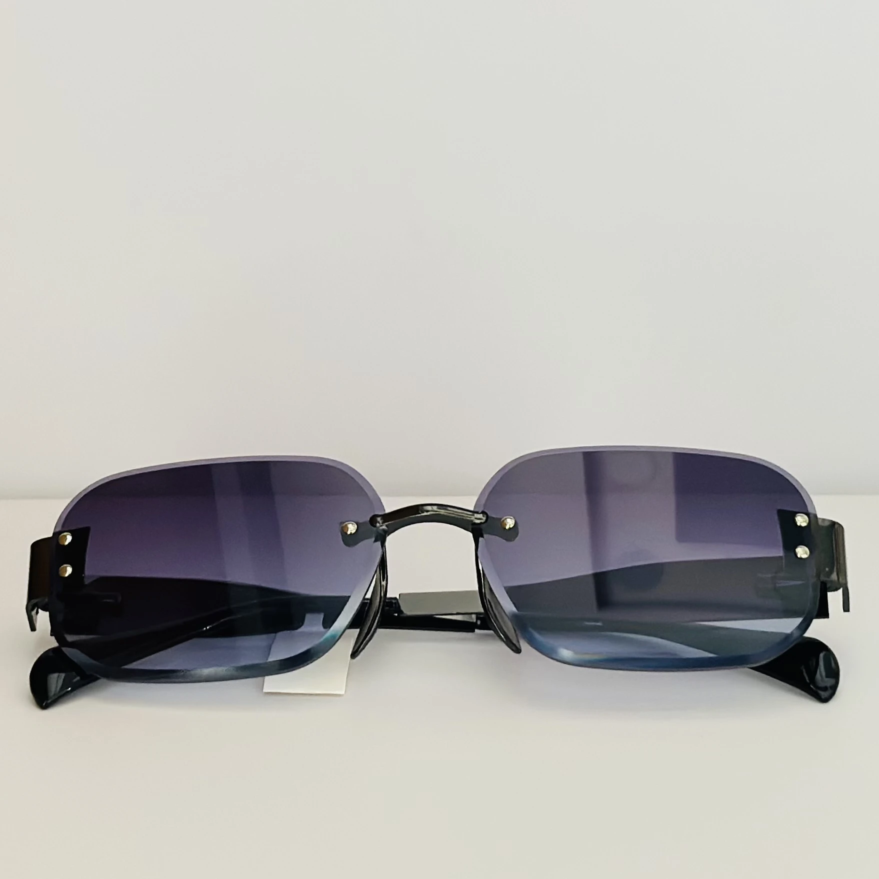 👉 Theme :- Fremeless cut-edge sunglasses with black temples and a gradient tint.