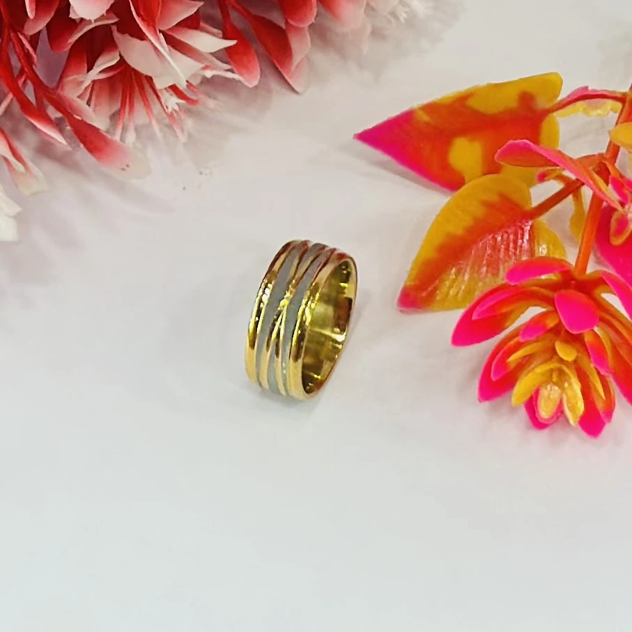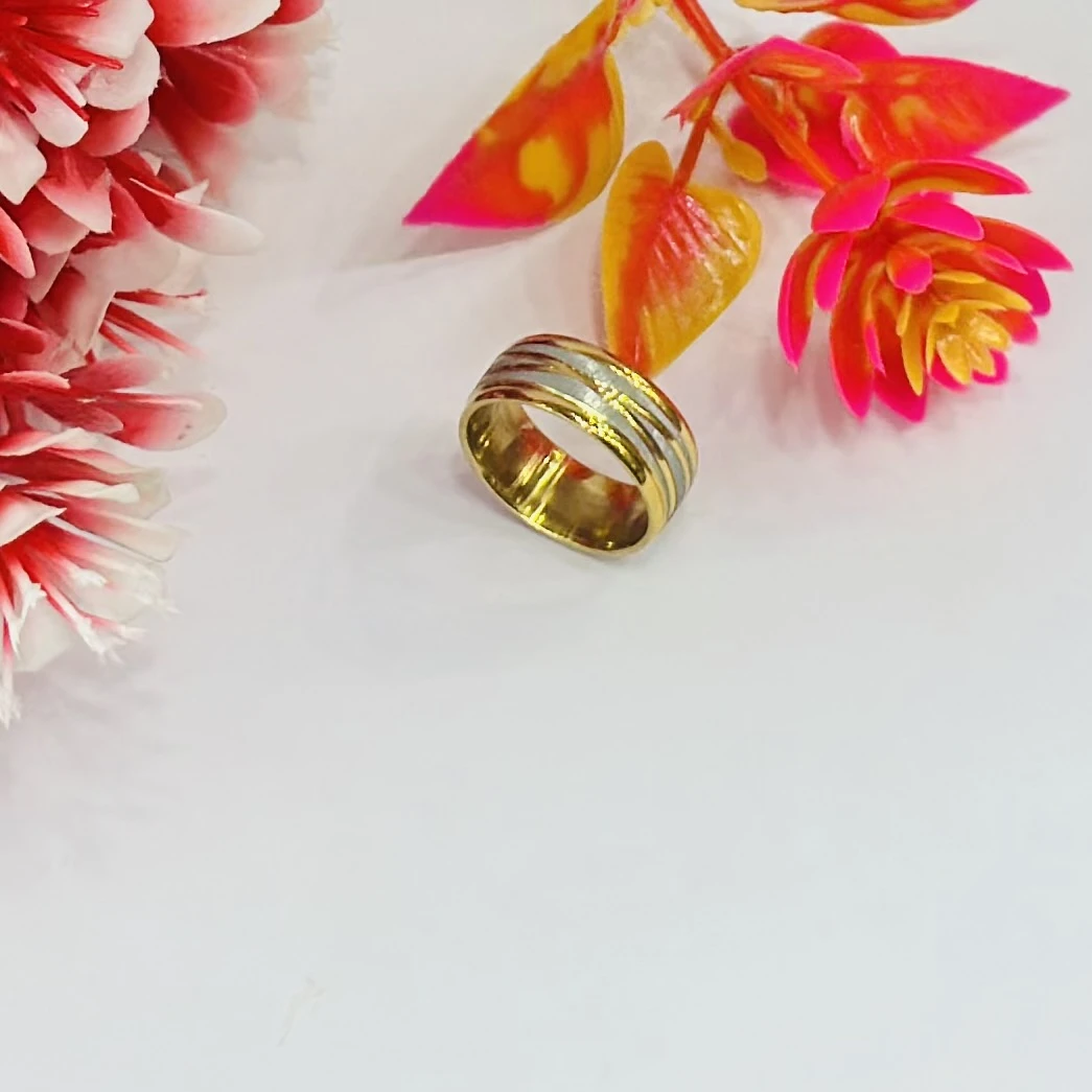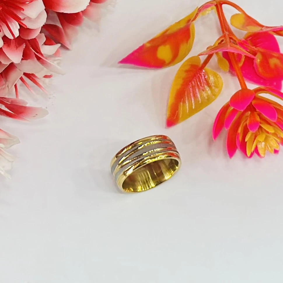 👉 Theme :- Gold and silver-toned stainless steel dual-edge wedding band with a brushed finish