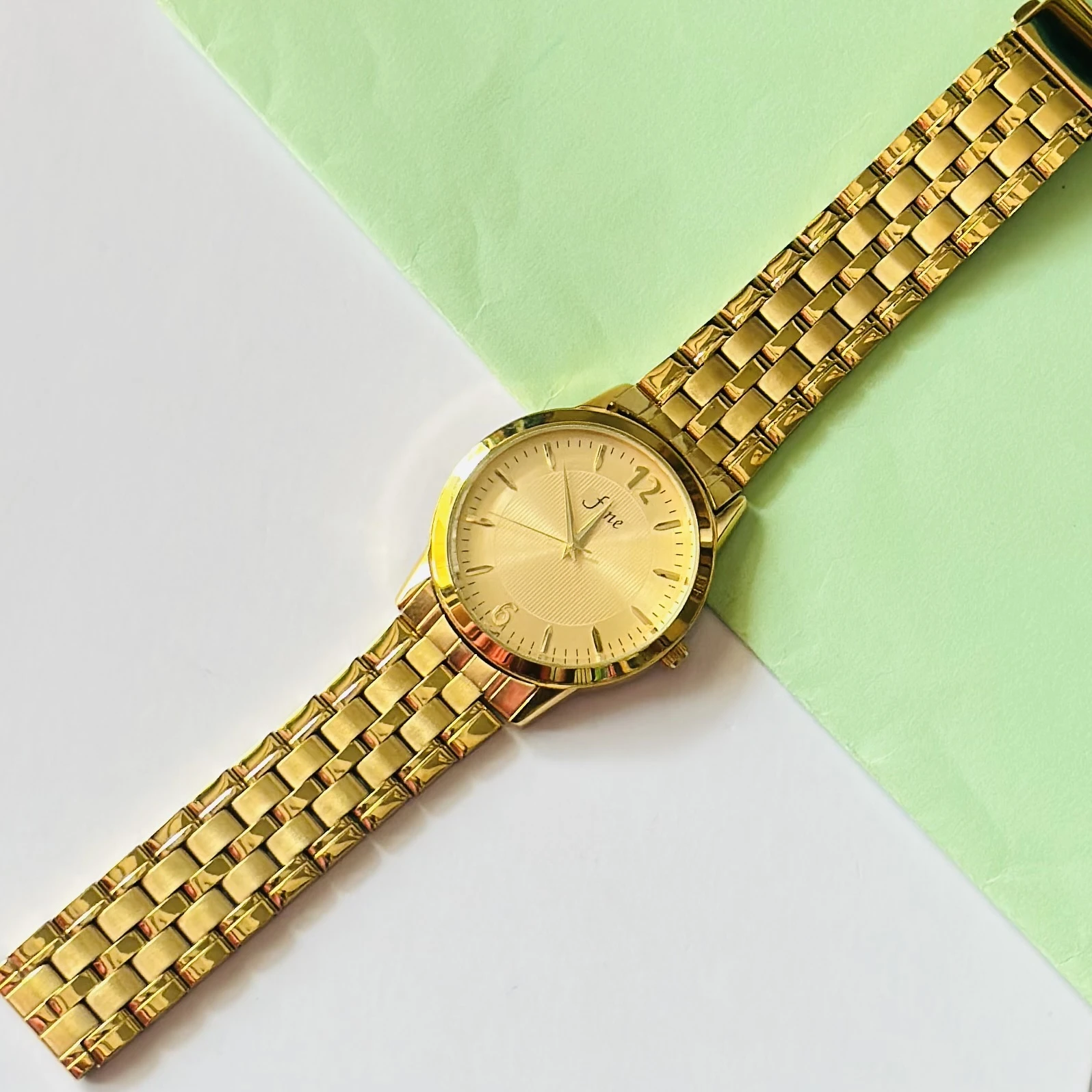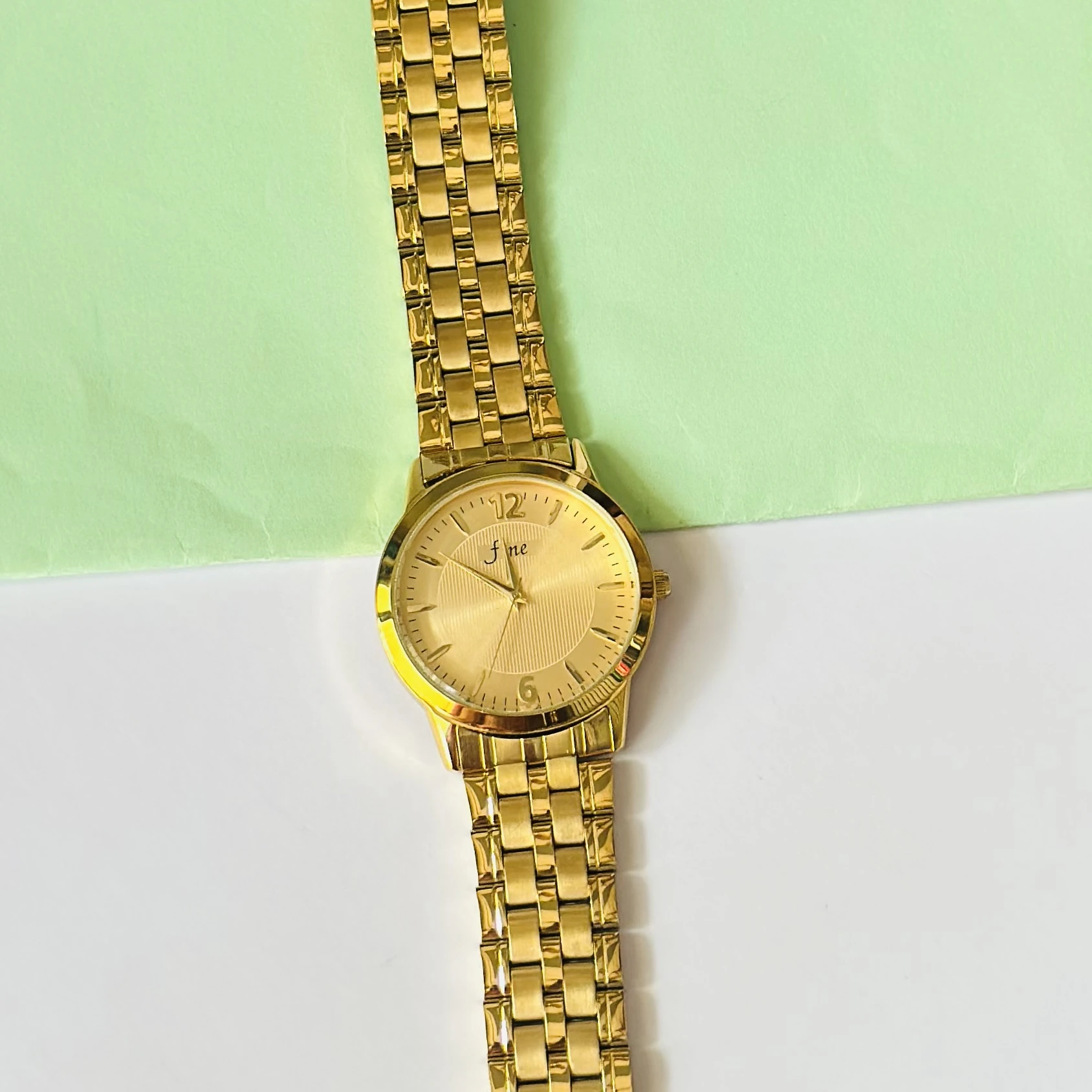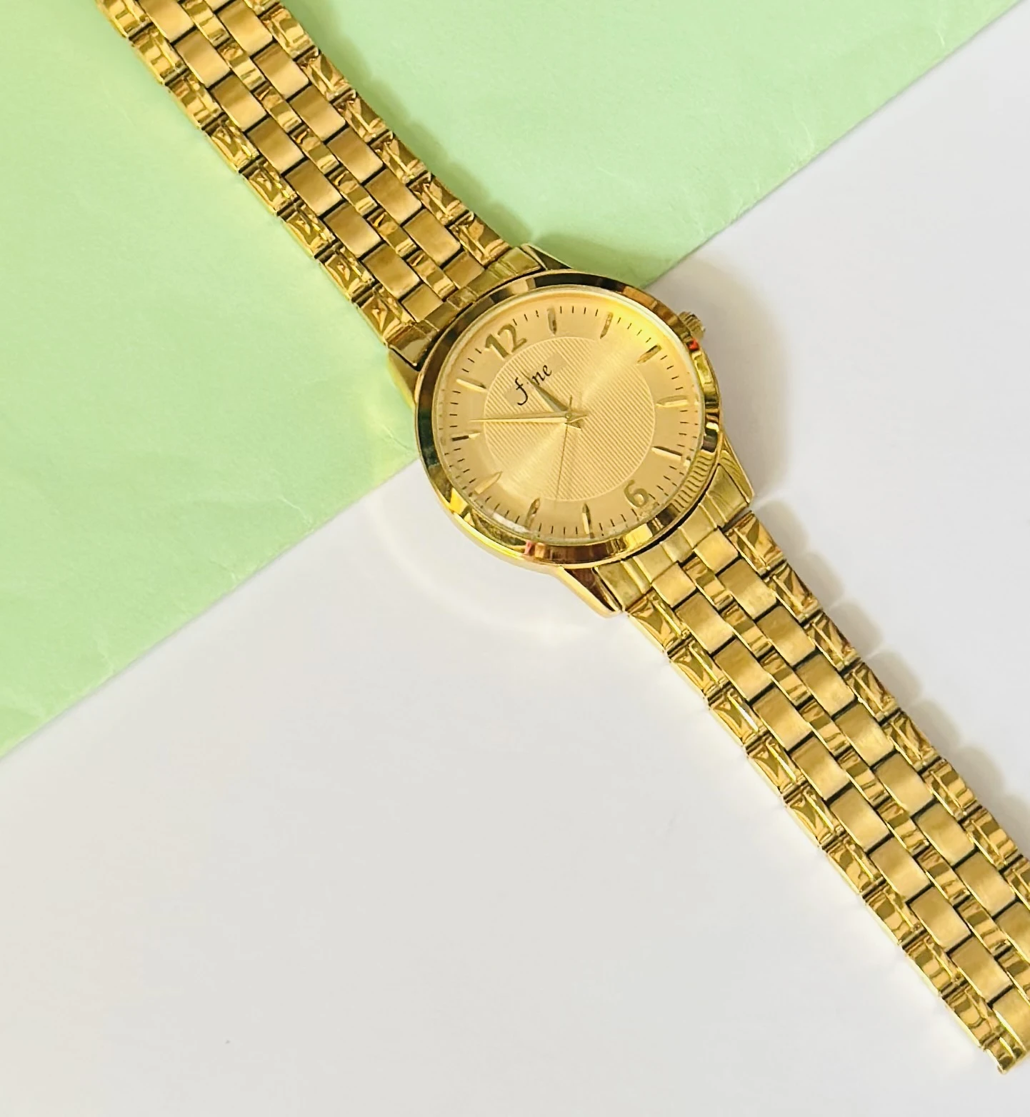 👉 Theme :- Gold-plated analogue quartz watch with a metal strap.