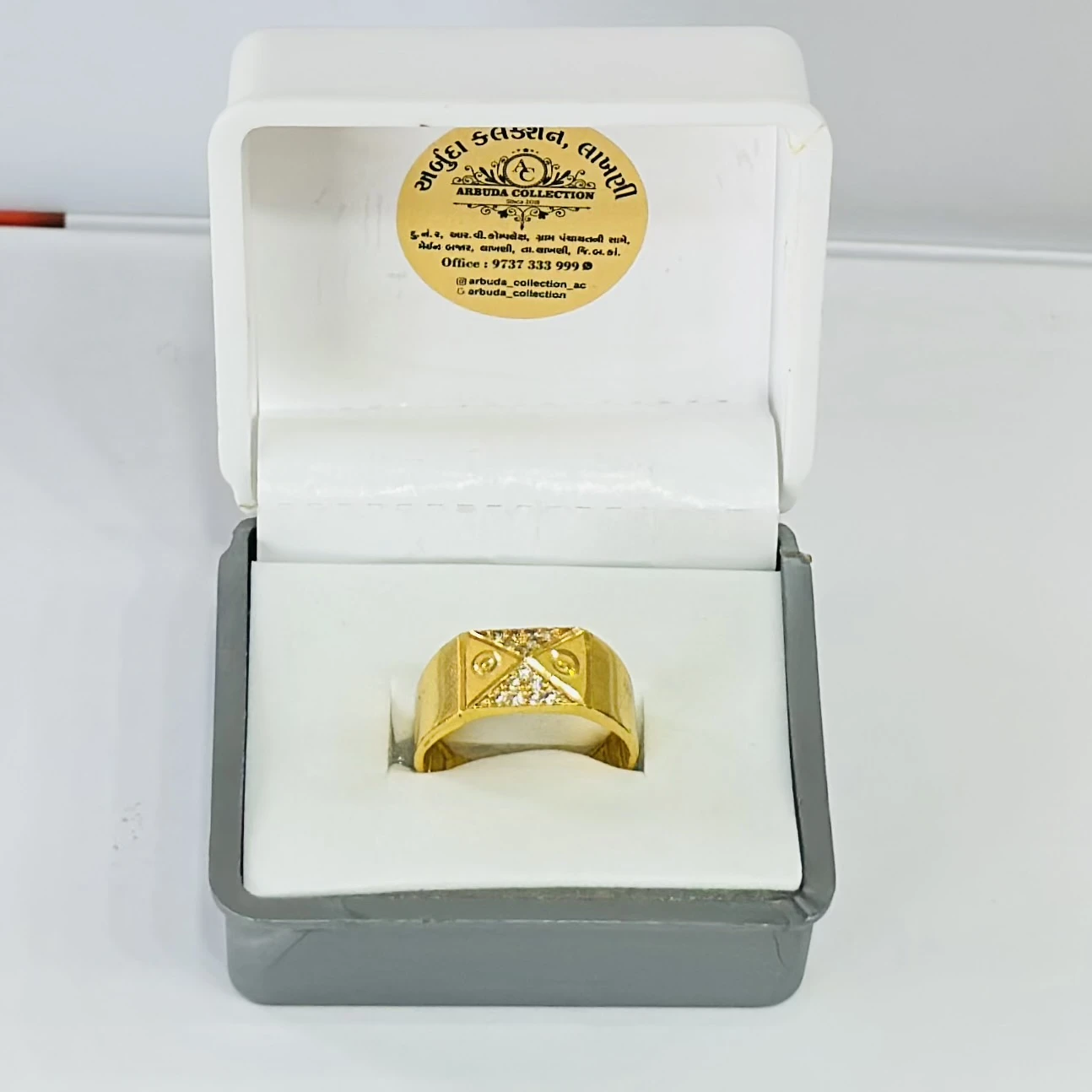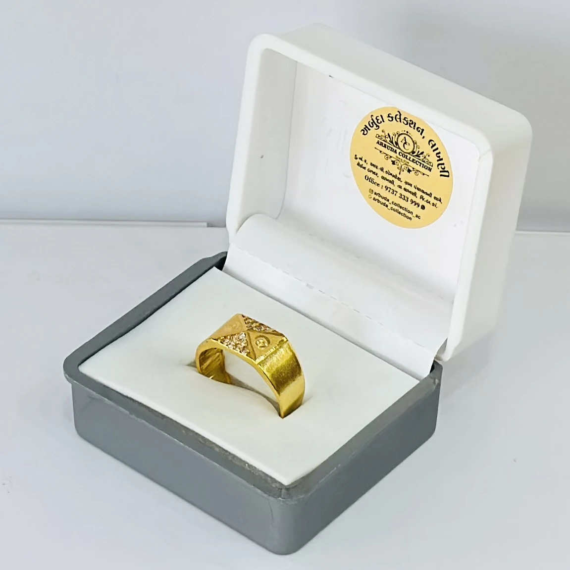 👉 Theme :- Gold gent's ring with a textured design and diamond accents.