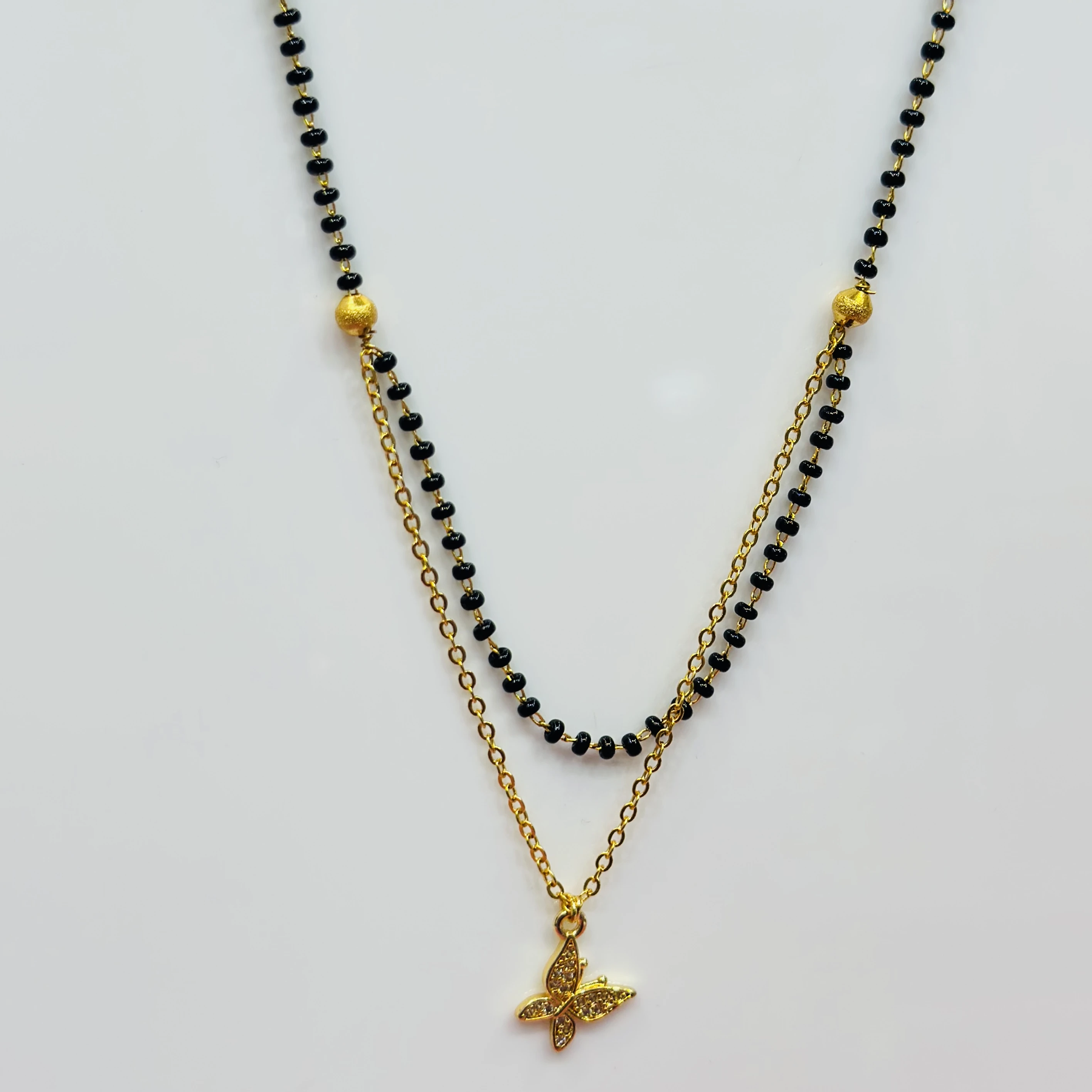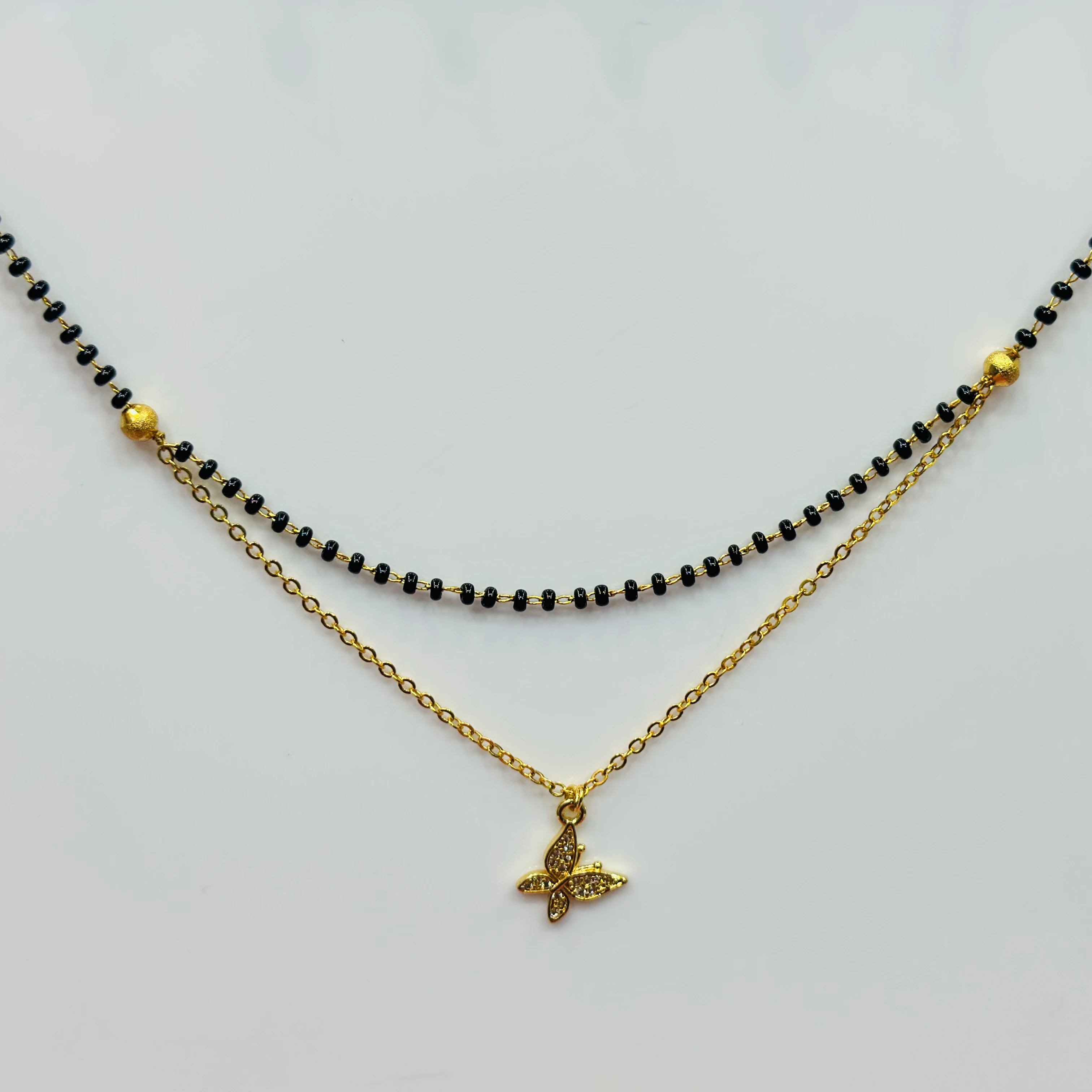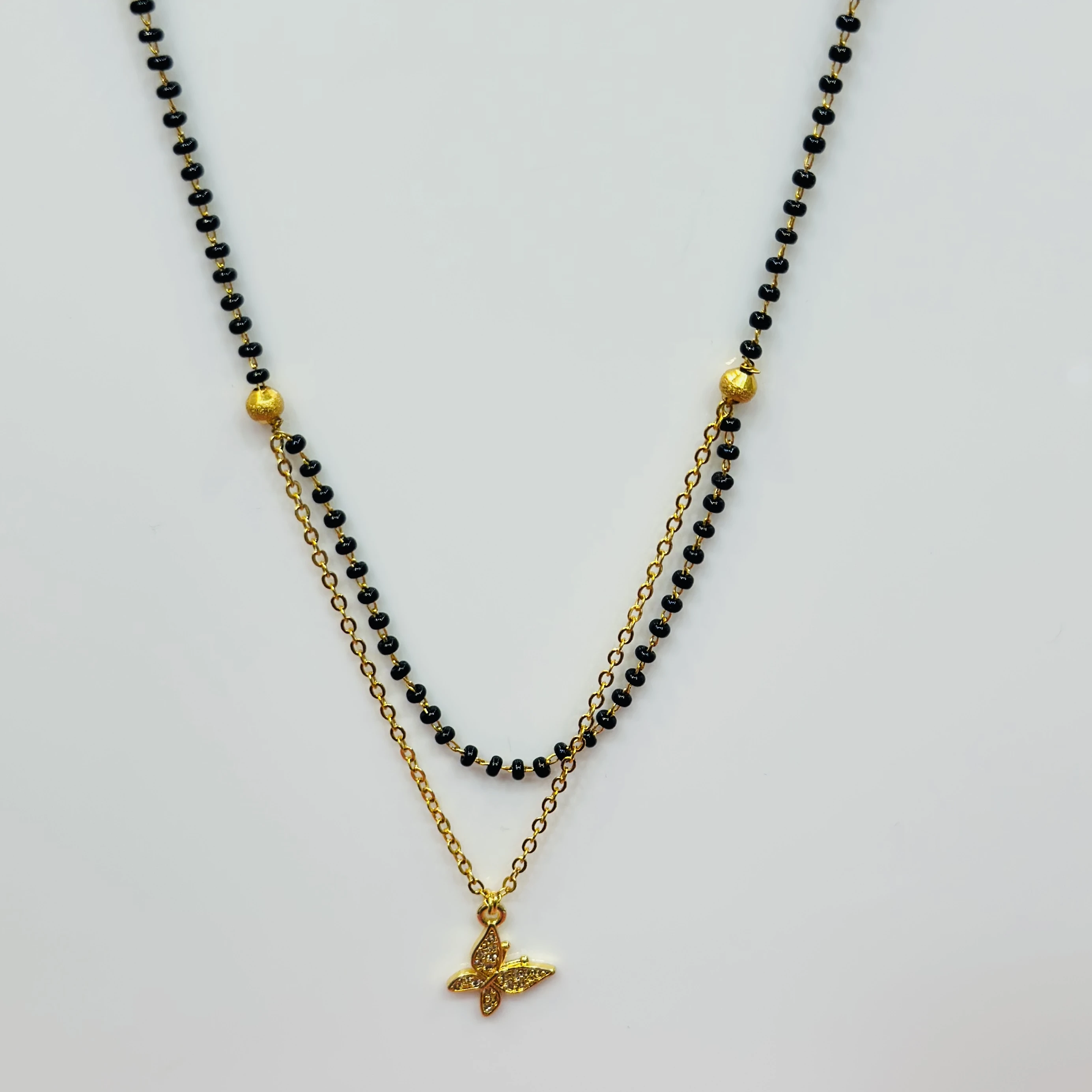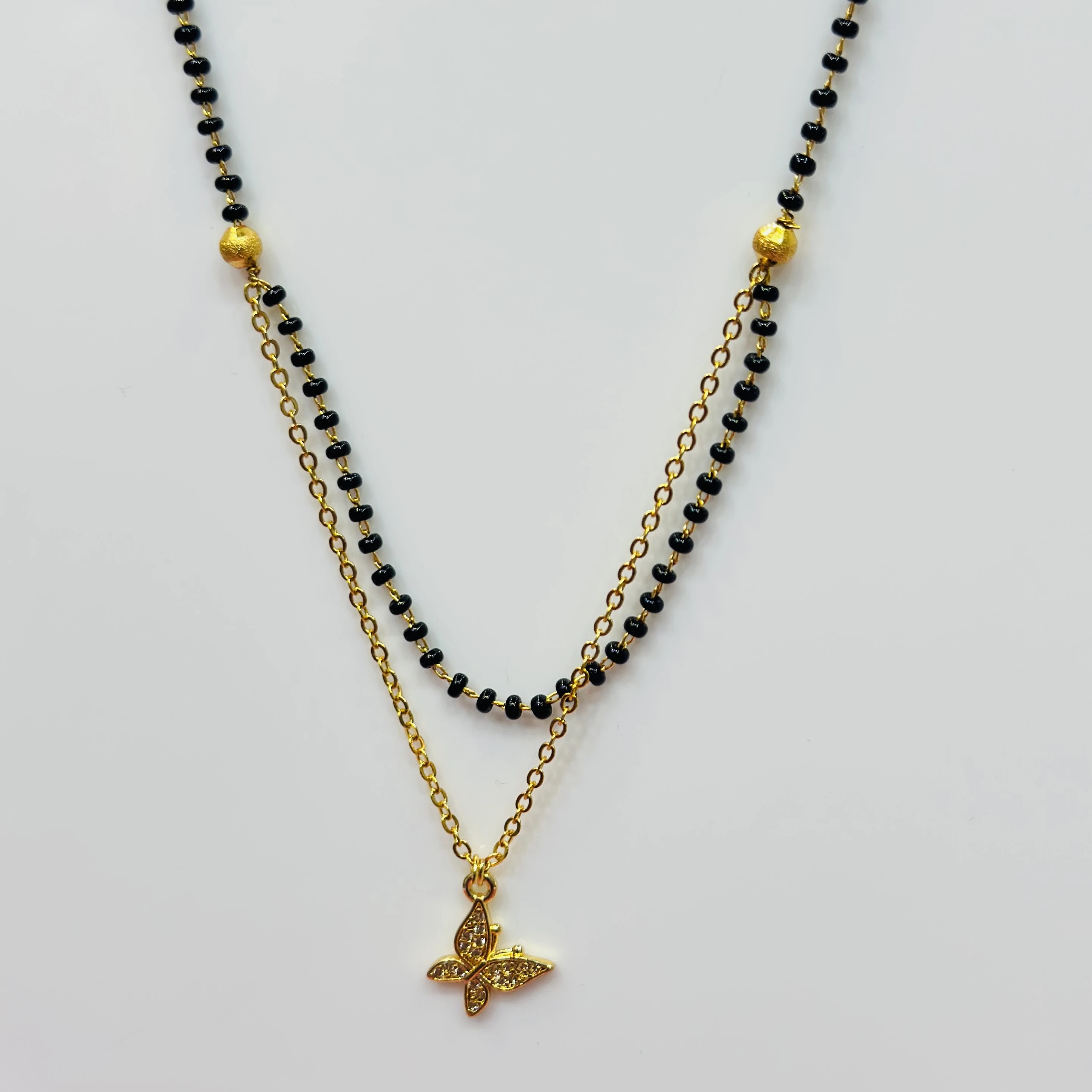 👉Theme :- gold-plated mangalsutra with black beads and a butterfly pendant.