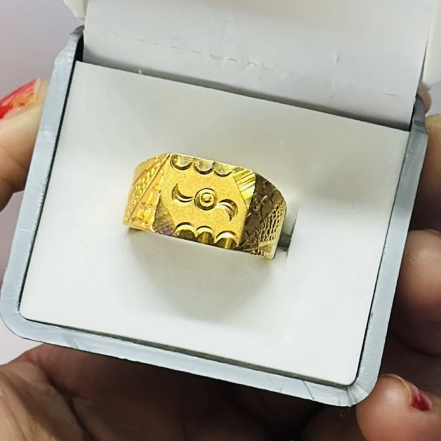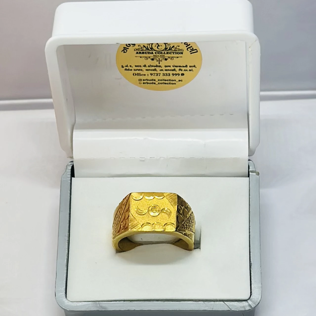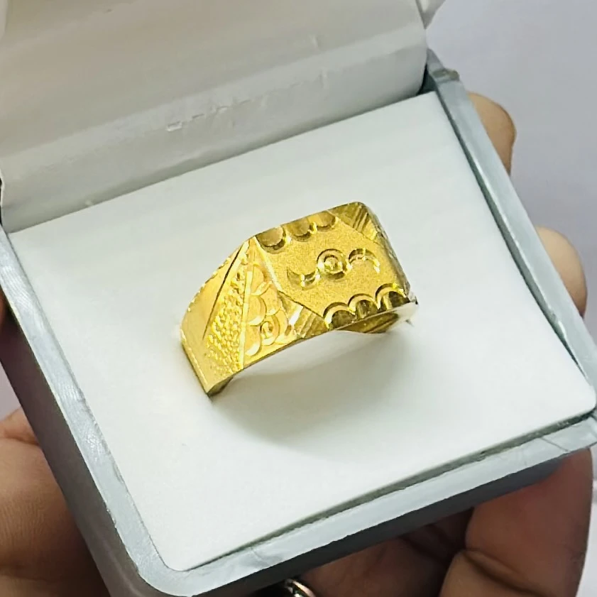 👉 Theme :- Gold plated men's ring with a square face featuring a grid of small, clear stones.