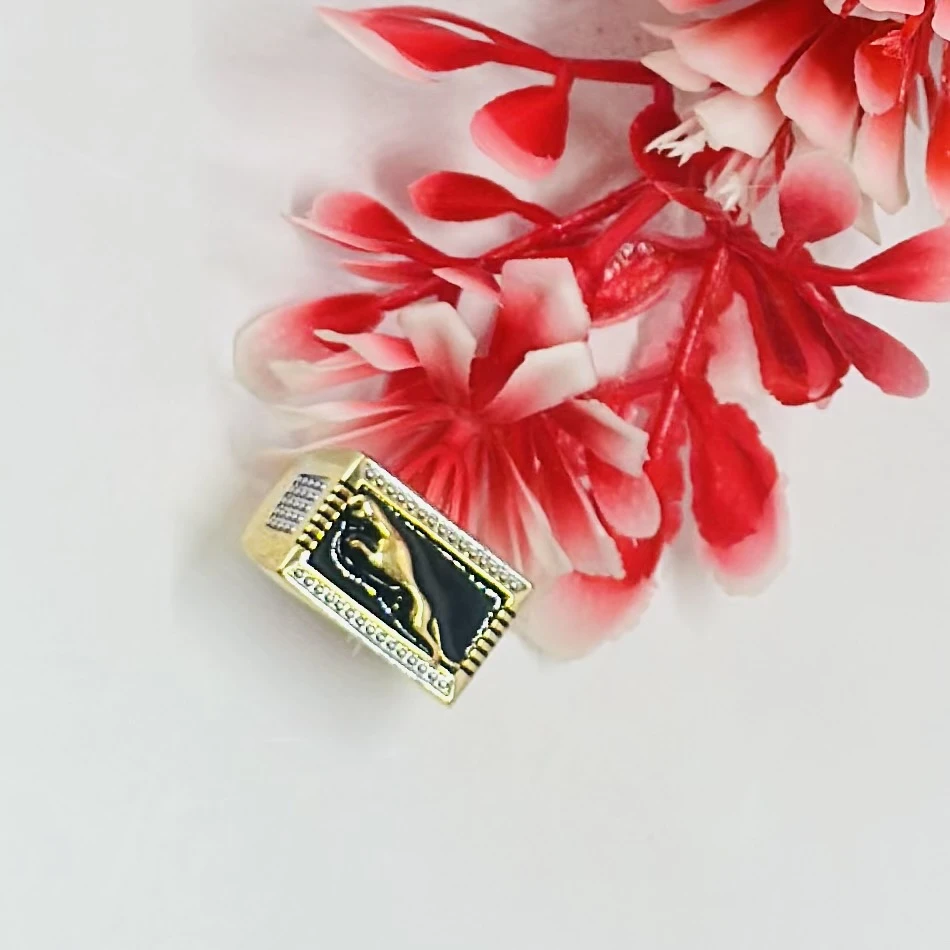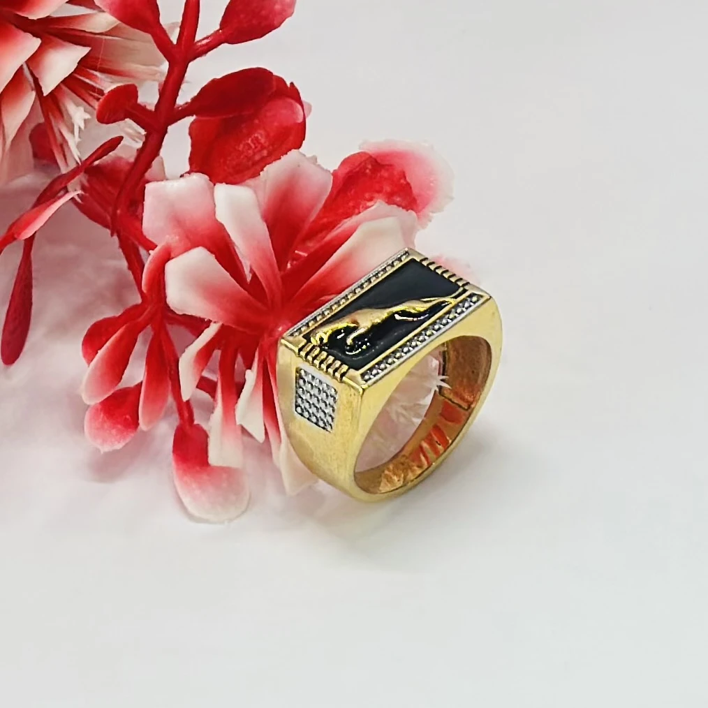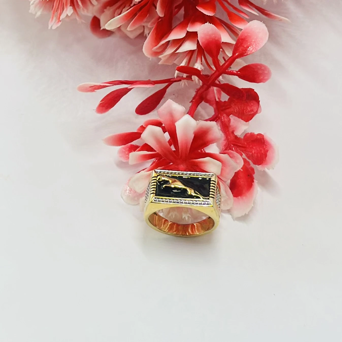 Gold plated men's ring featuring a jaguar design on a black antique background