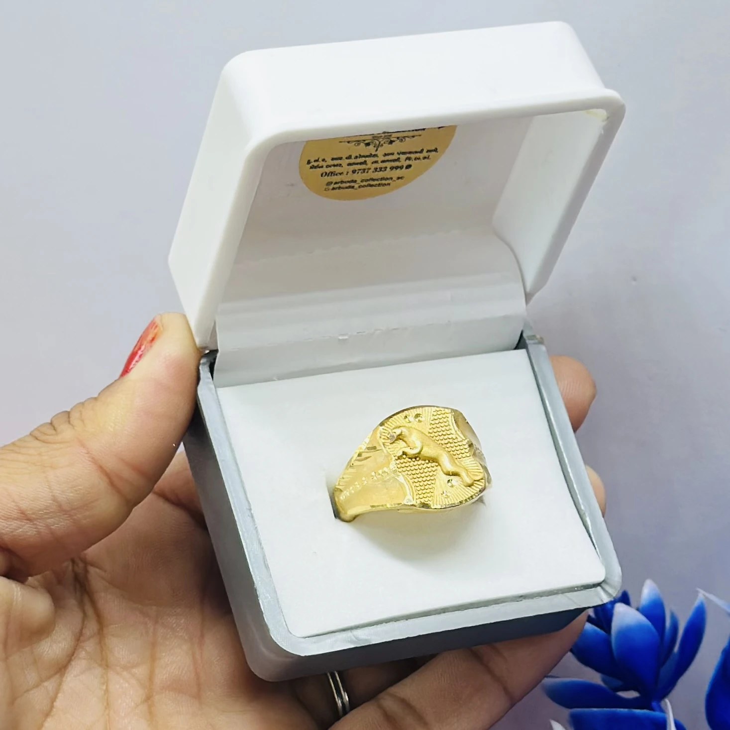 👉 Theme :- Gold plated men's ring with a square face featuring a grid of small, clear stones.