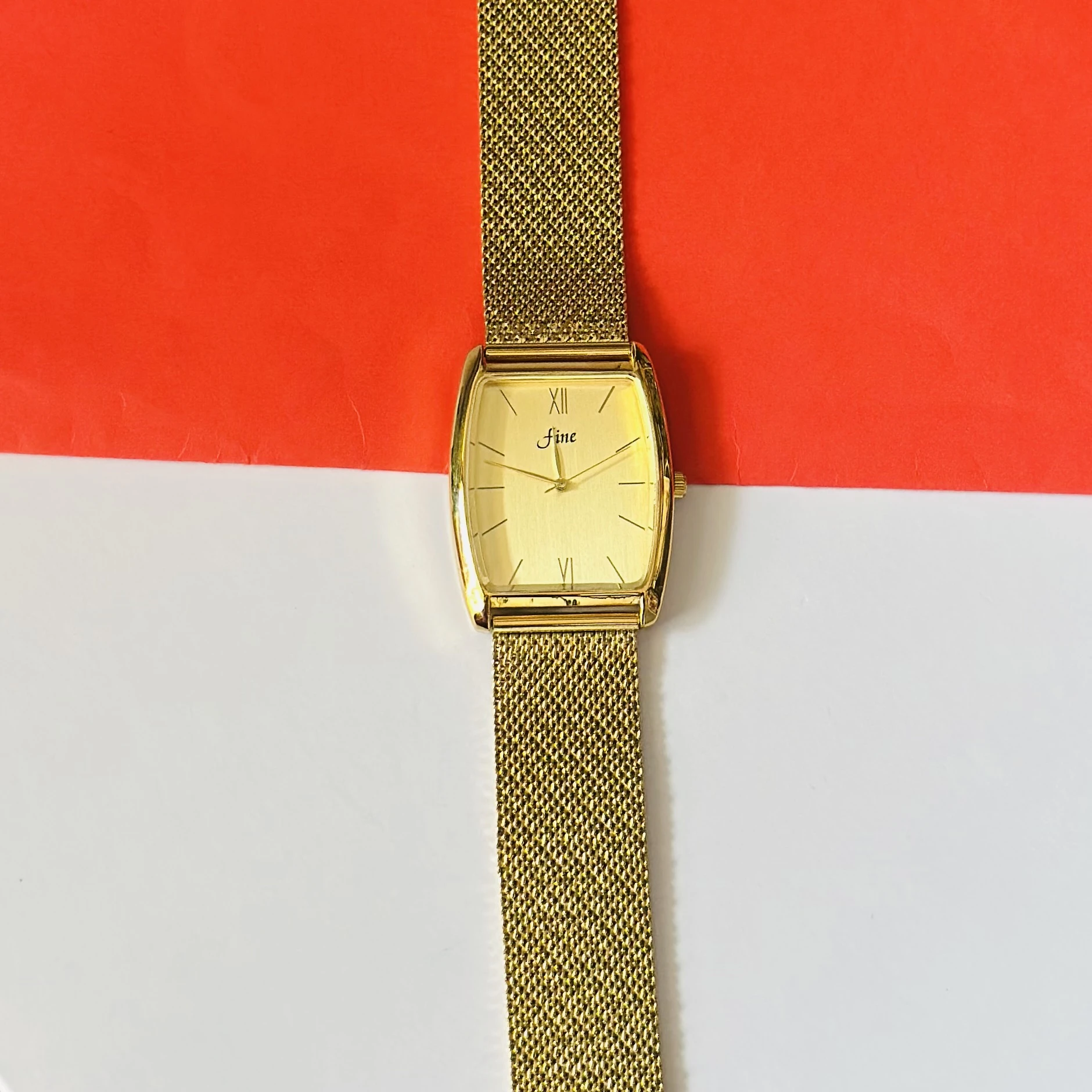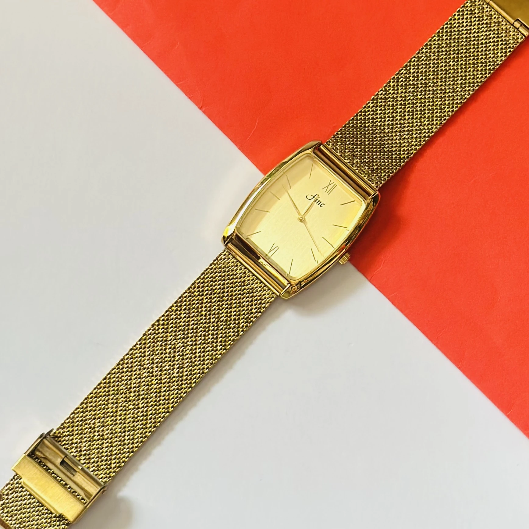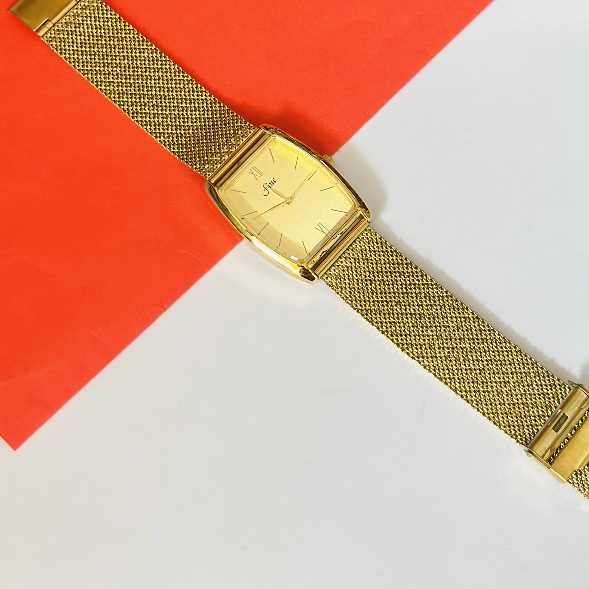 👉 Theme :- Gold plated quartz analogue watch with a mesh strap.
