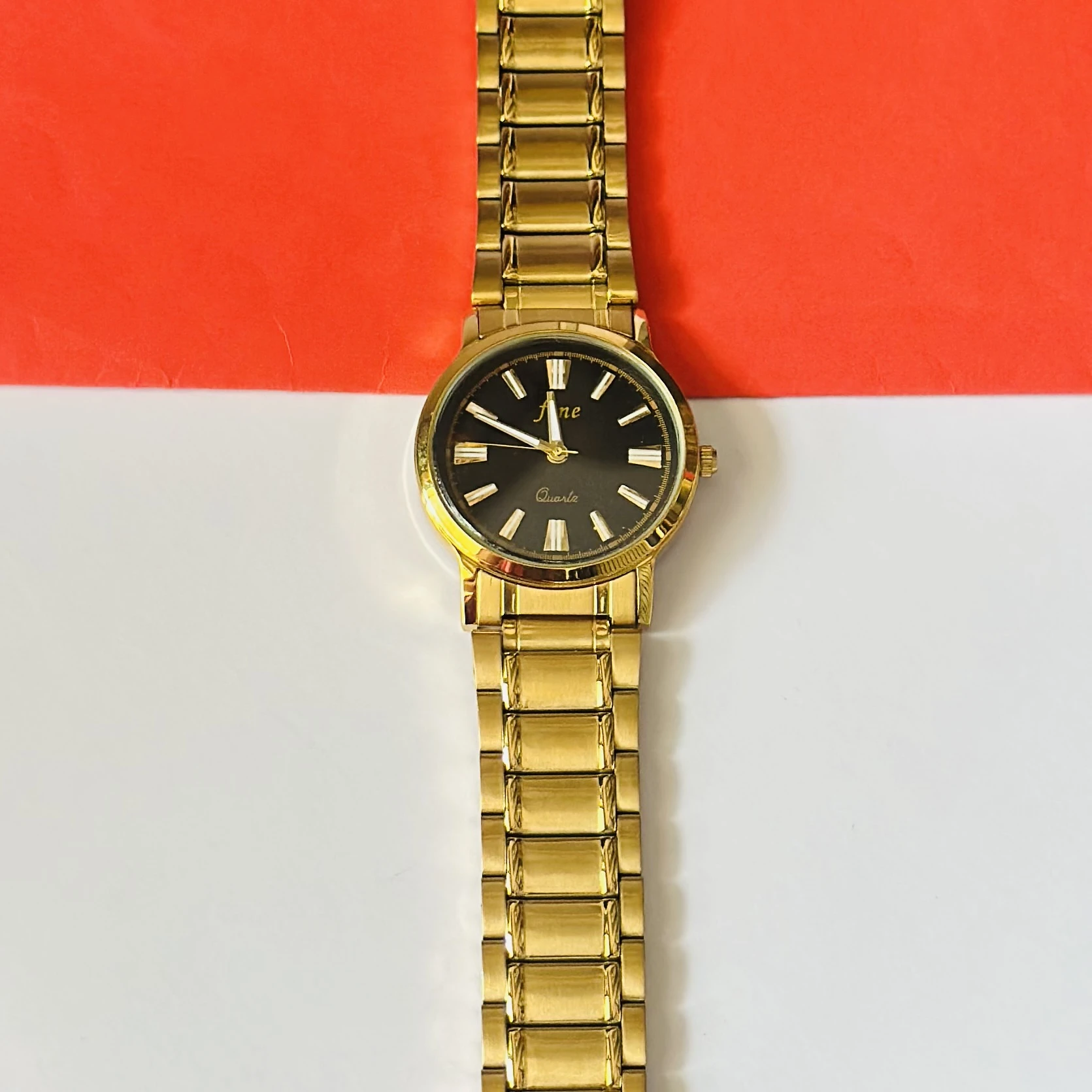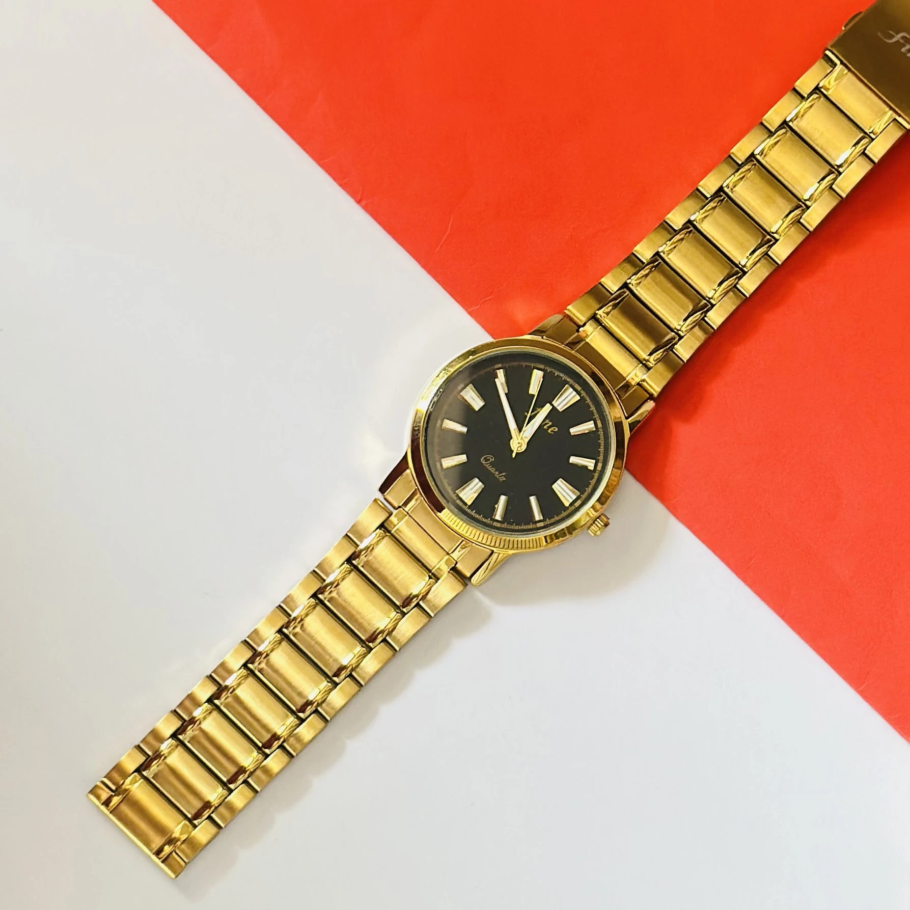 👉 Theme :- Gold plated stainless steel analog watch with a black dial.