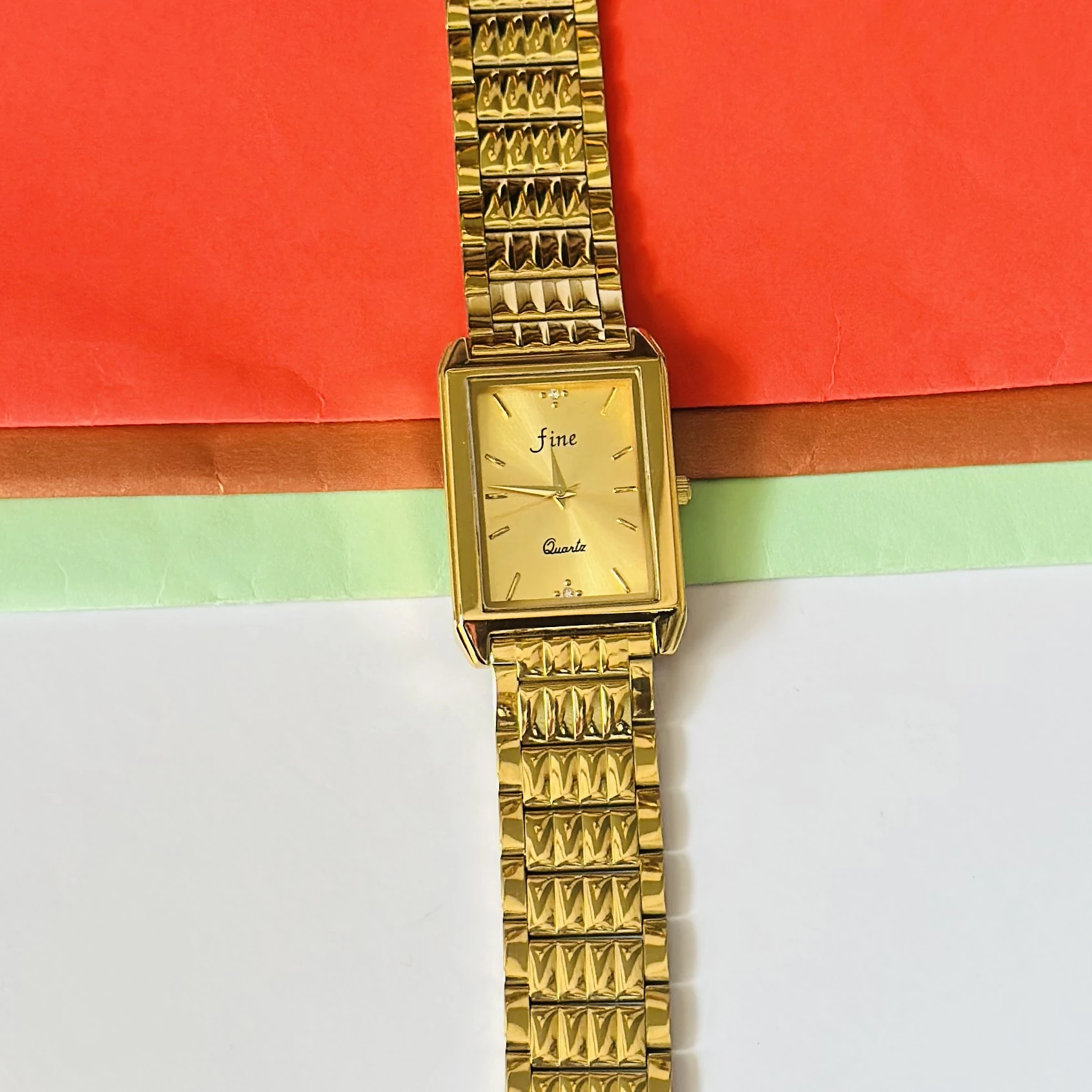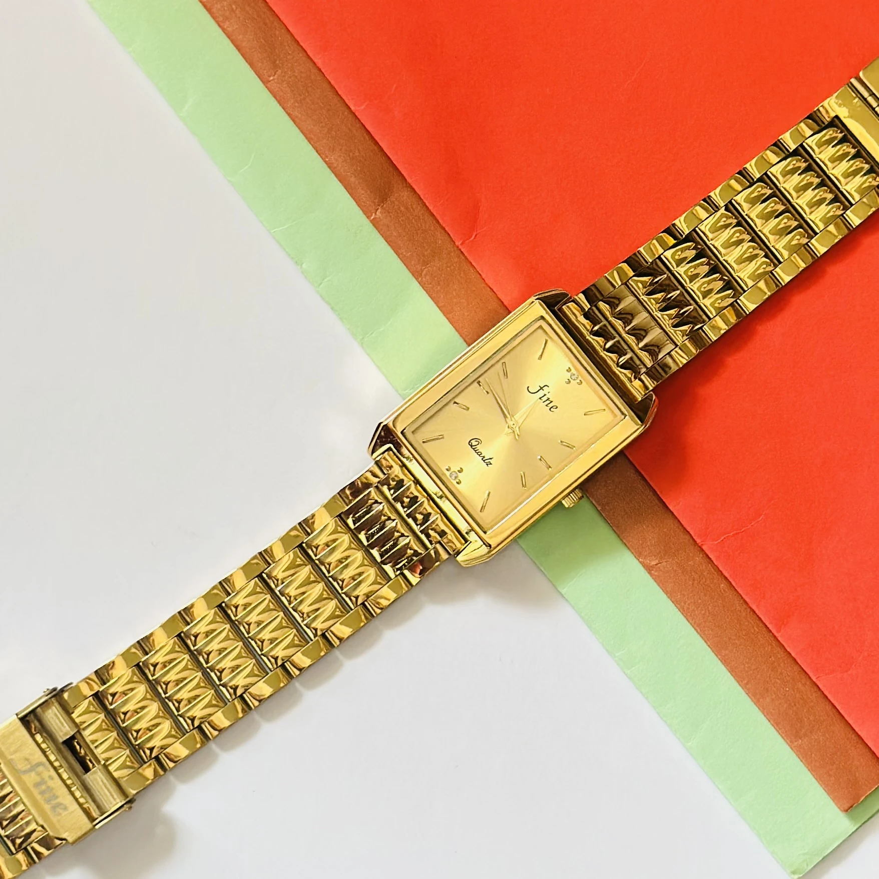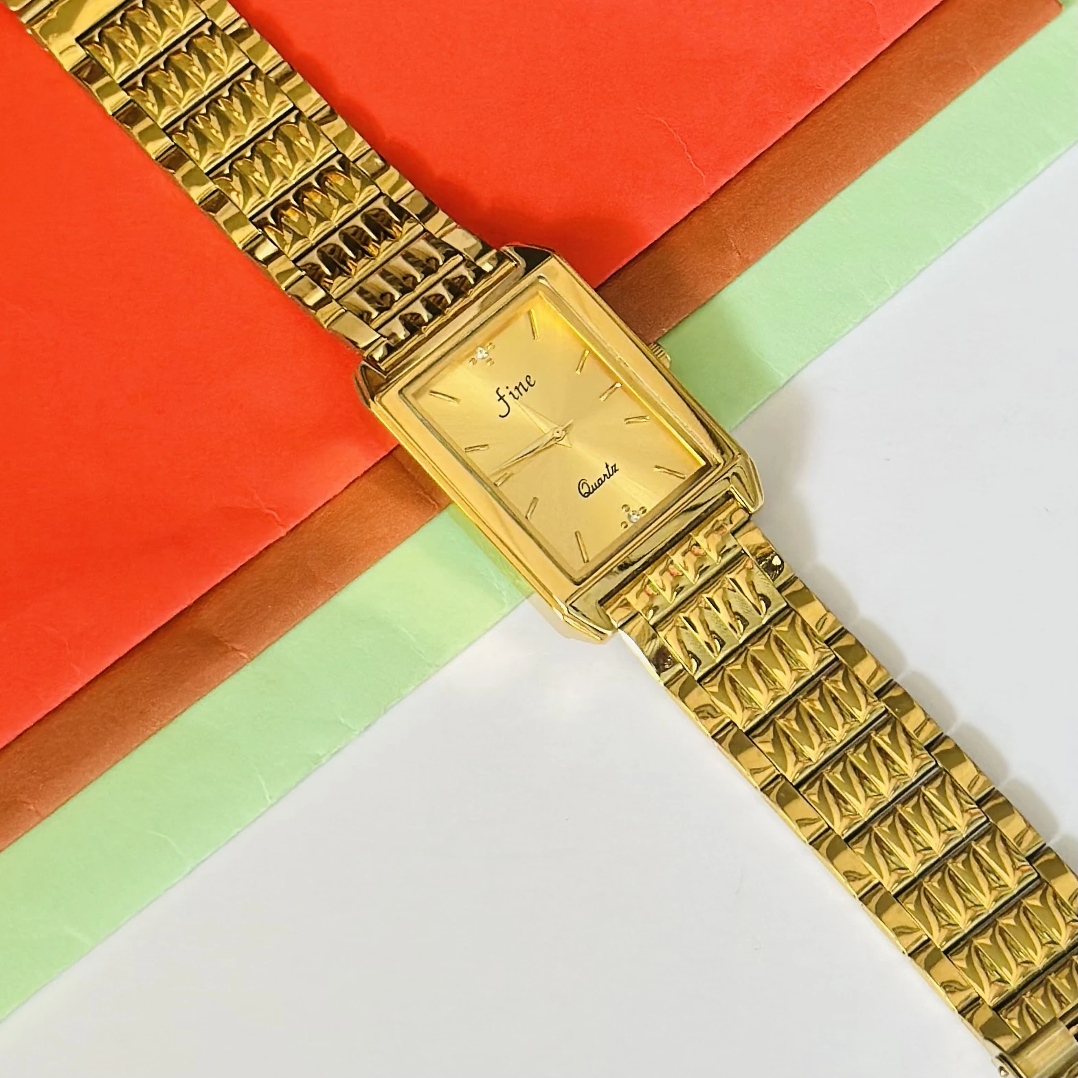 👉 Theme :- Gold plated stainless steel analogue quartz watch with a square case and a metal band