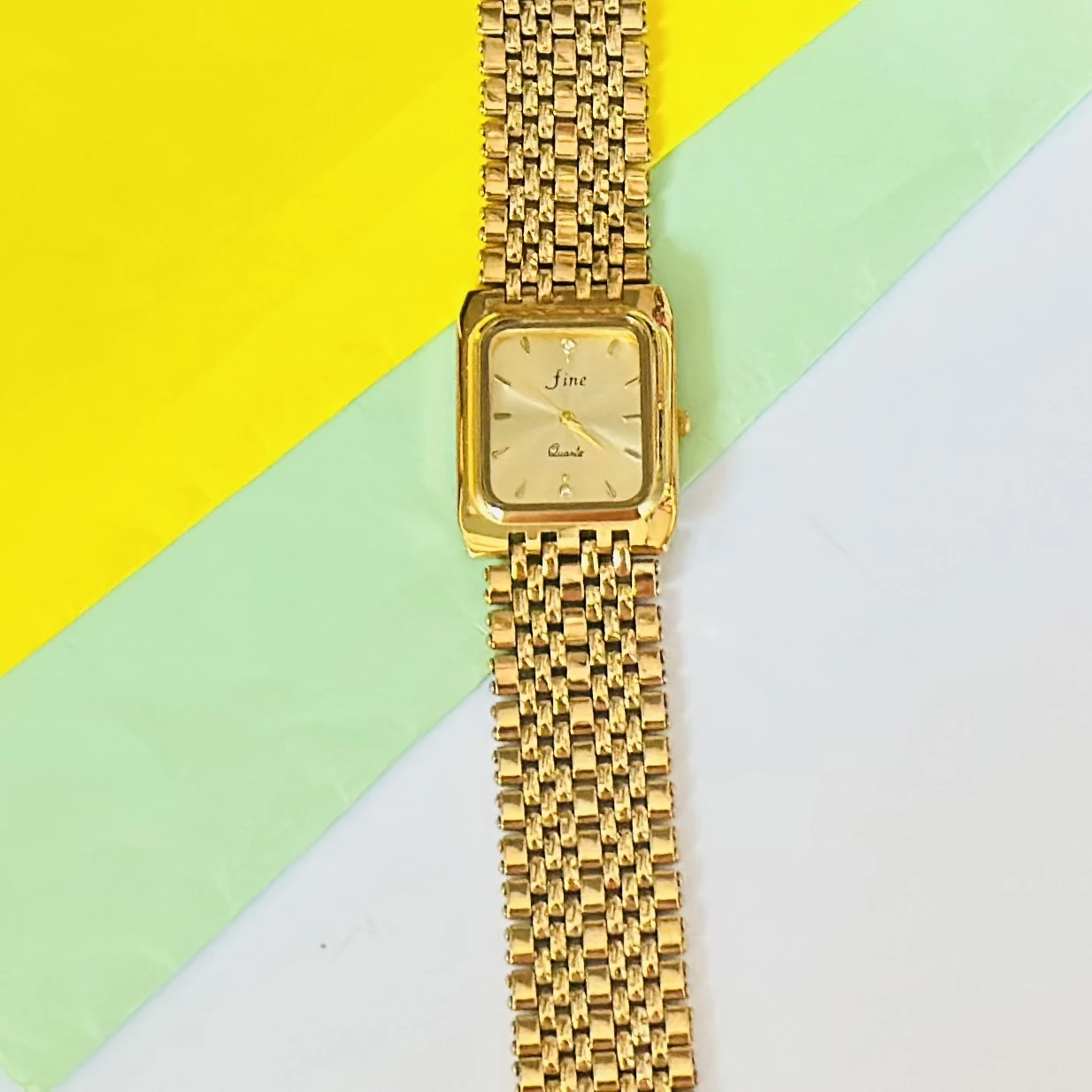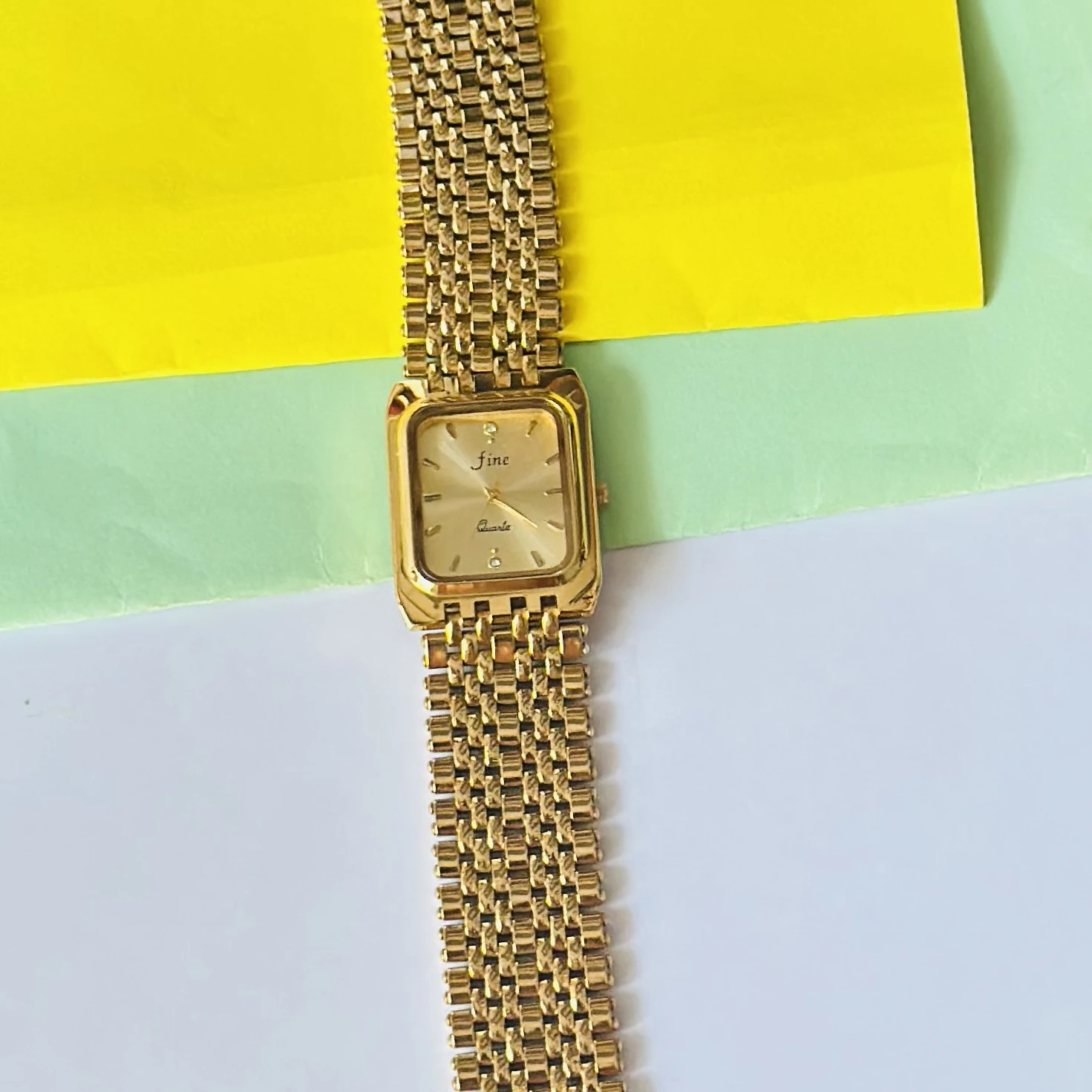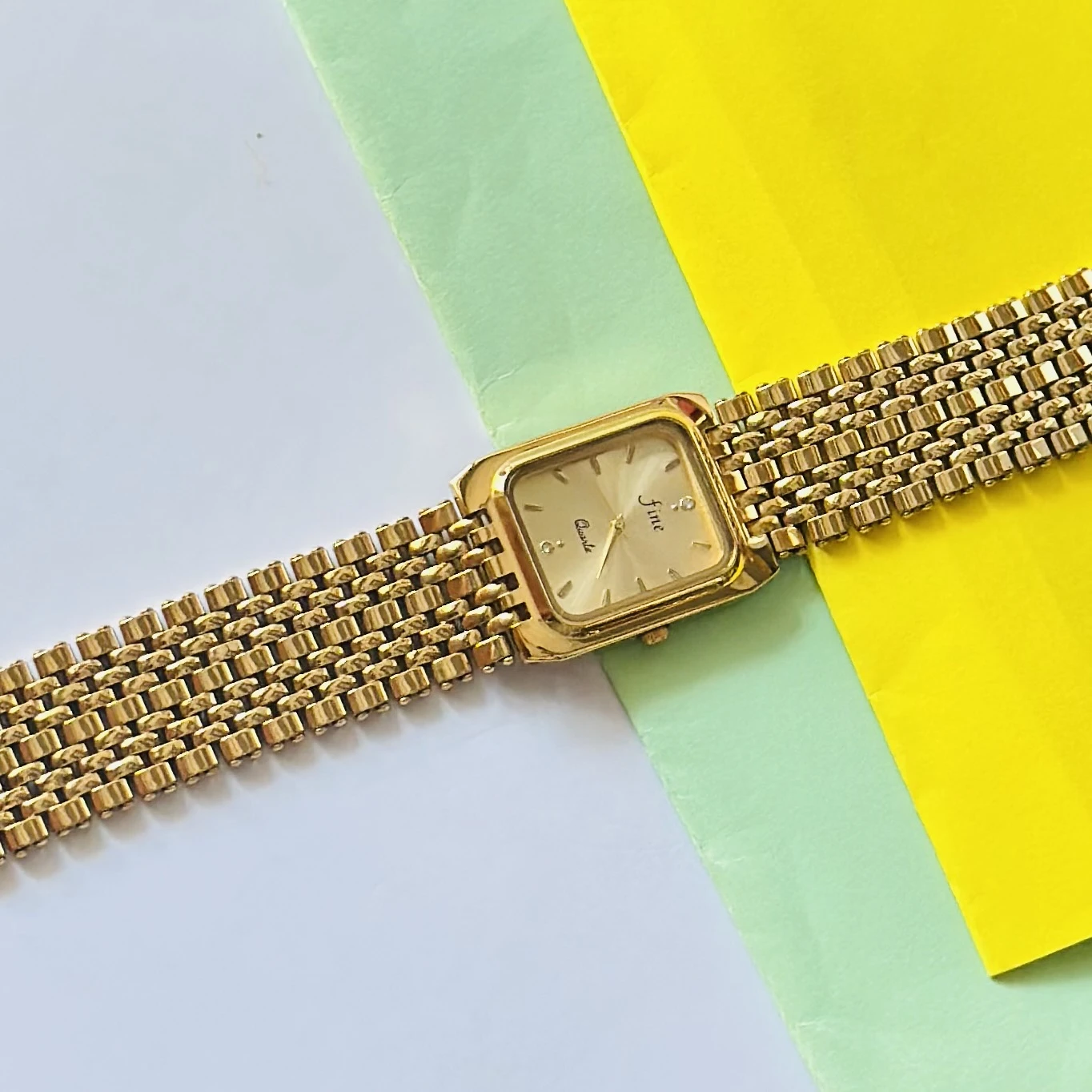 👉 Theme :- Gold tone analog quartz watch with a metal strap.
