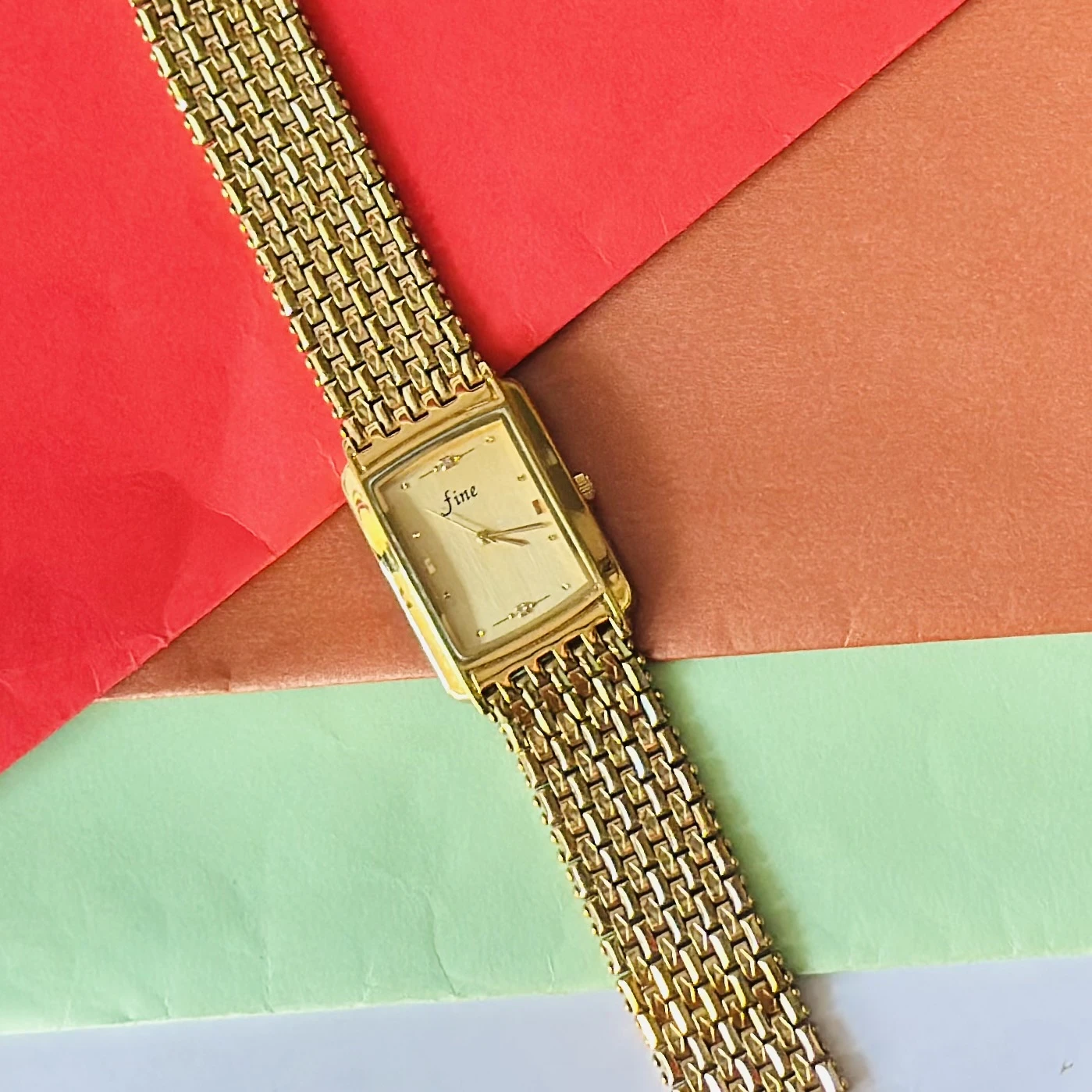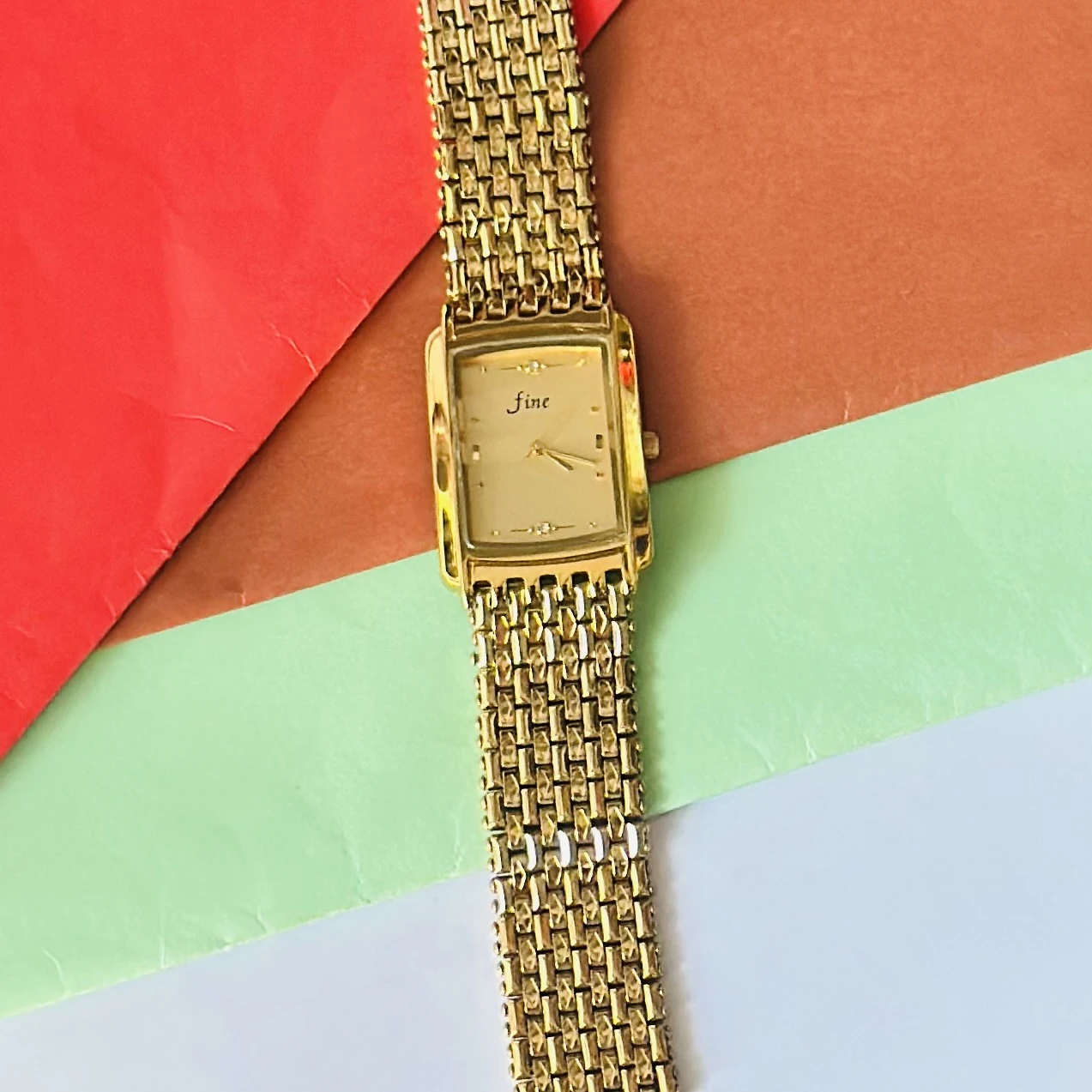 👉 Theme :- Gold tone analog quartz watch with a metal strap.