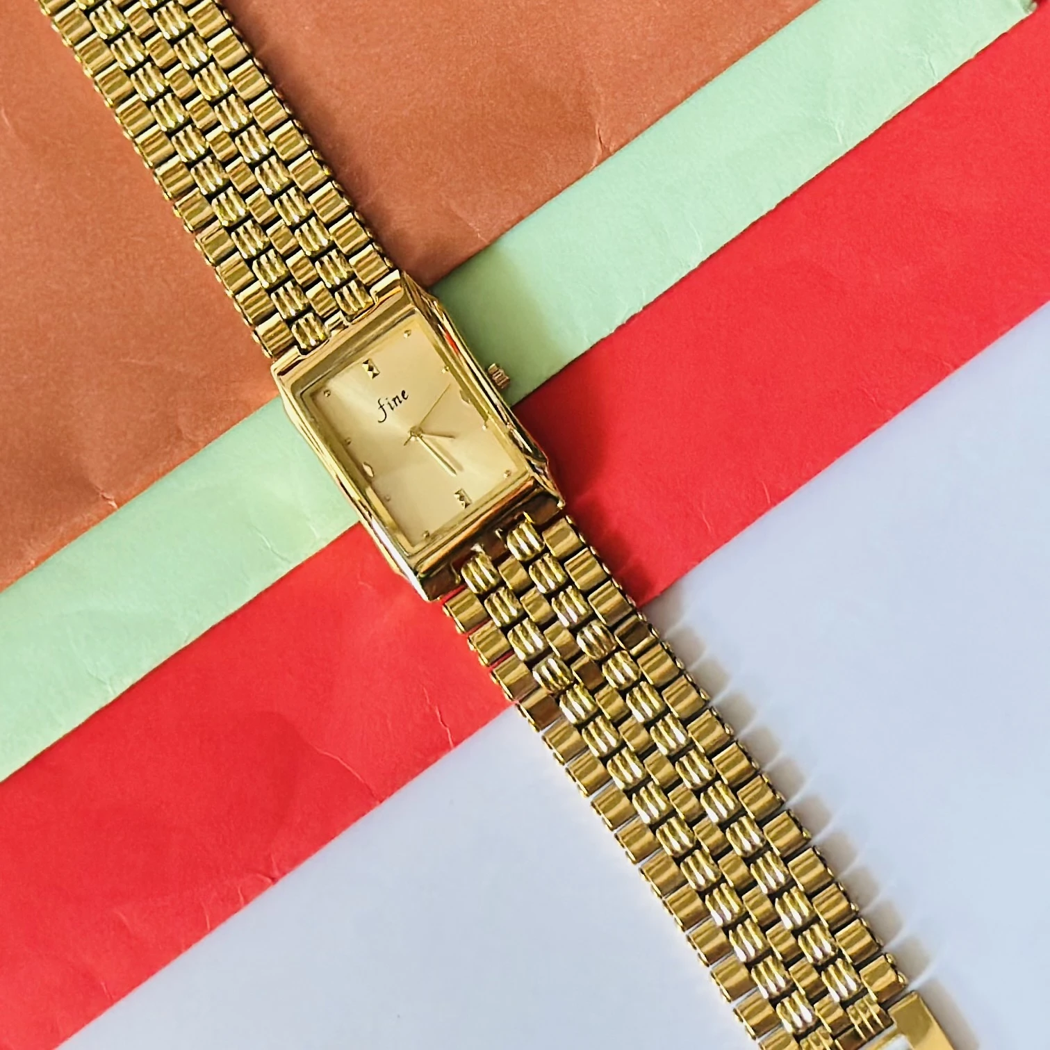 👉 Theme :- Gold tone analog quartz watch with a metal strap.