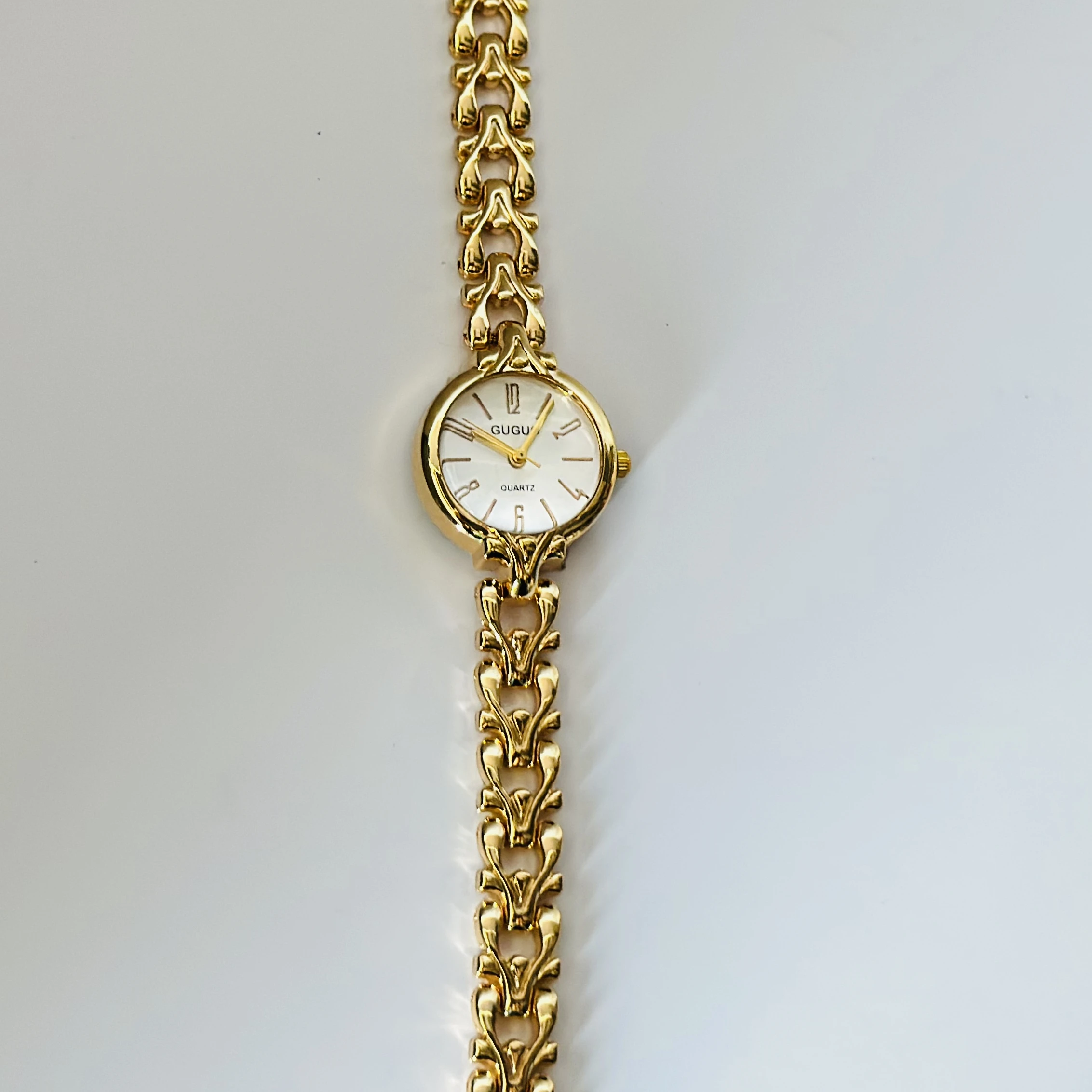 👉 Theme :- Gold tone "Gugu" quartz analog watch with a link bracelet.